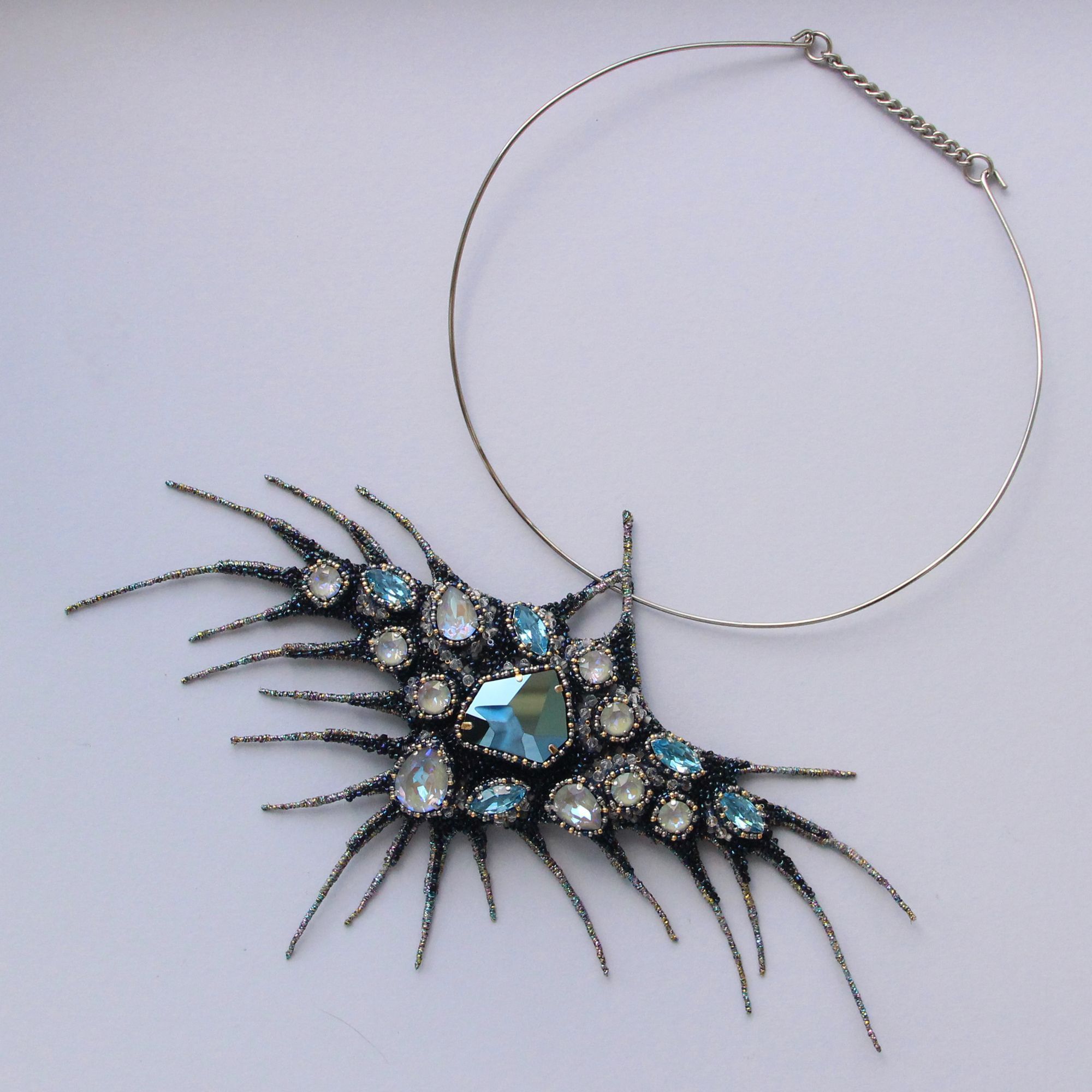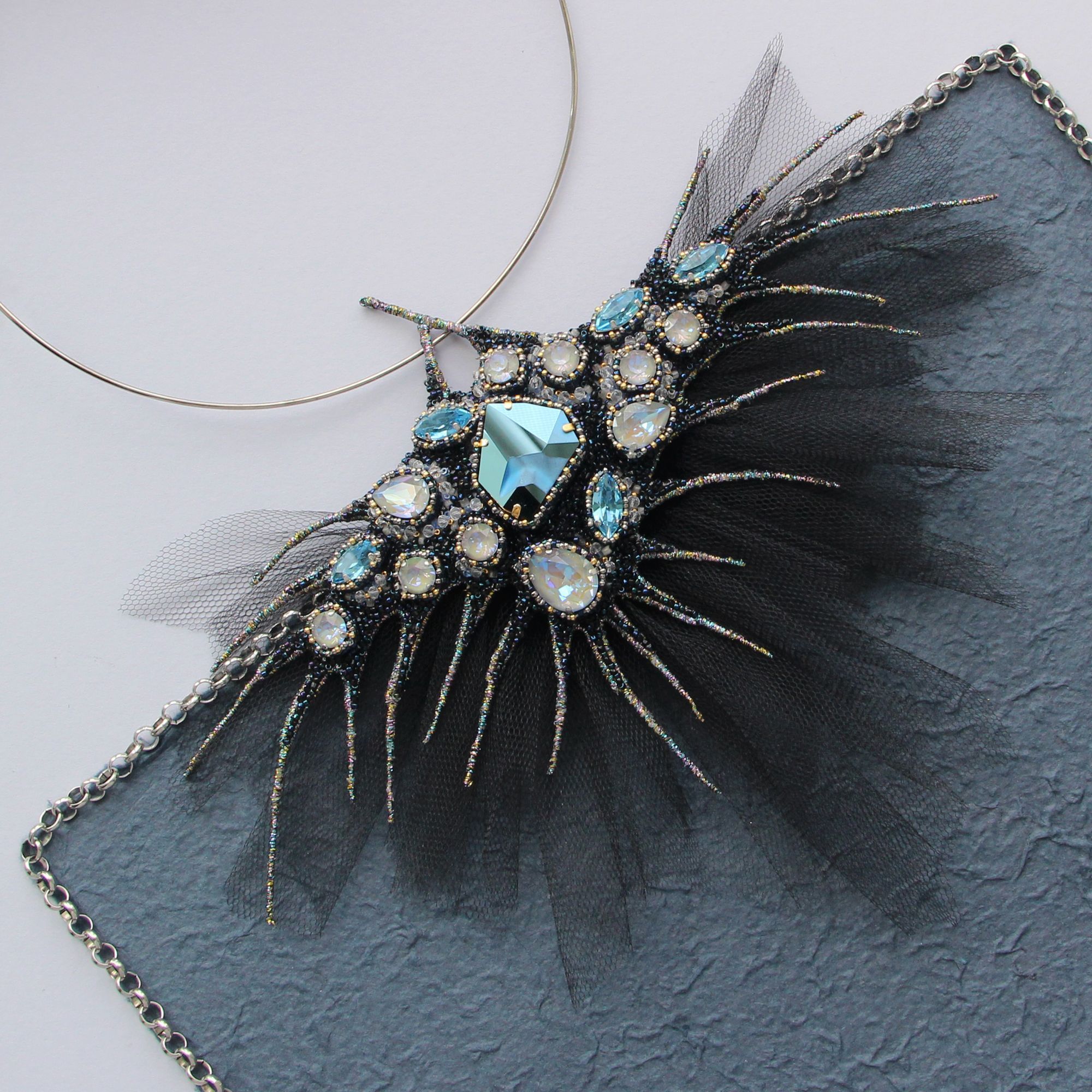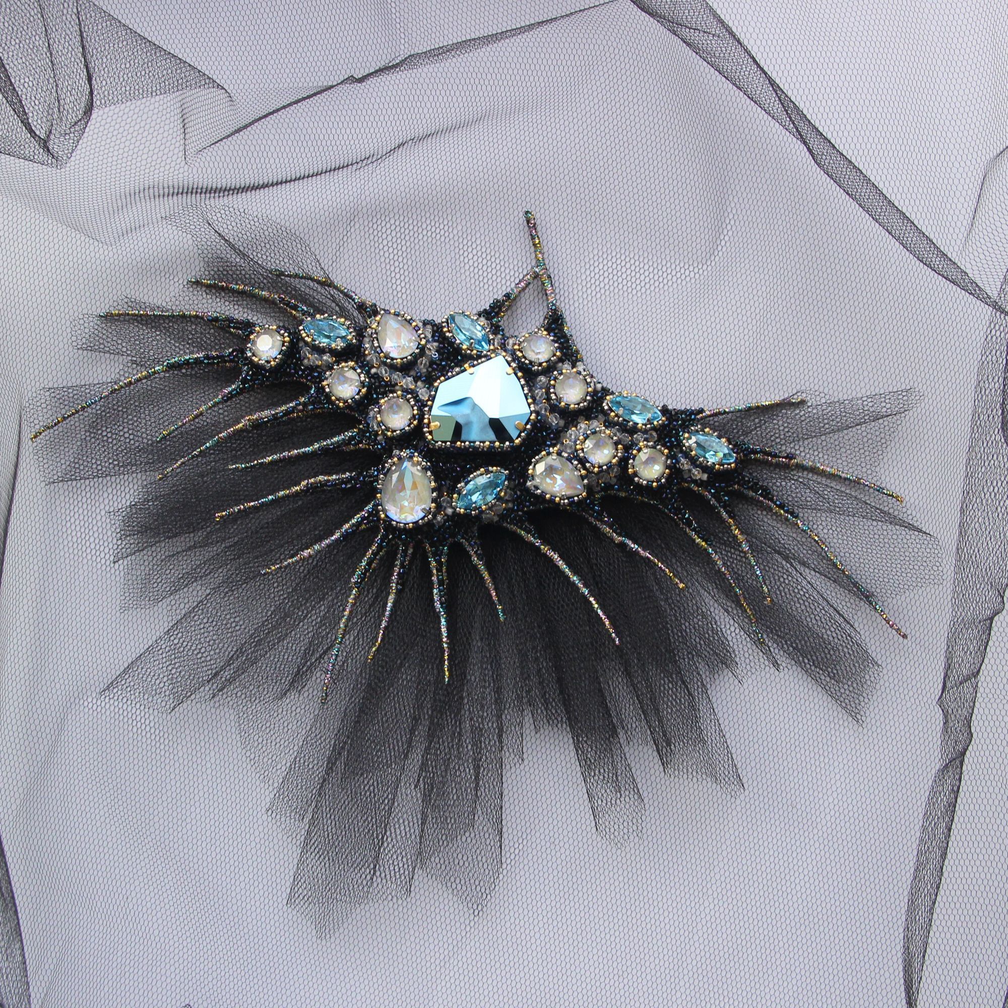 Я не люблю слепящий блеск, но кристаллы из новой коллекции Сваровски с их мягким переливом и элегантным сиянием как нельзя лучше легли на идею этой броши-трансформера. Деталь из сетки снимается и брошь можно использовать в другом стилистическом ключе. Также брошь носится и как подвеска.