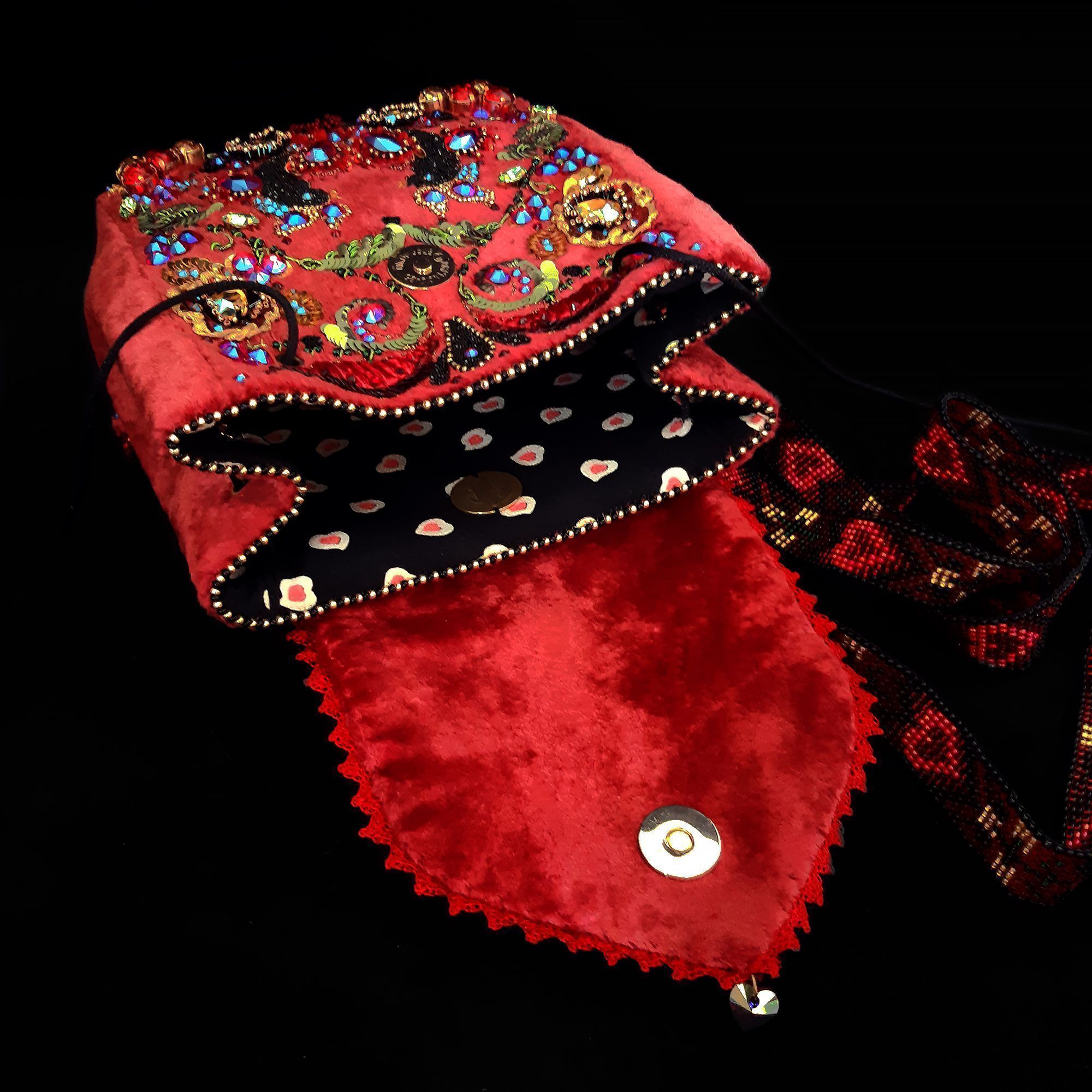 Основной идеей данной работы стала любовь к природе и народному творчеству. Я взяла за основу мотивы хохломской росписи и создала из них уникальный сюжет, который объединяет в себе как наше прошлое, так и наше настоящее. Современные материалы позволили поднять изобразительность на новый уровень, а множество кристаллов Сваровски добавляют богатства и сказочного мерцания.