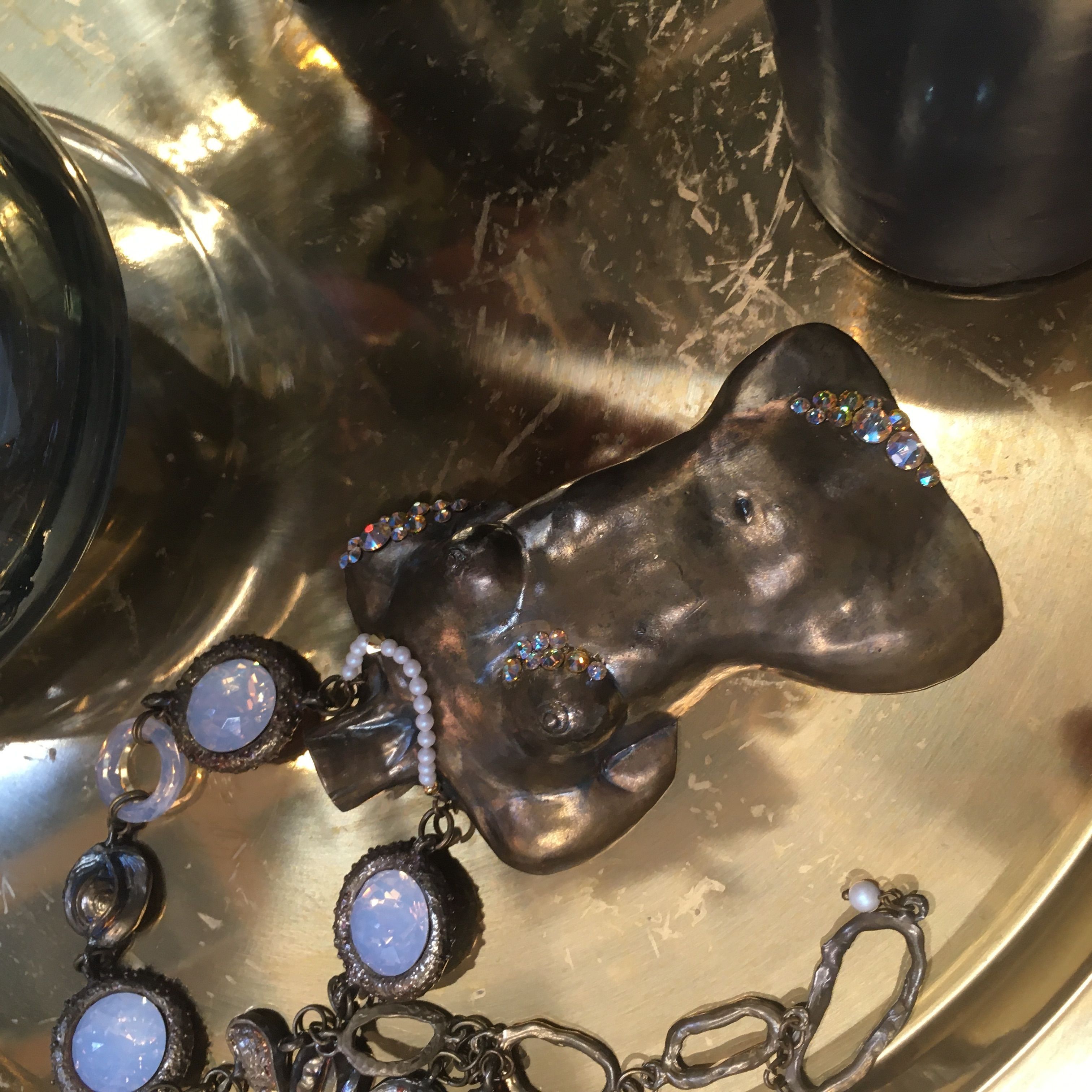 Колье выполнено из латуни и кристаллов Cosmic Ring, Dome Round Stonе,Xirius Rose, которые становятся словно бесконечно бездонными, играя светом и рефлексами цвета металла.