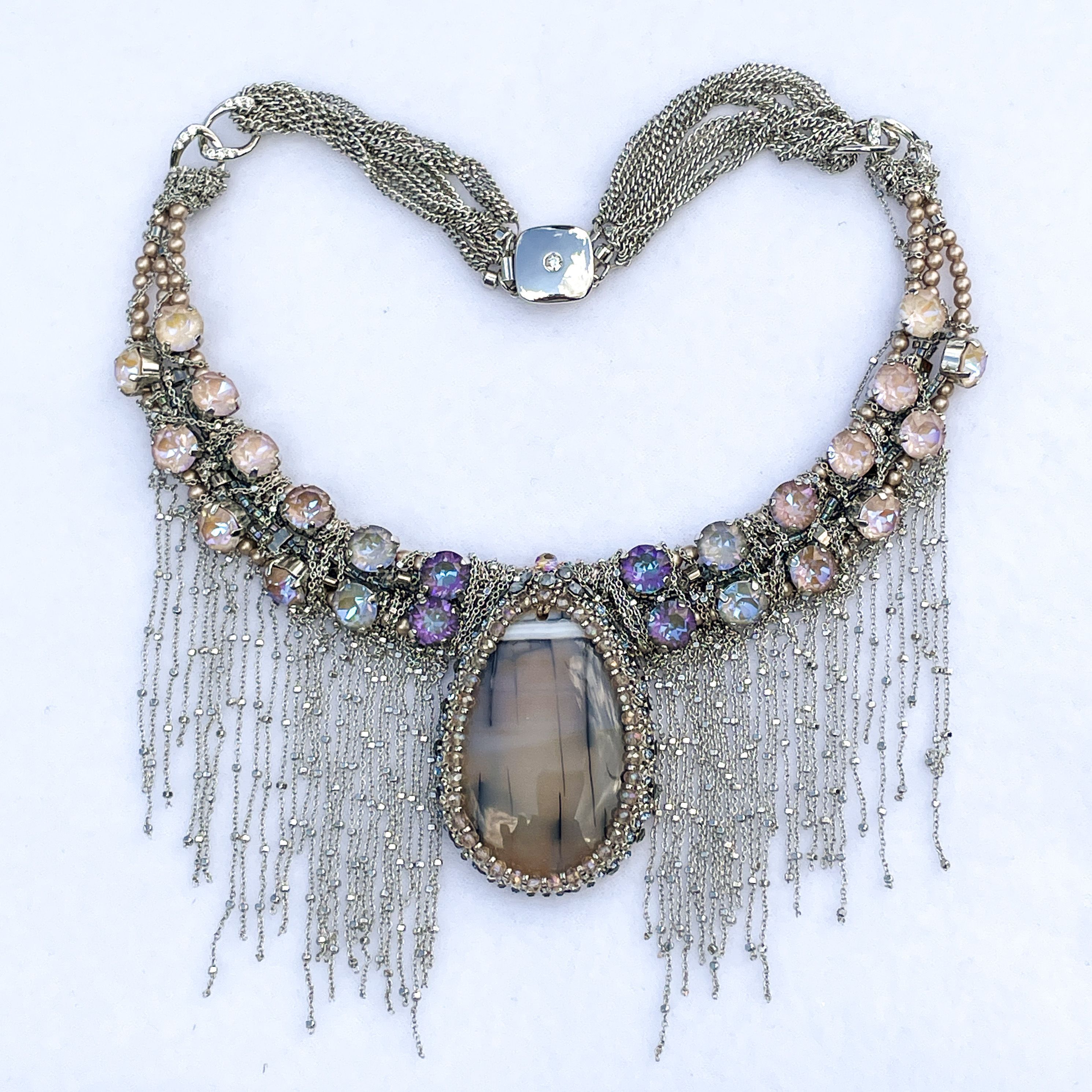 Мы всегда стоим перед выбором, и каждое наше действие запускает определённую цепочку событий. Так и в колье Crystal Vibes каждое наше движение, наклон или поворот, повторяется в бликах кристальных граней и в струящихся утонченных цепочках. Нежнейший градиент приглушённых тонов кристаллов, повторяющийся лейтмотивом в центральном элементе, подчёркивает изысканный аристократичный вкус обладательницы этого колье: она словно снизошла к нам прямо посреди королевского приема, ее образ дополняет высокий парик, веер и платье с открытым декольте и сотнями слоёв пышных юбок.