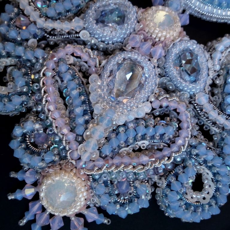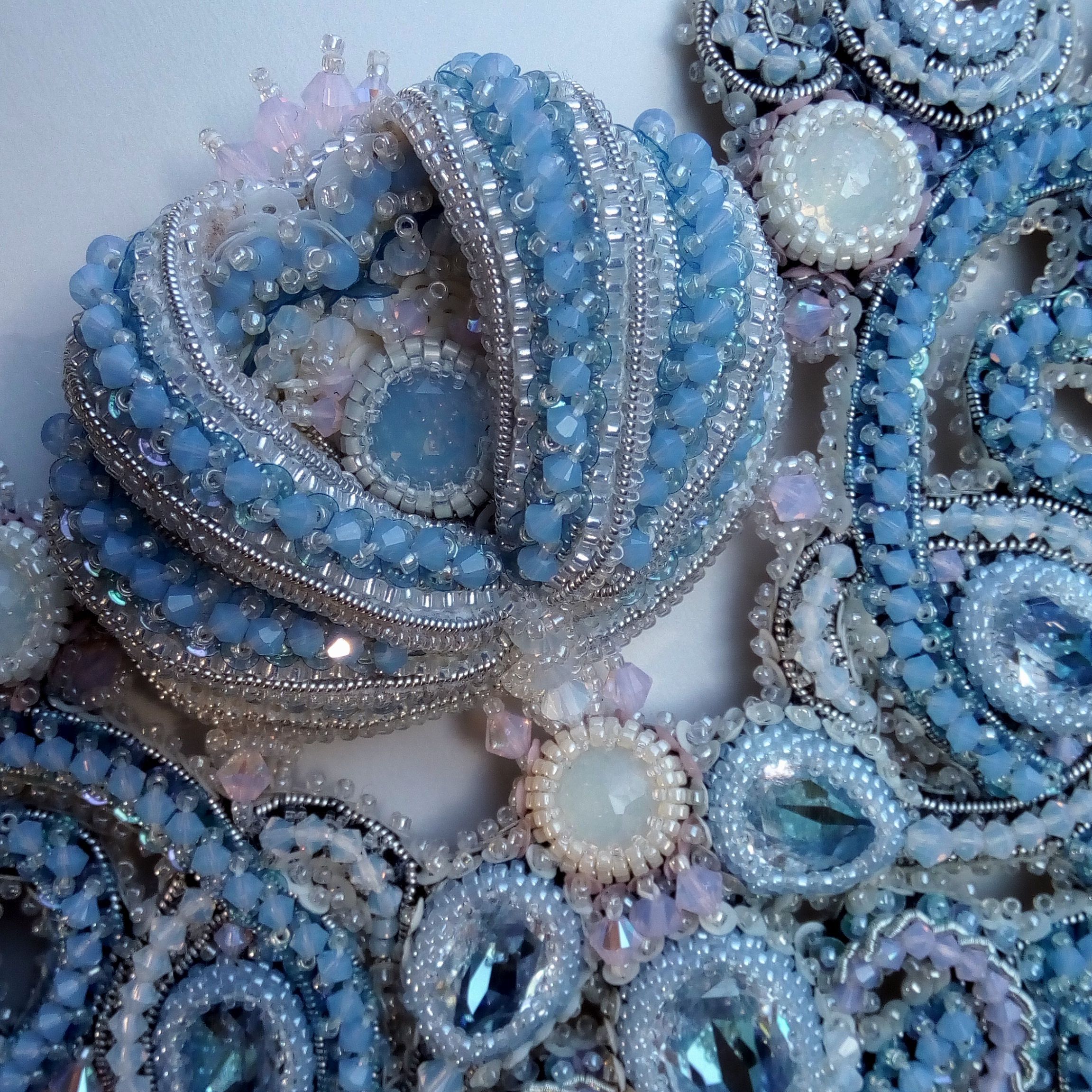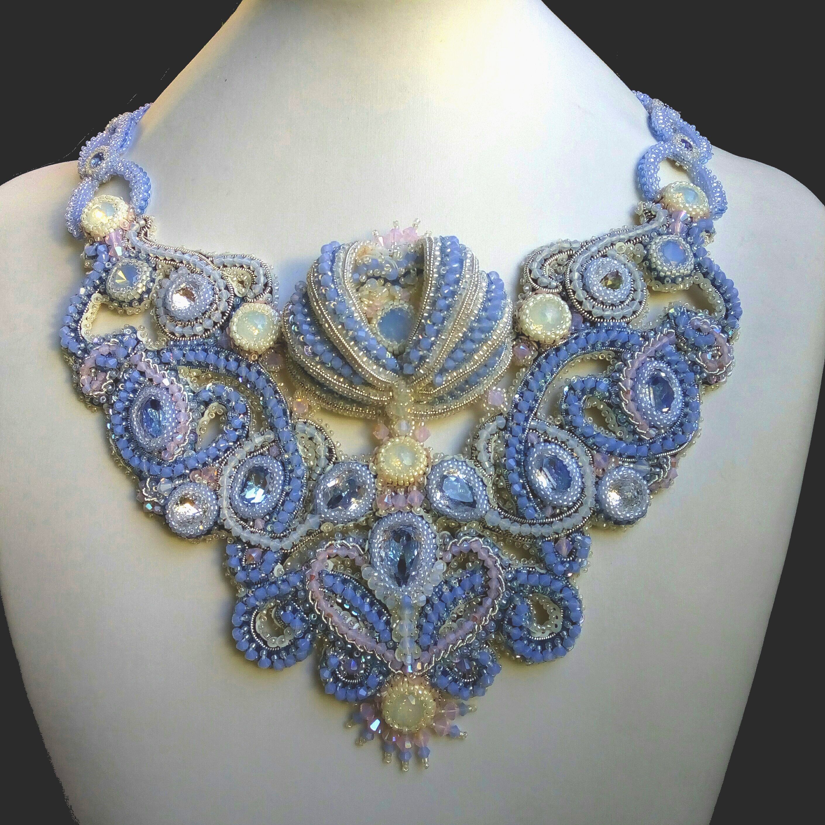 Мне не хотелось делать колье полностью в розовом цвете, поэтому для исполнения своей работы я выбрала самые традиционные свадебные оттенки: голубой, розовый и белый.