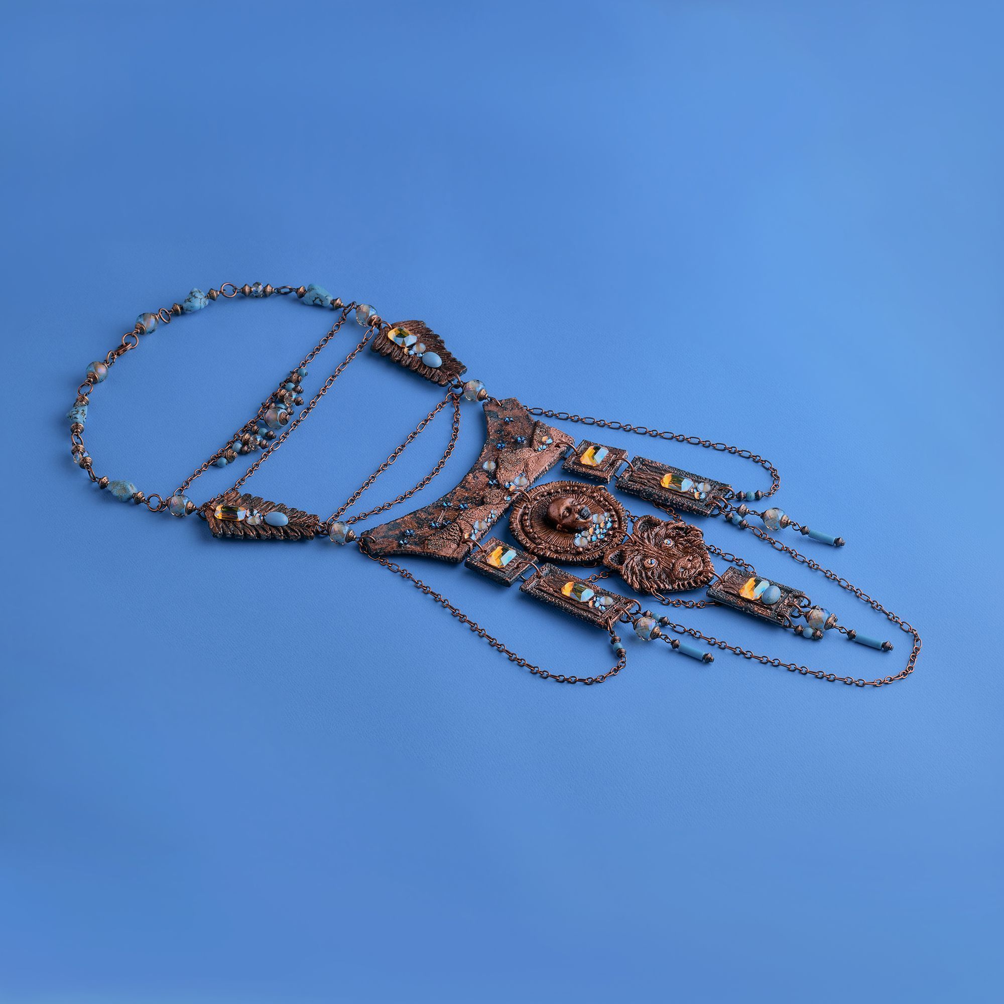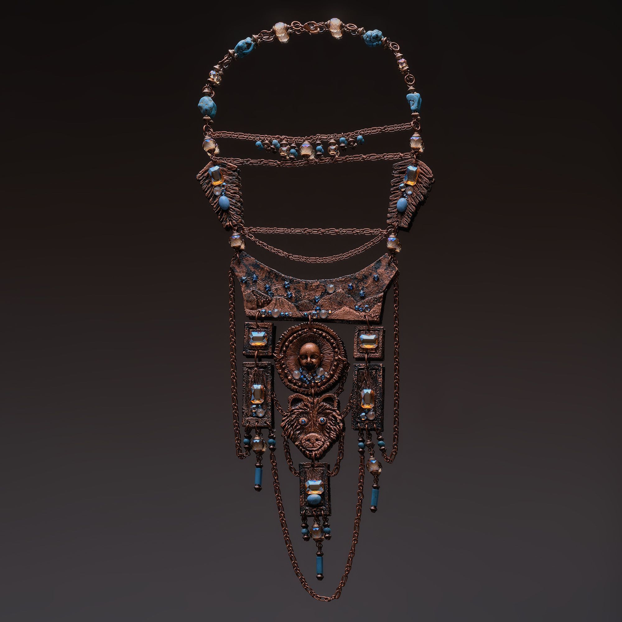 В колье использовано много голубого цвета (как в камнях, так и в оттенках кристаллов Сваровски) - традиционного для айнских украшений. Поздние исторические украшения создавались Айну по принципу центральной симметрии, из подручных материалов, бросовых китайских бусин и безделушек, которые им часто завозили, как туземцам. В украшениях часто присутствовал металл, отличительные геометрические формы - большие металлические круги в центре, многослойность, нагромождение, круглые бусины. Все эти принципы построения я постаралась отразить в своём украшении.