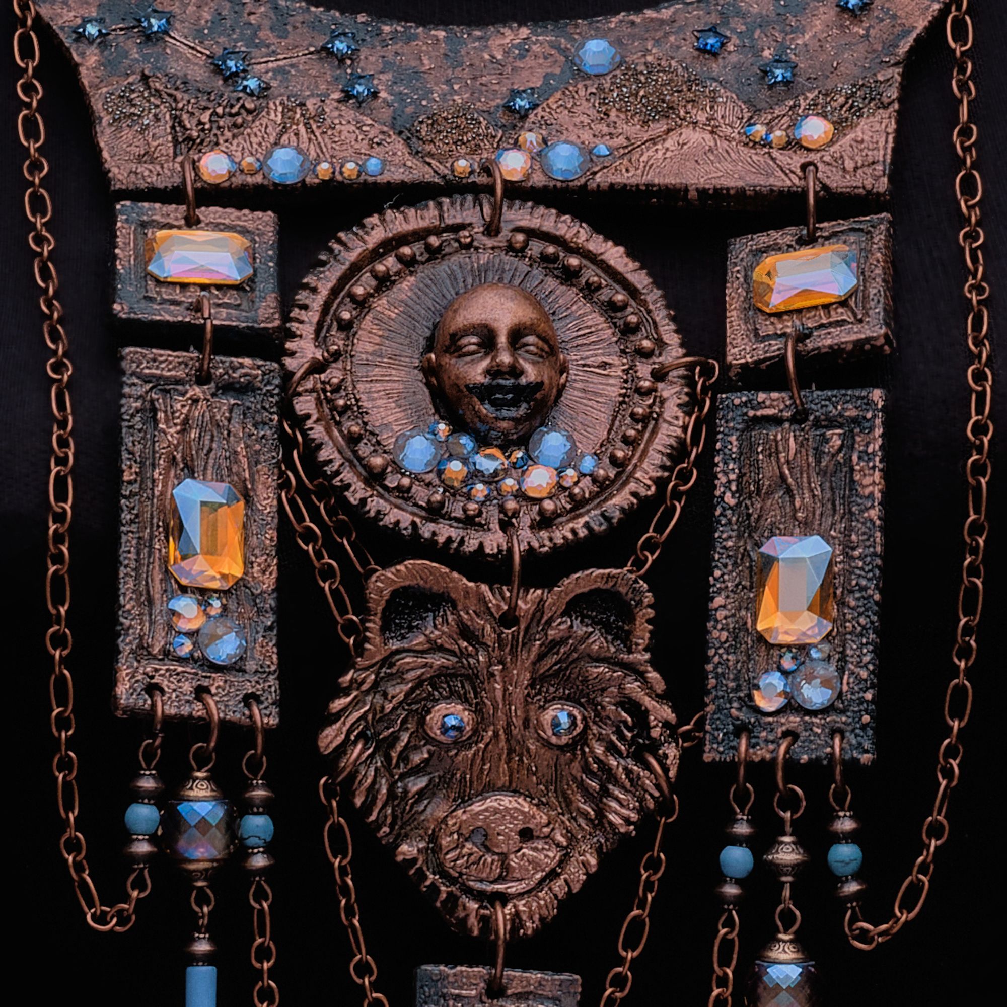 Именно поэтому на планке украшения изображен силуэт сахалинских сопок, звёздное небо, ковш Большой Медведицы, традиционные для сахалинских лесов папоротники. В центре колье кроме самой женщины Айну, голова медведя - у народности процветал культ поклонения этому животному.