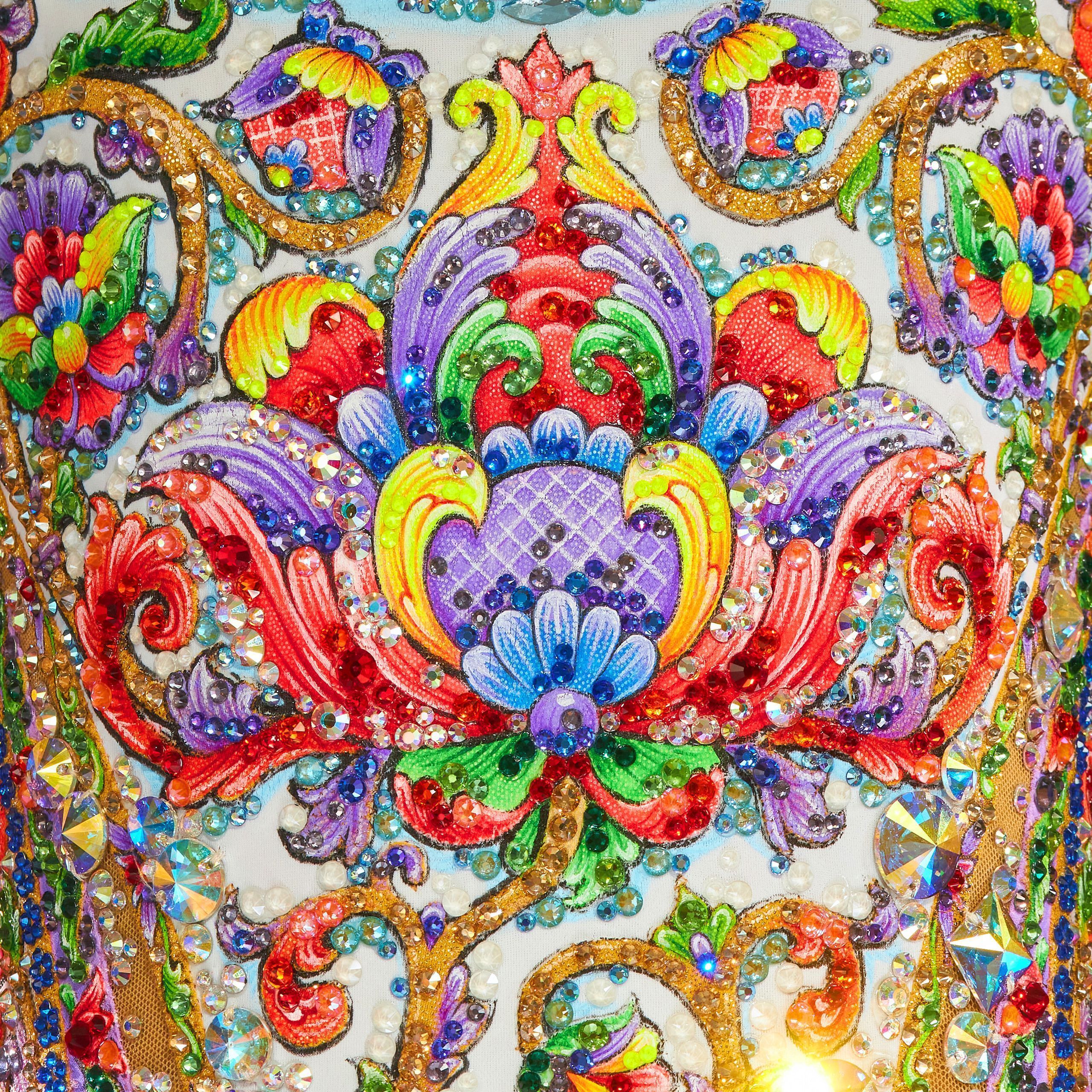 Узором на купальнике мы постарались передать зарождение цвета и всю необъятную многогранность красок. Вот из крохотного ростка распускается роскошный бутон, чьи лепестки сияют лавандовыми, травянисто-зелёными, солнечно-жёлтыми, лиловыми и пурпурными оттенками. На их глянцевой, эмалированной поверхности звёздным вихрем проносятся серебристые завитки. За одним цветком появляется второй и третий, четвёртый…