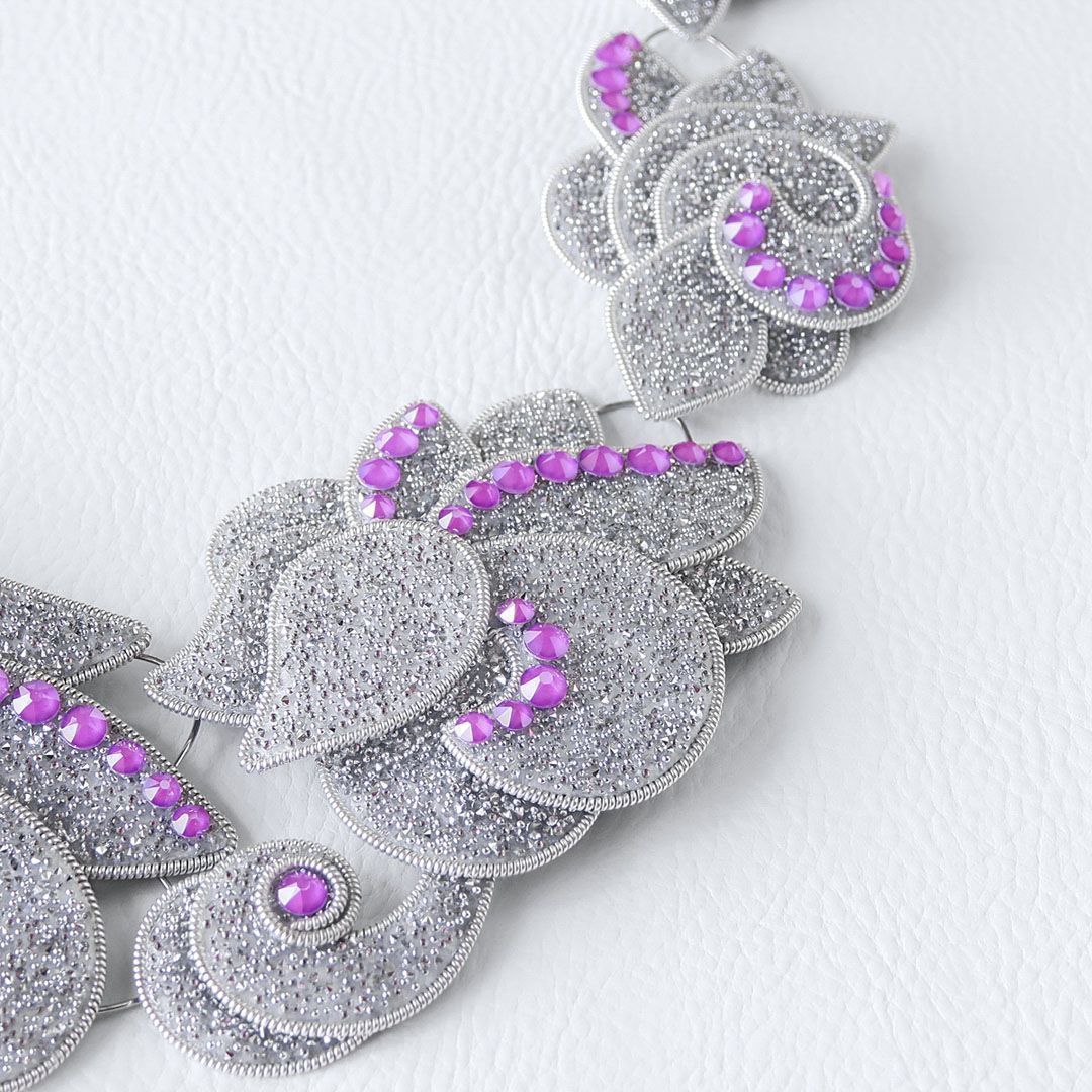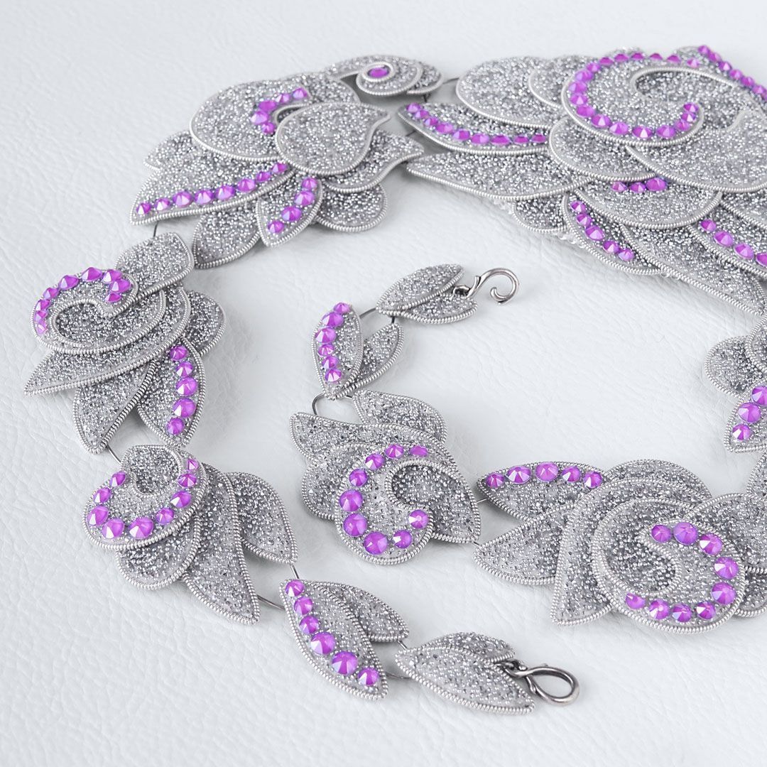 Колье состоит из 11 подвижных элементов, которые собраны более чем из 70 крохотных деталей, выполненных из кристальной ткани .evoli. И на этом «холсте» проявляются первые крупицы и расцветают «робкие ростки» зарождающейся идеи, воплощённые с помощью кристаллов Electric Violet, и как нельзя лучше иллюстрирующие основную мысль этой работы.