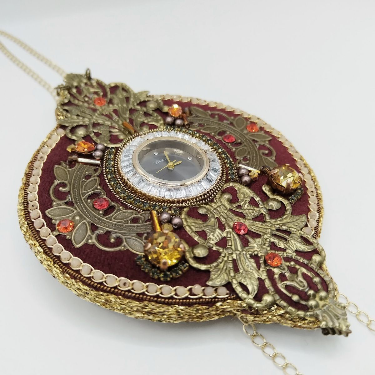 ЧАСЫ в винтажном стиле, на ходу. Можно подводить время и менять батарейку. В работе использован бархат, которому полвека. Новогодний набор "Сказка зимнего рассвета" использован частично.