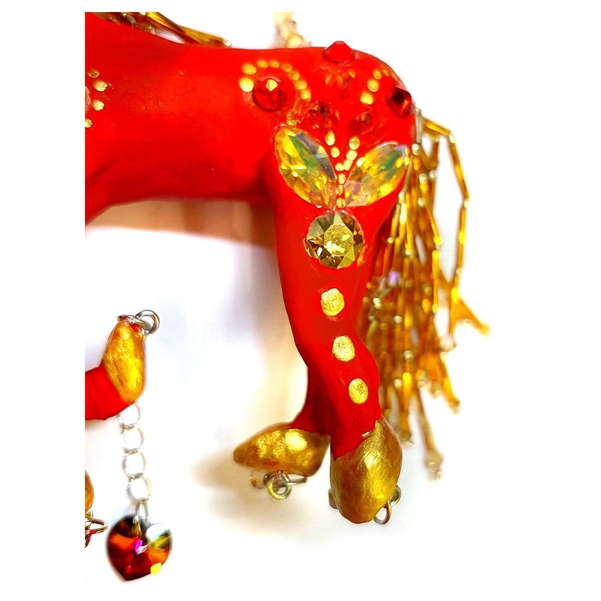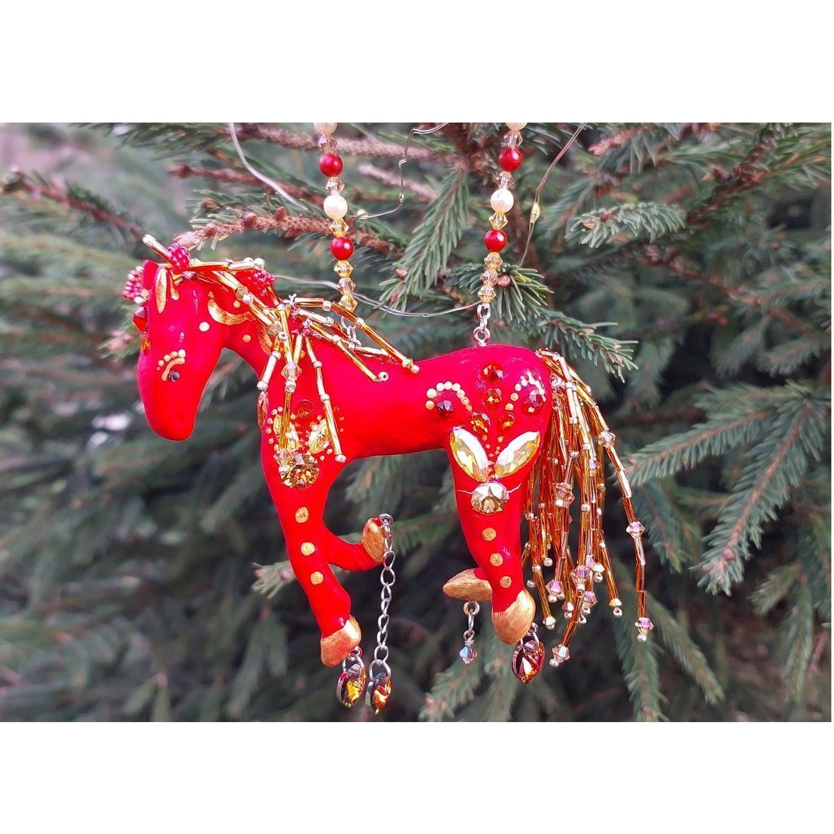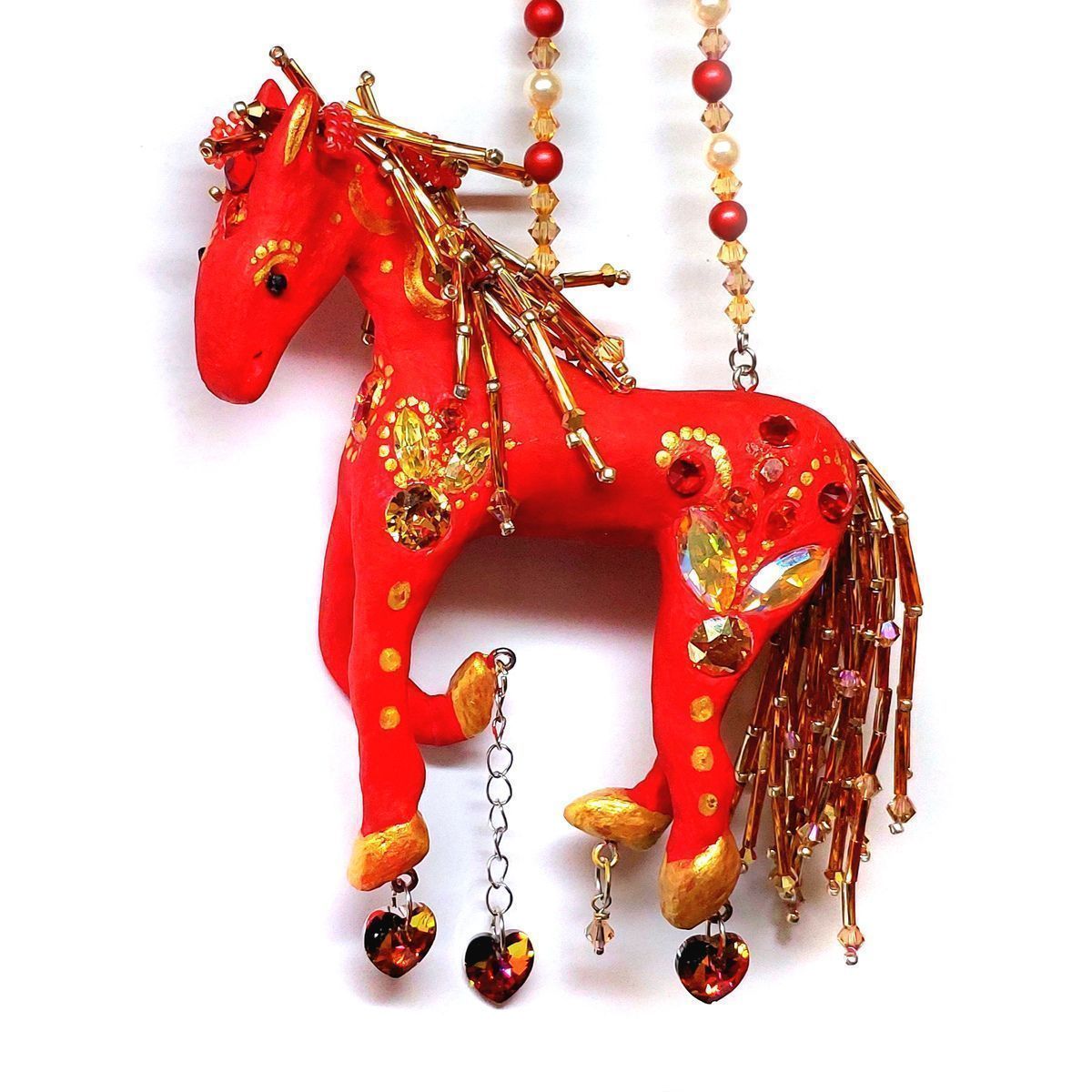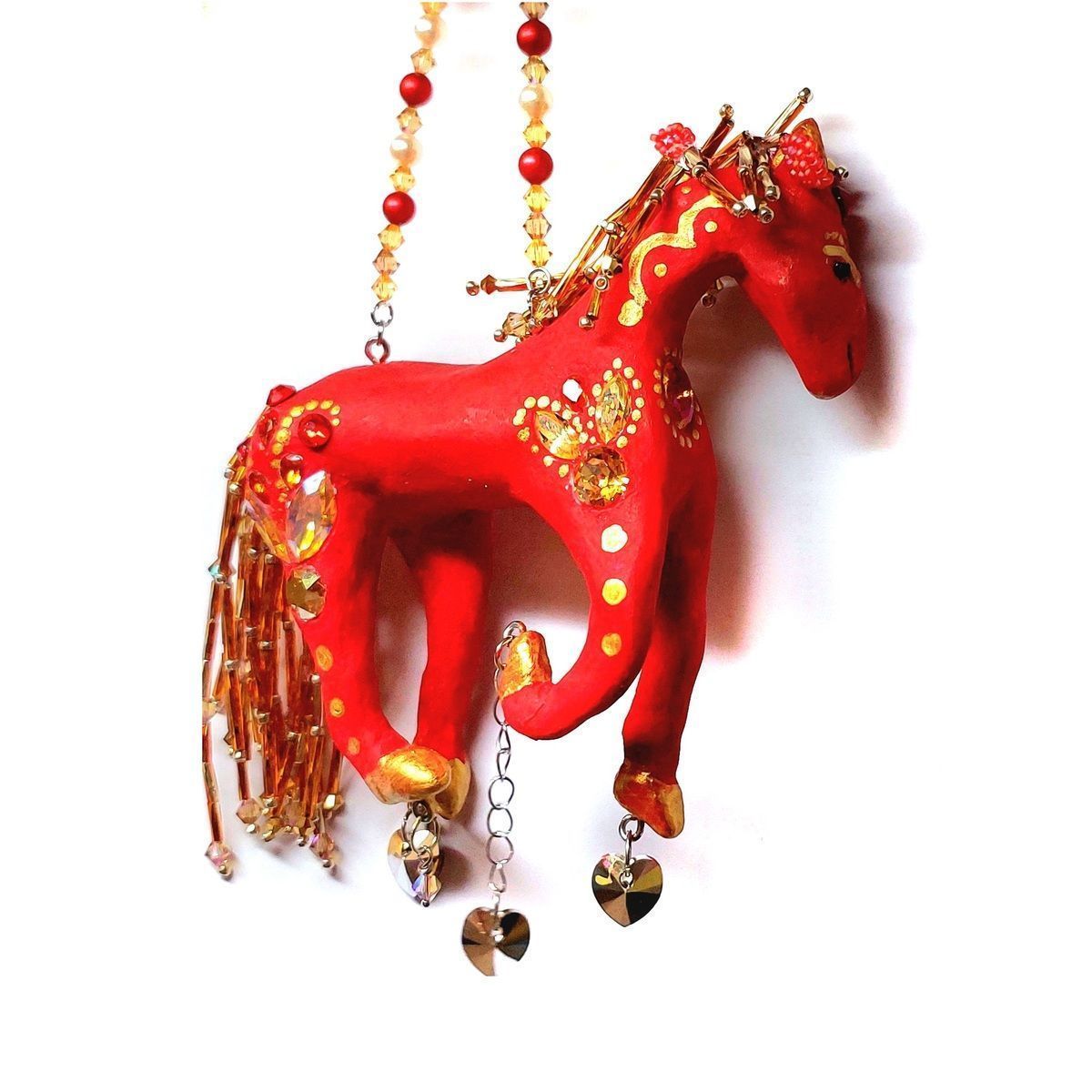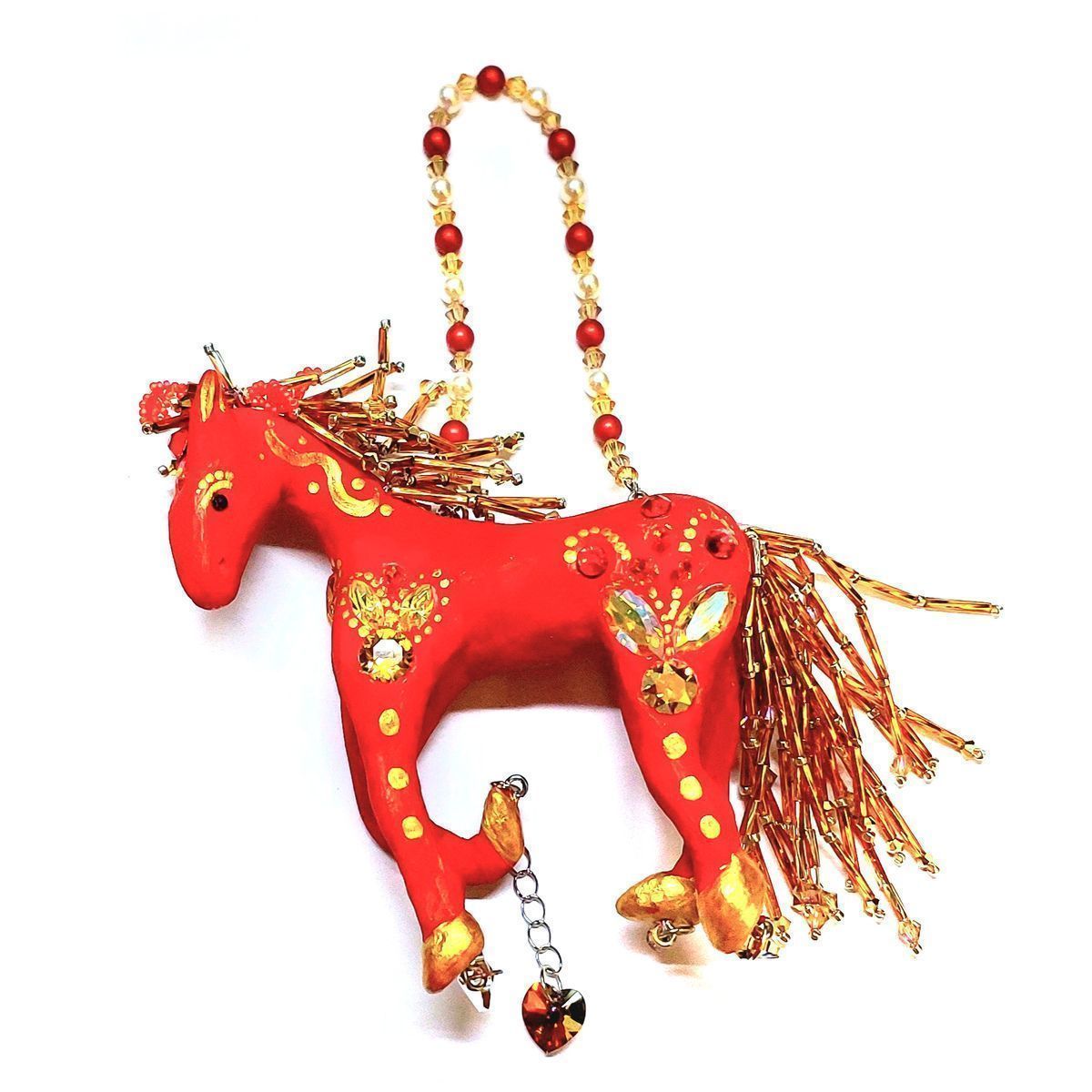 В этом году я решила создать яркую, праздничную фигурку лошади - символ наступающего Ногового года. Красный цвет приносит удачу, а золотой здоровье и достаток. Именно этого я хочу пожелать всем в наступающем Новом году. Работала в новой для себя технике - скульптурирование из самозатвердевающей глины. Каркас лошадки из проволоки. Кристаллы являются здесь частью игрушки, грива и хвост выполнены из бисера и биконусов. В гриву вплетены три рябиновых листочка, на удачу. Игрушка расписана акриловыми красками. В работе был полностью использован набор " Сказка зимнего рассвета".