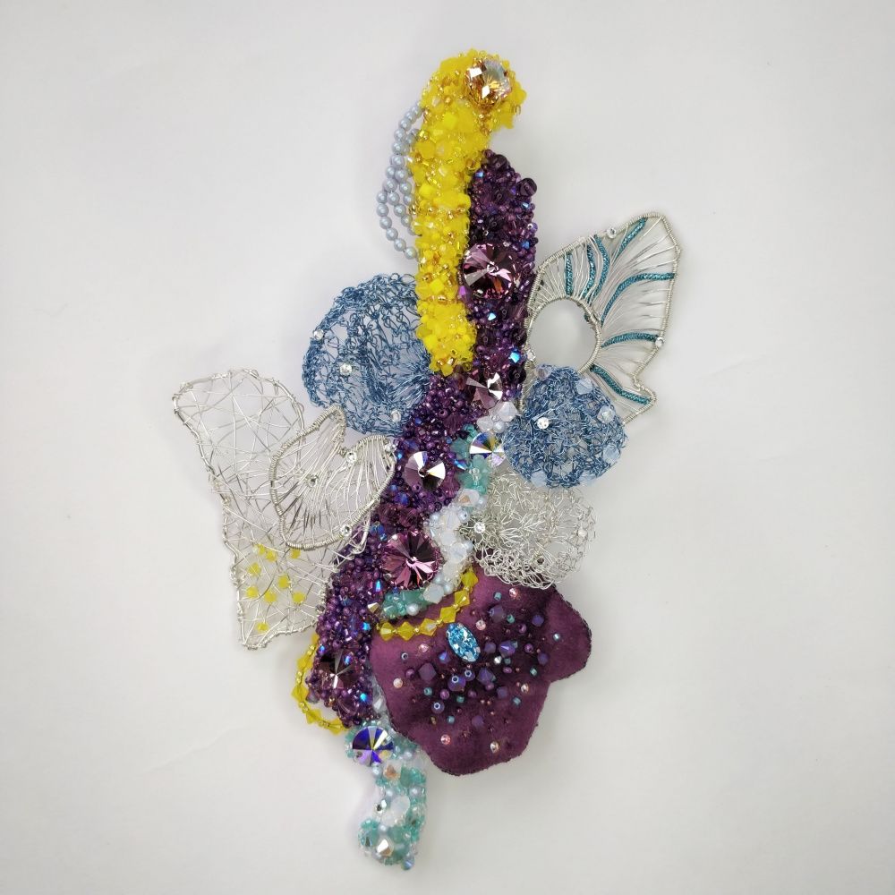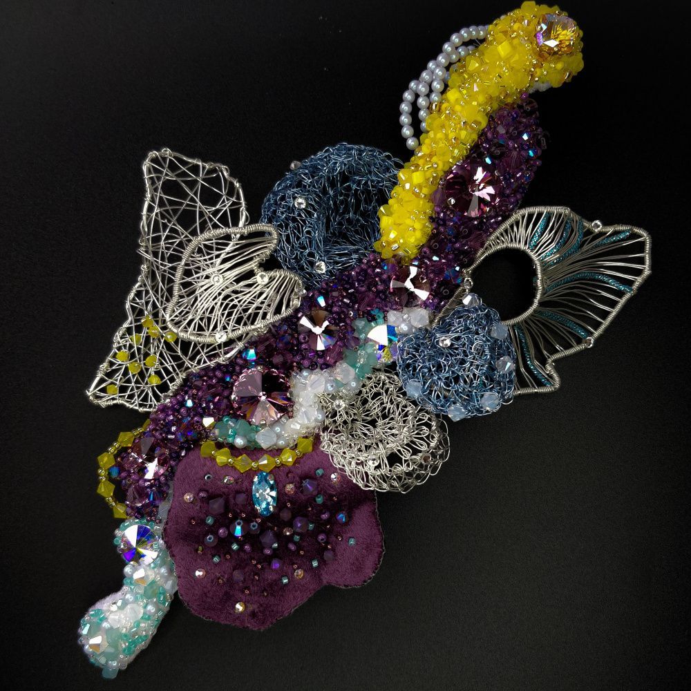 Август - это месяц смены времён года. Он разнообразен и эмоционален. Поэтому брошь "Сияние Августа" многогранна. Она богата смешением красок: от белого до темного аметистового, фактур: от нежного и теплого бархата до холодного металла, техник выполнения: вышивание, плетение, вязание.