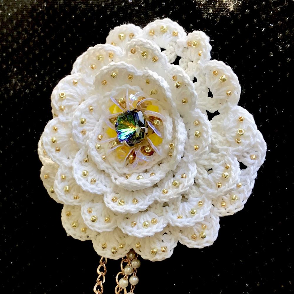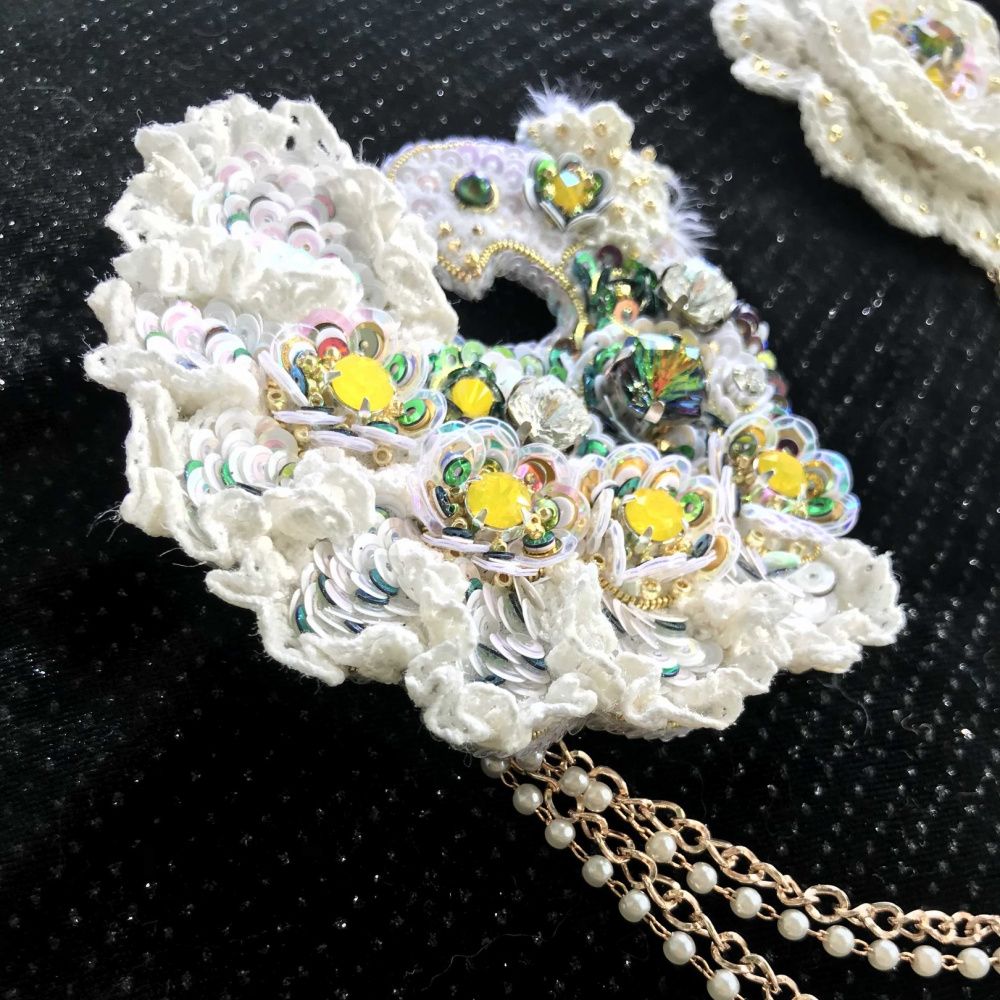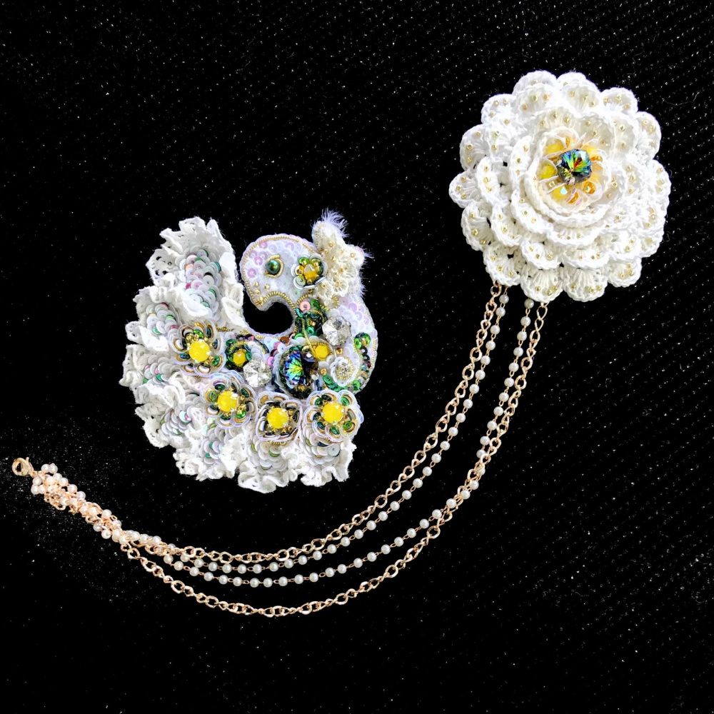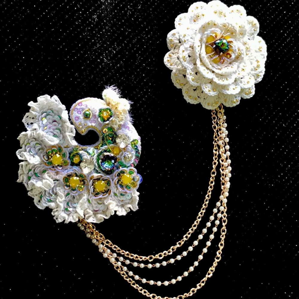 Образ создан в форм-факторе трансформера и состоит из 2-х отдельных частей: кружевной голубь «Душа Русского Севера – райская птичка» и цветок из кружева ручной работы с золотым свечением на подвеске.