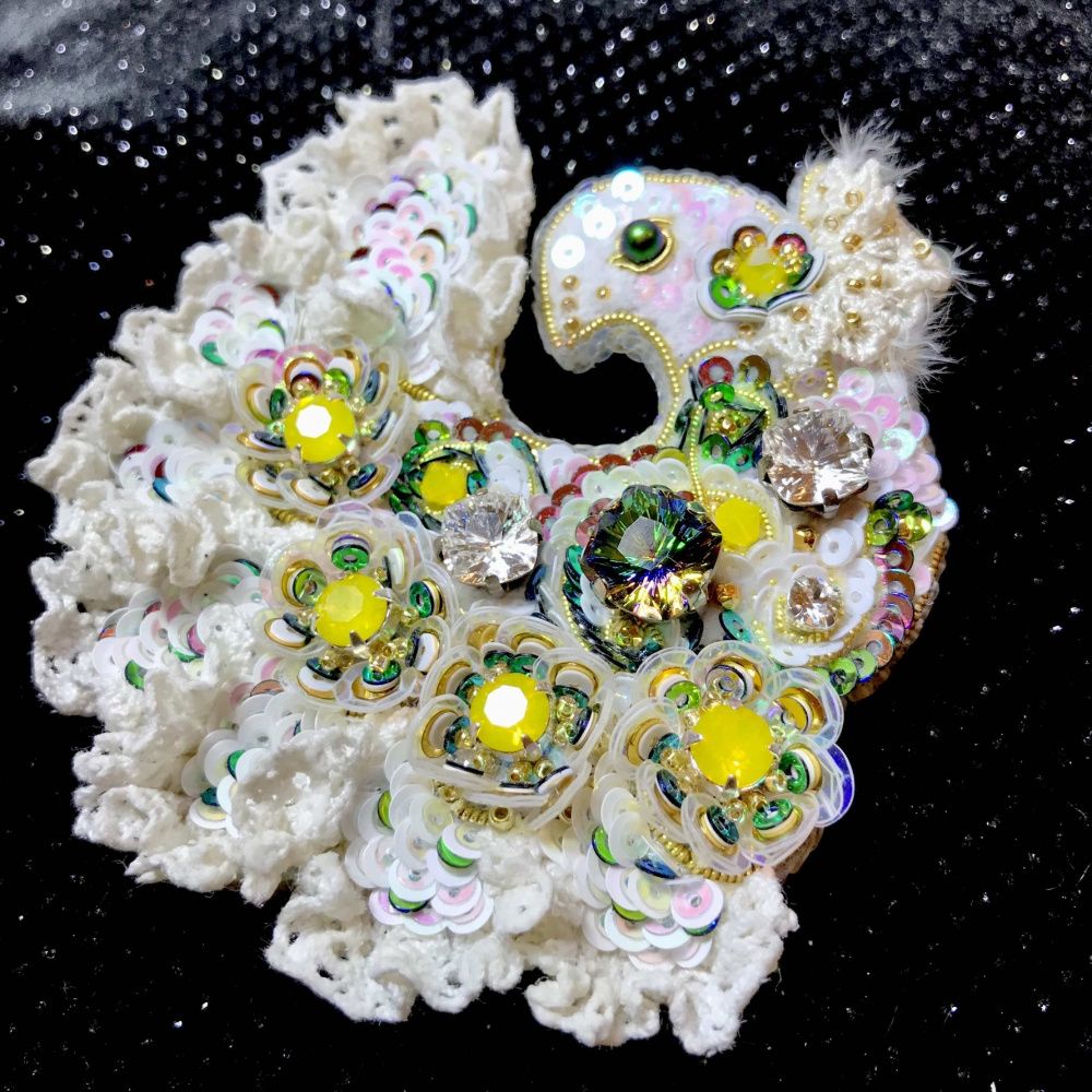 Брошь выполнена из настолько воздушных кружев и легких нитей, что кажется, будто птичка вот-вот взлетит ввысь, увлекая нас в красоту небес. Глаза яркой птички светятся, как настоящие драгоценные камни Вологодчины, а ее милая головка украшена пайетками, соединяя в себе историю и современность.