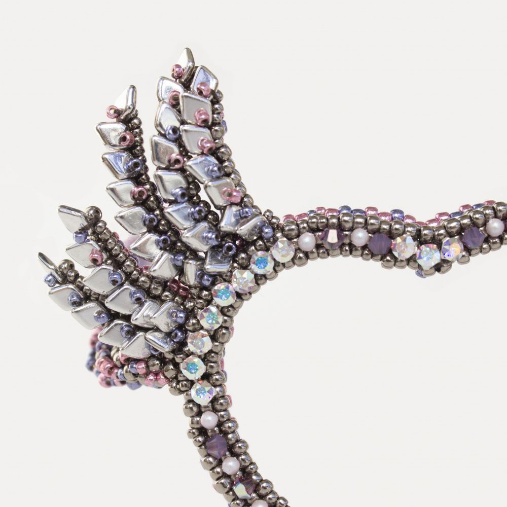 Очки созданы в технике бисероплетения, в дужки вставлена проволока для жесткости. Передняя часть очков держит форму полностью за счет плетения.