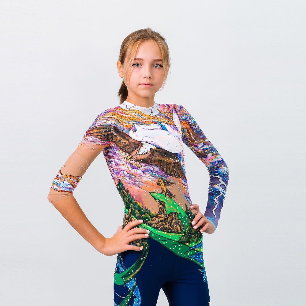 Этот костюм вдохновлён природой. Ее нельзя не любить, ею нельзя не восхищаться. Ведь природа очень многогранна и разнообразна . Природа - все то, что нас окружает. Это растения, животные, вода, воздух, горные породы. На земле множество видов растений, животных и все они тесно связаны между собой. Это и захотелось передать создавая костюм. На каждой стороне изображены разные грани удивительной природы. Спереди, сверху вы увидите коня на краю скалы и темно зелёный густой лес, чуть выше могучий, властный орёл взмылся вверх в поисках новой жертвы. По переднему рукаву раскинулись грозы и знойные дожди, а переходя по плечу на спину мы видим мирное и спокойное небо, по которому беззаботно летя белоснежные чайки. Спускаясь ниже мы видим воду яро бьющуюся о скалы. Вода спускается тонкой рекой вниз, оказываясь в таинственной и тёмной пещере. От новых сочетаний и новых граней природы которые можно увидеть в жизни захватывает дух. Именно эти эмоции можно получить увидев данный костюм . Всмотрись и природа откроется тебе с новой стороны.