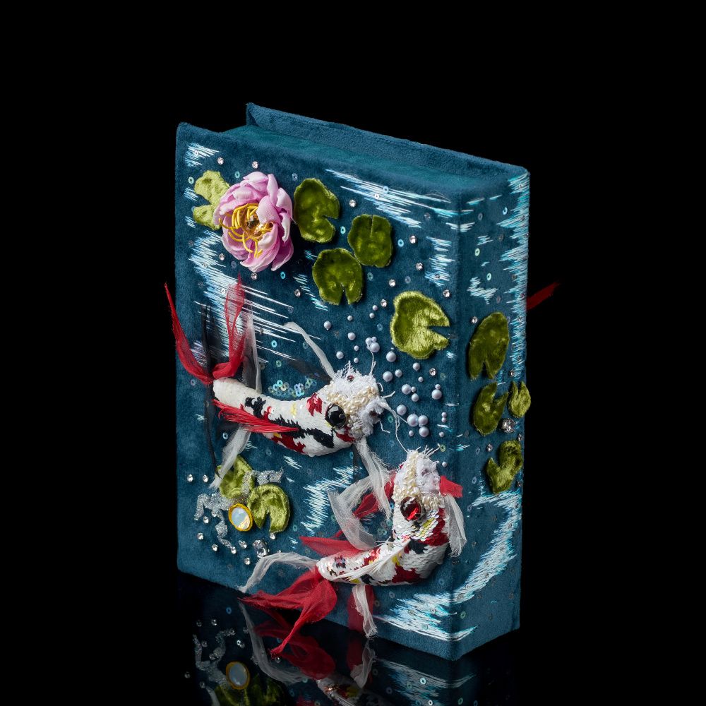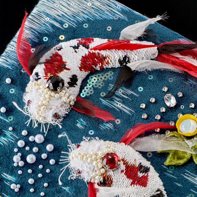 Моя работа основана на этой прекрасной легенде и как мне кажется, она идеально вписалась в тему конкурса: на одной стороне клатча Кои плывут по течению , а на второй стороне - против. Этот год выдался неимоверно сложным, но именно он во многих раскрыл скрытые потенциалы. Мы словно эти самоцветные рыбки олицетворяющие собой волю и упорство умело справлялись с жизненными трудностями. Одни сдаются, а другие, как и я, продолжают свой путь по водопаду, оттачивая Новые Грани Сияния.