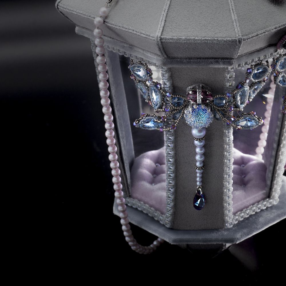 Показать красоту прозрачных кристаллов мне захотелось через природные формы. Так появились стрекозки с просвечивающимися крылышками. Они как бы обнимают фонарь и кладут крылья на его прозрачную часть. Таким образом свет проходит через них, останавливается и играет в голубых гранях.