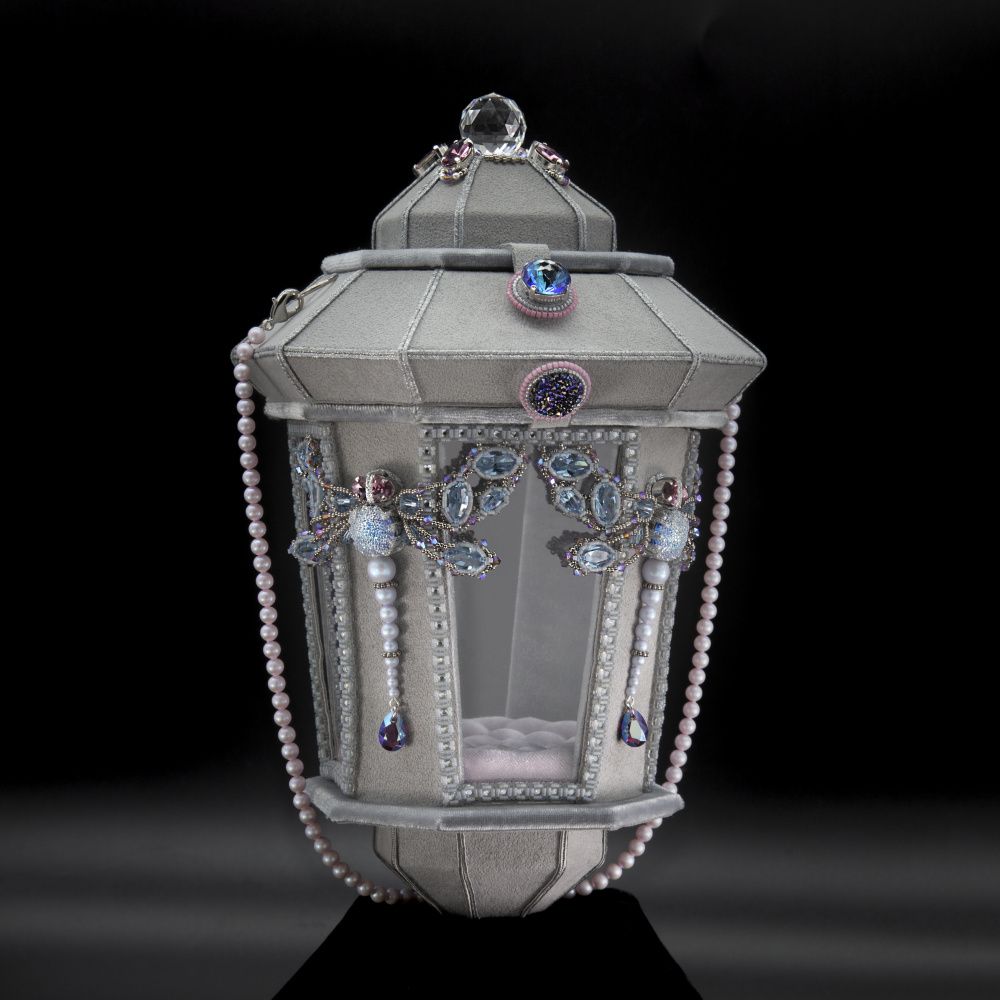 Сумочка сделана в виде фонаря со стрекозами по бокам. Она имеет два внутренних пространства. Одно в нижней части с прозрачными стенками, второе спрятано в верхней закрытой части.