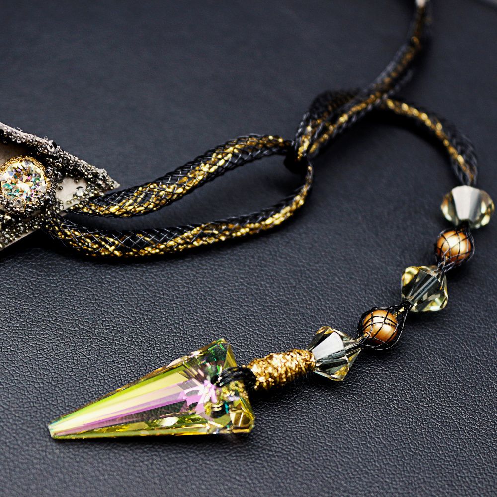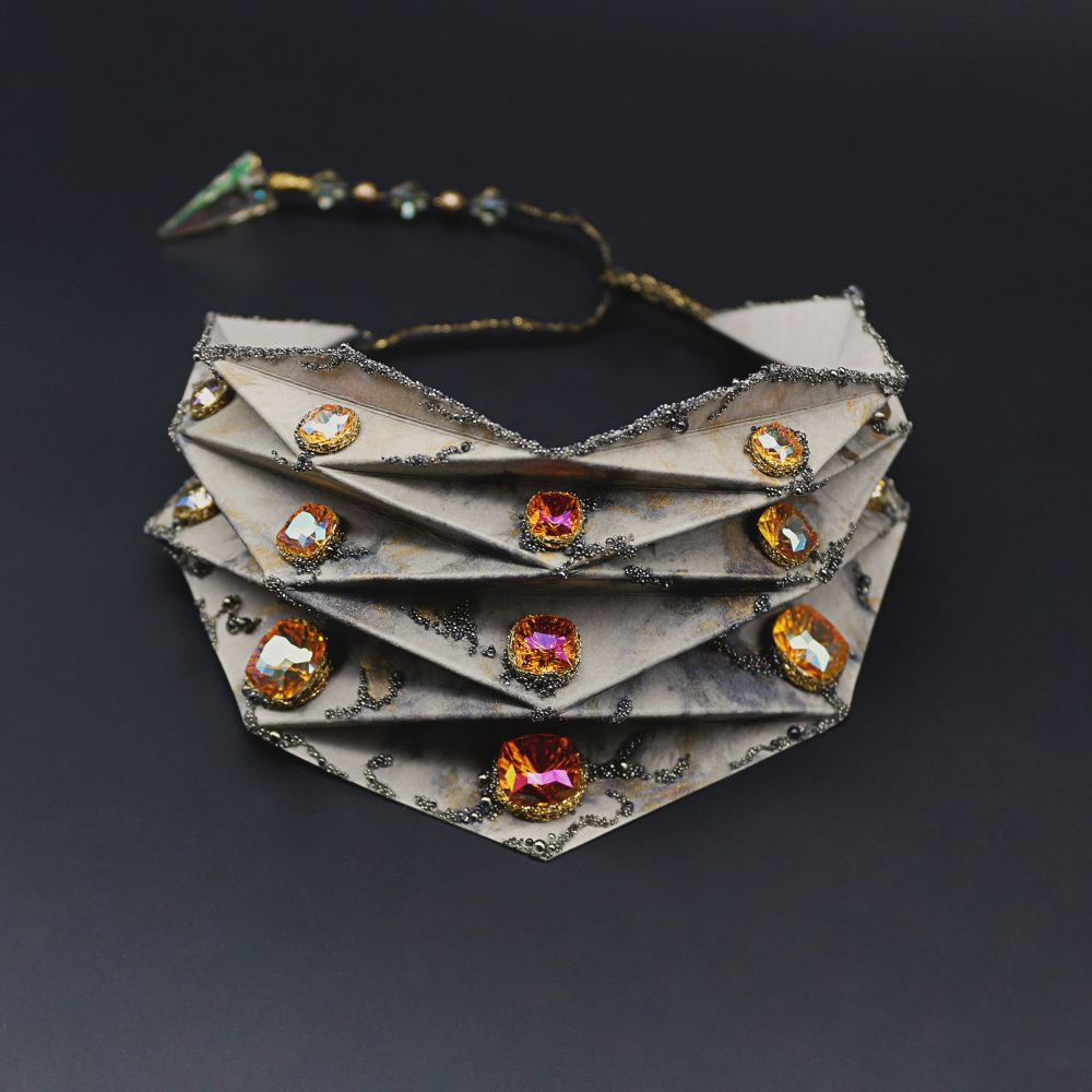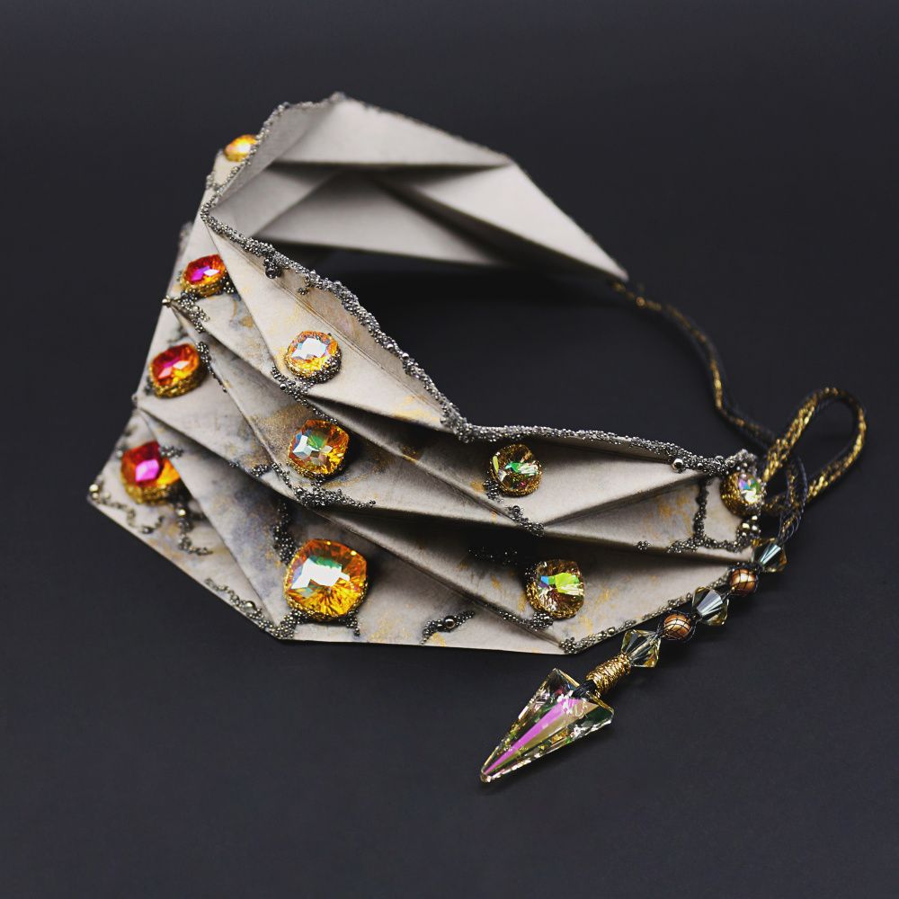 В своей работе я объединила элементы древнего искусства «ОРИГАМИ» и современную интерпретацию формы чокера. Строгие линии ожерелья, его четкие грани, дополненные безупречными кристаллами «SWAROVSKI» как нельзя лучше отражают тему конкурса «НОВЫЕ ГРАНИ СИЯНИЯ».