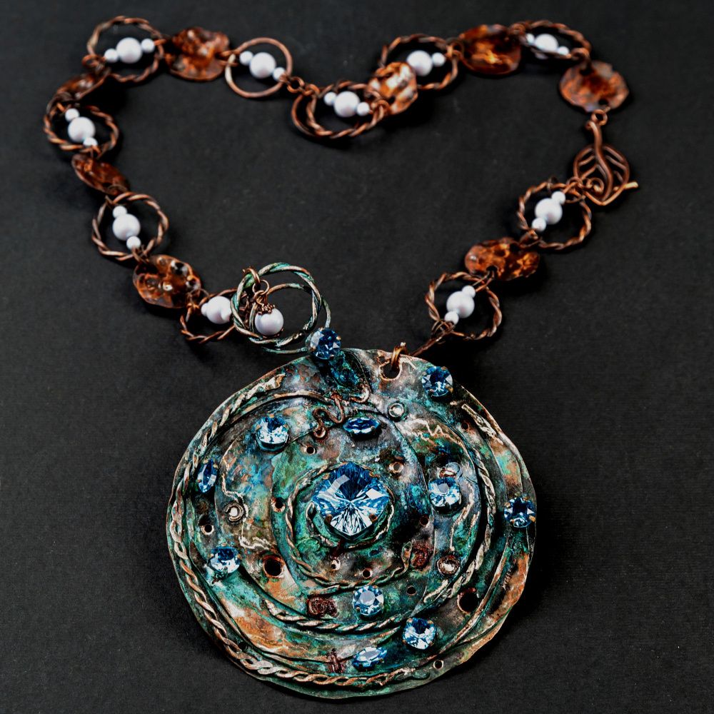 Моё колье — это прекрасные и завораживающие стихи Александра Блока выраженные в меди. Если присмотреться, то в колье можно увидеть и реку и звезды, и центральный кристалл- душу.Вокруг которого всё и вращается. Такой совершенный в своей холодной красоте. Несколько слоёв патины помогают передать «течение реки», а кристаллы это конечно же звезды.Но главнее всего душа- от нее очень трудно оторвать взгляд.
