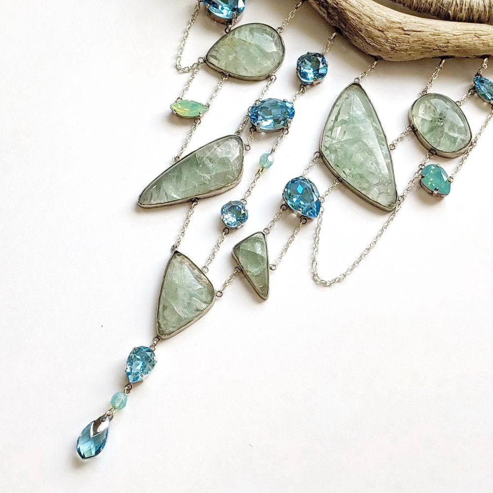 Химия между нами случилась в секунду. Прекрасные прозрачные кристаллы и такие же прозрачные натуральные флюориты. Все оттенки воды, текучая форма, максимально простой дизайн и экологичные материалы. Я только осваиваю ювелирные техники, но идея требовала именно такого воплощения. Мне хотелось вывести на первый план природные фактуры и показать: это сочетание, элитные кристаллы и натуральные материалы, имеет право на жизнь! Своеобразный вызов миру гламура, красота простых форм и чистых цветов.