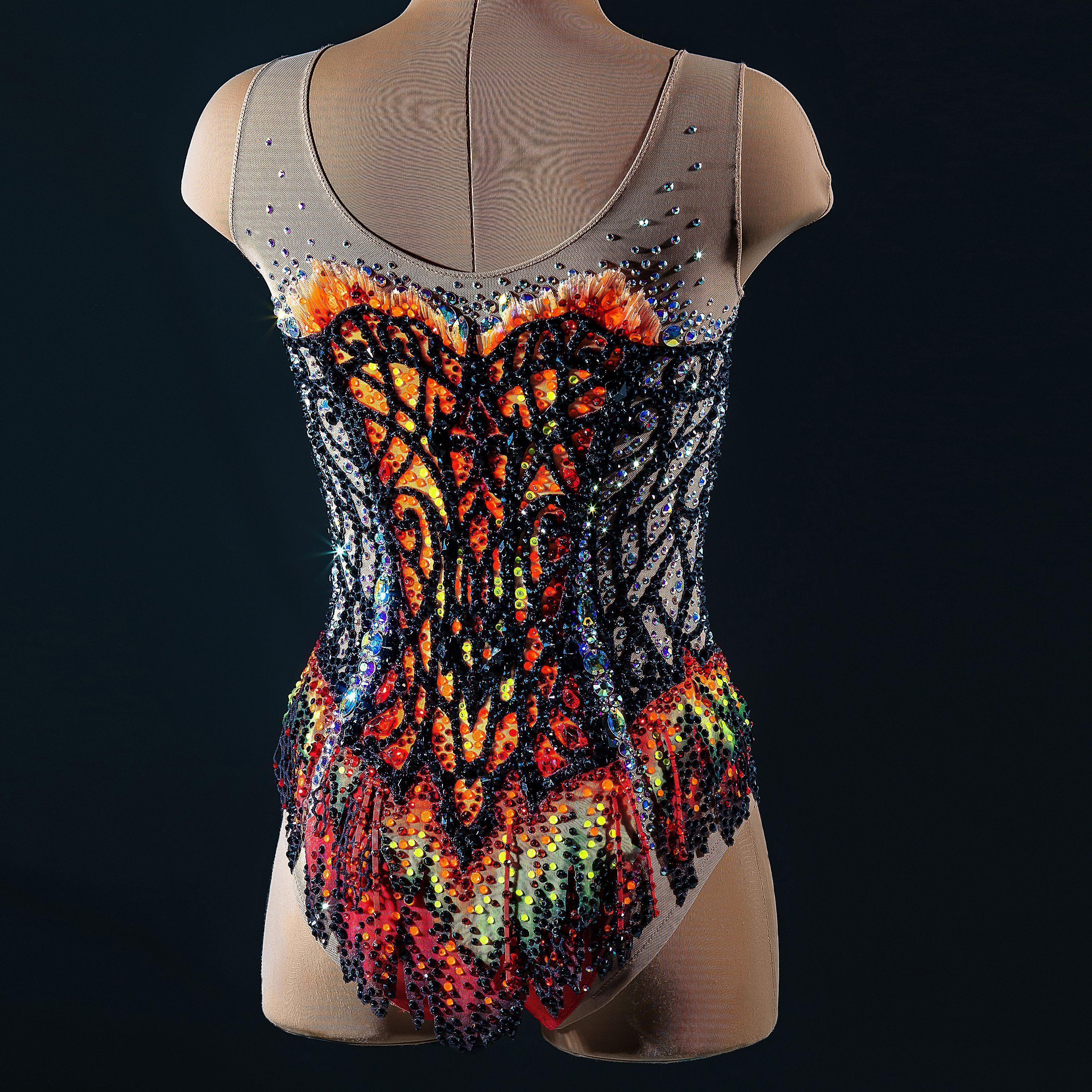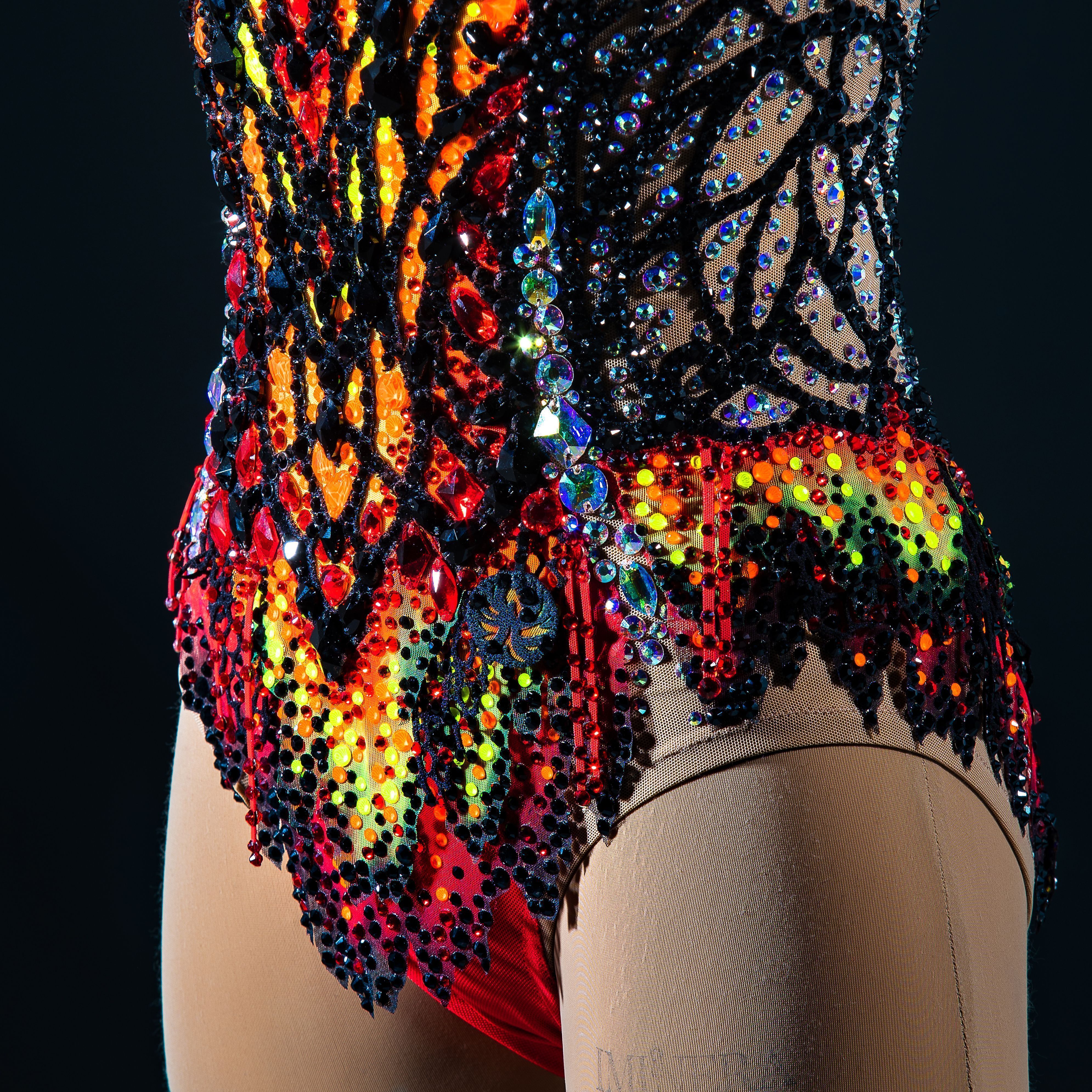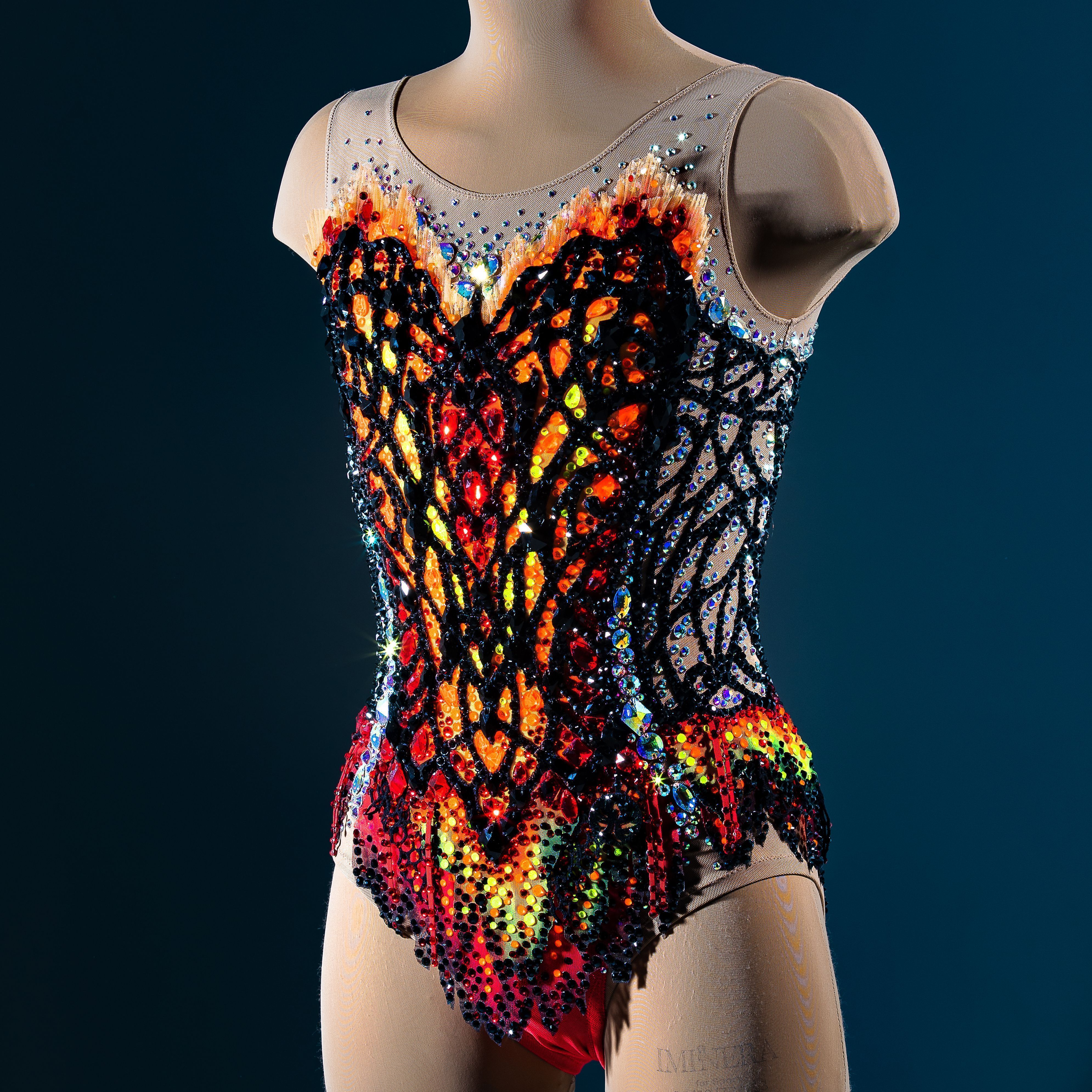 Конкурсные кристаллы, мерцающие на ткани, словно зажгли внутри купальника магический огонь. Сверкающие детали, как искры, усиливают ощущение мистики, создавая иллюзию живого огня, охватывающего спортсменку. В каждом грациозном движении, отражается мощь Феникса — неутомимого борца, рождающегося заново, чтобы восстать ещё сильнее. В этом образе спортсменка становится живым воплощением Феникса — огненной птицы, символизирующей возрождение и силу воли.