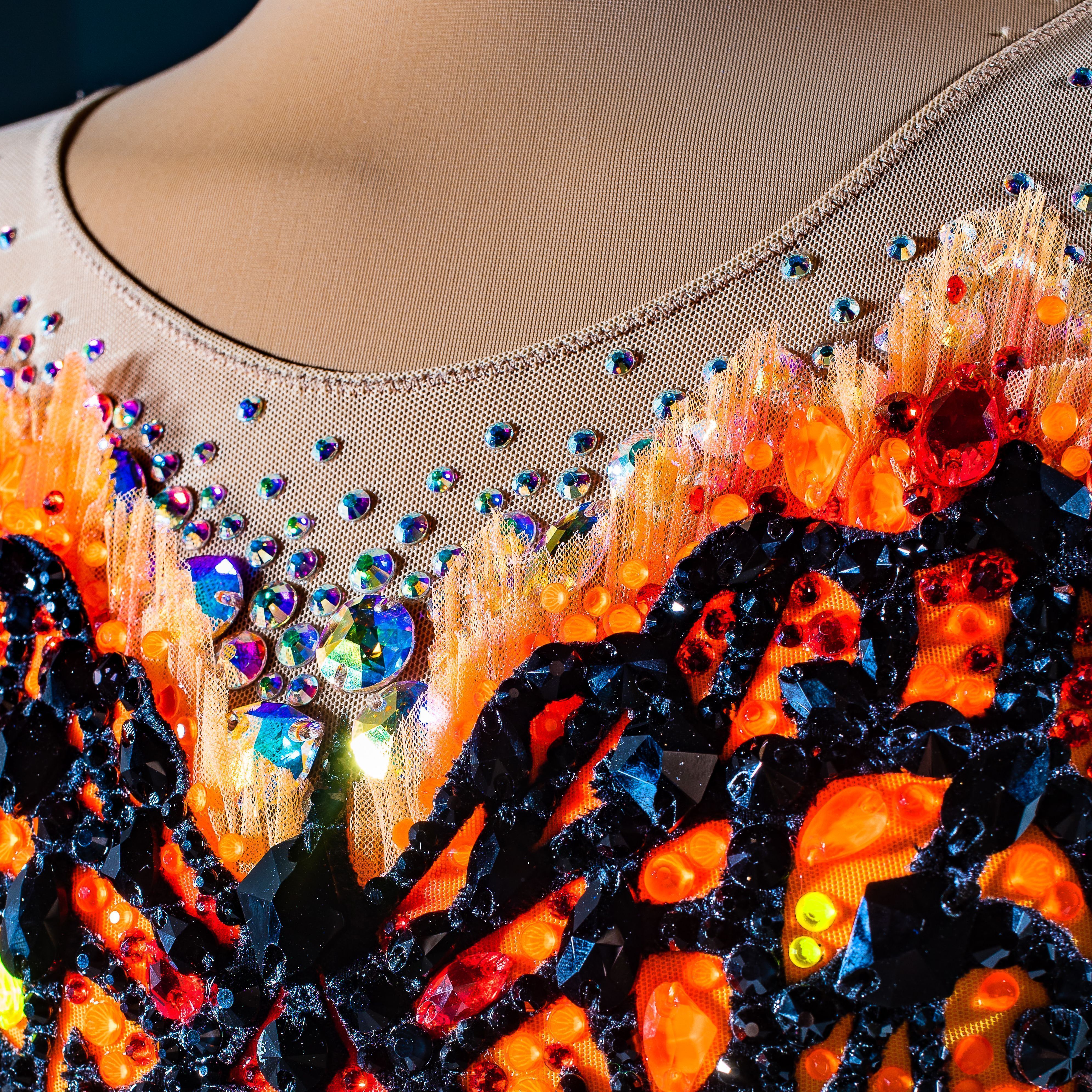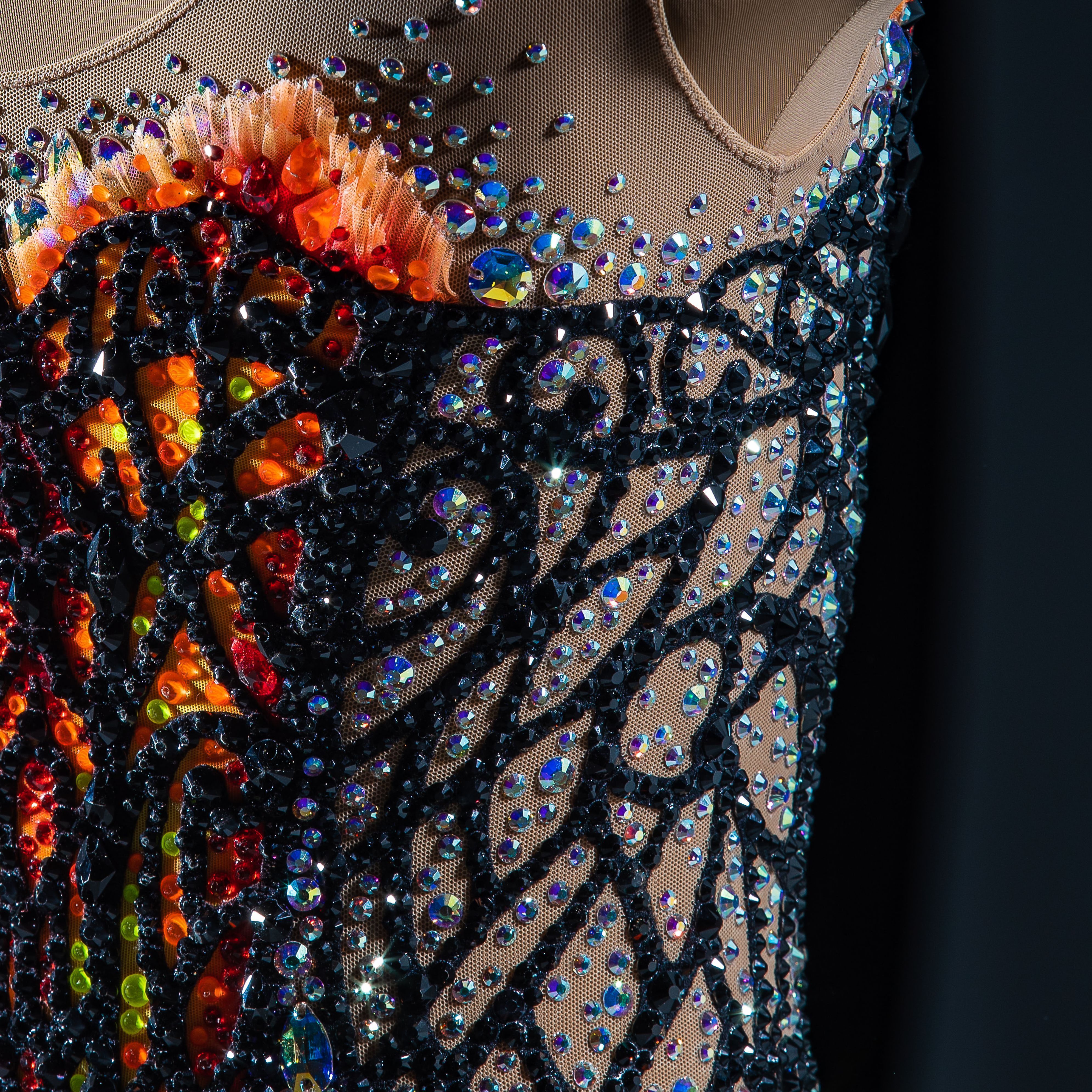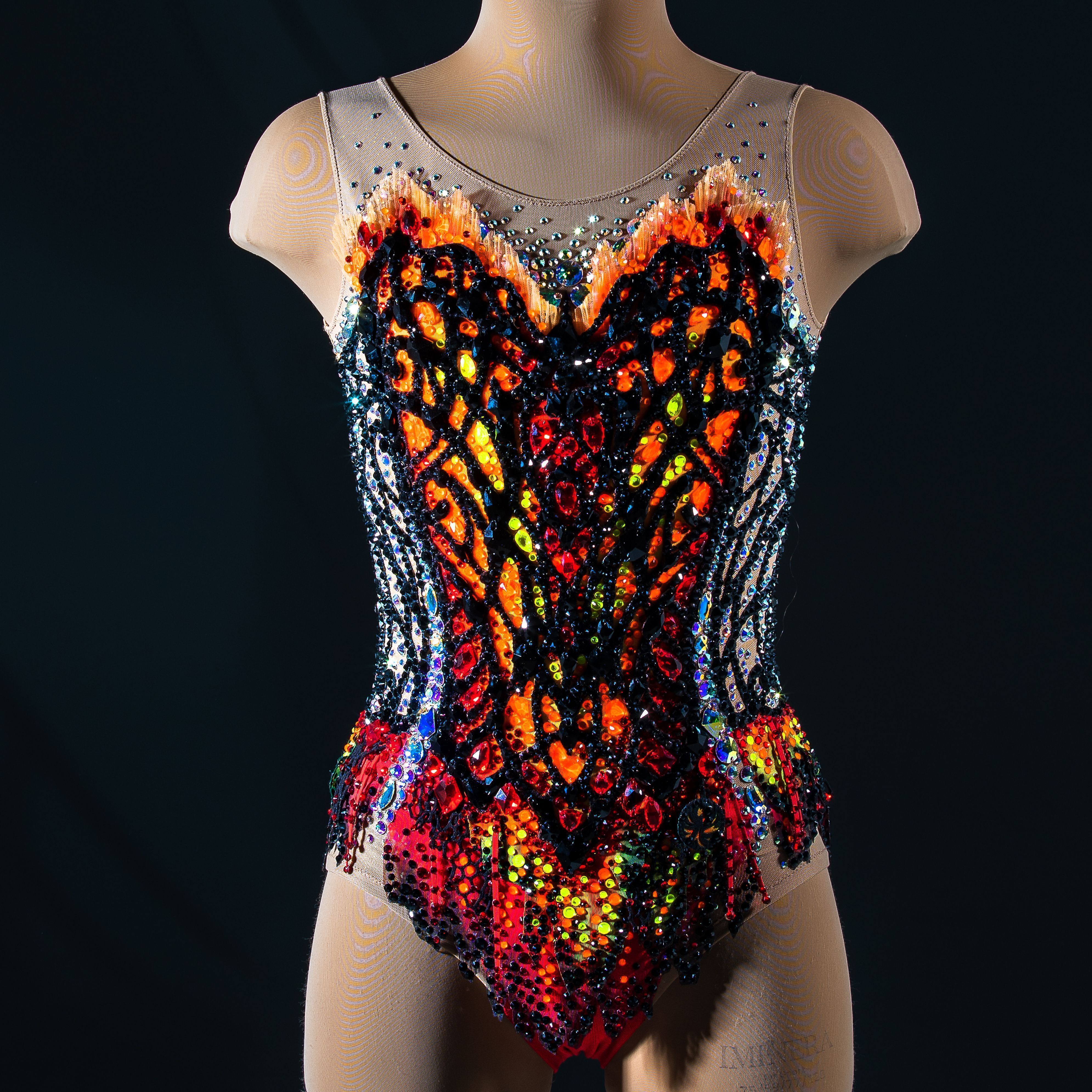 Конкурсные кристаллы, мерцающие на ткани, словно зажгли внутри купальника магический огонь. Сверкающие детали, как искры, усиливают ощущение мистики, создавая иллюзию живого огня, охватывающего спортсменку. В каждом грациозном движении, отражается мощь Феникса — неутомимого борца, рождающегося заново, чтобы восстать ещё сильнее. В этом образе спортсменка становится живым воплощением Феникса — огненной птицы, символизирующей возрождение и силу воли.