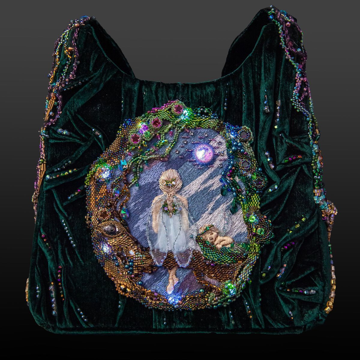 В дизайне своей сумочки хотела отразить загадочное и мистическое место в Зазеркалье, где можно встретить Фею. Фея - благожелательная волшебница, которая способна творить чудеса.