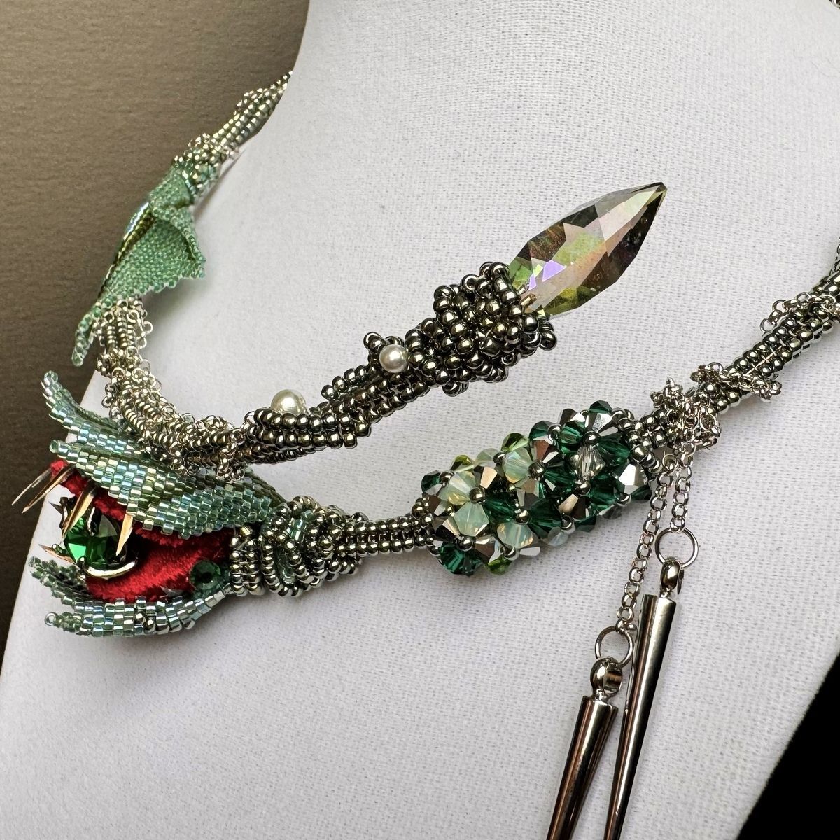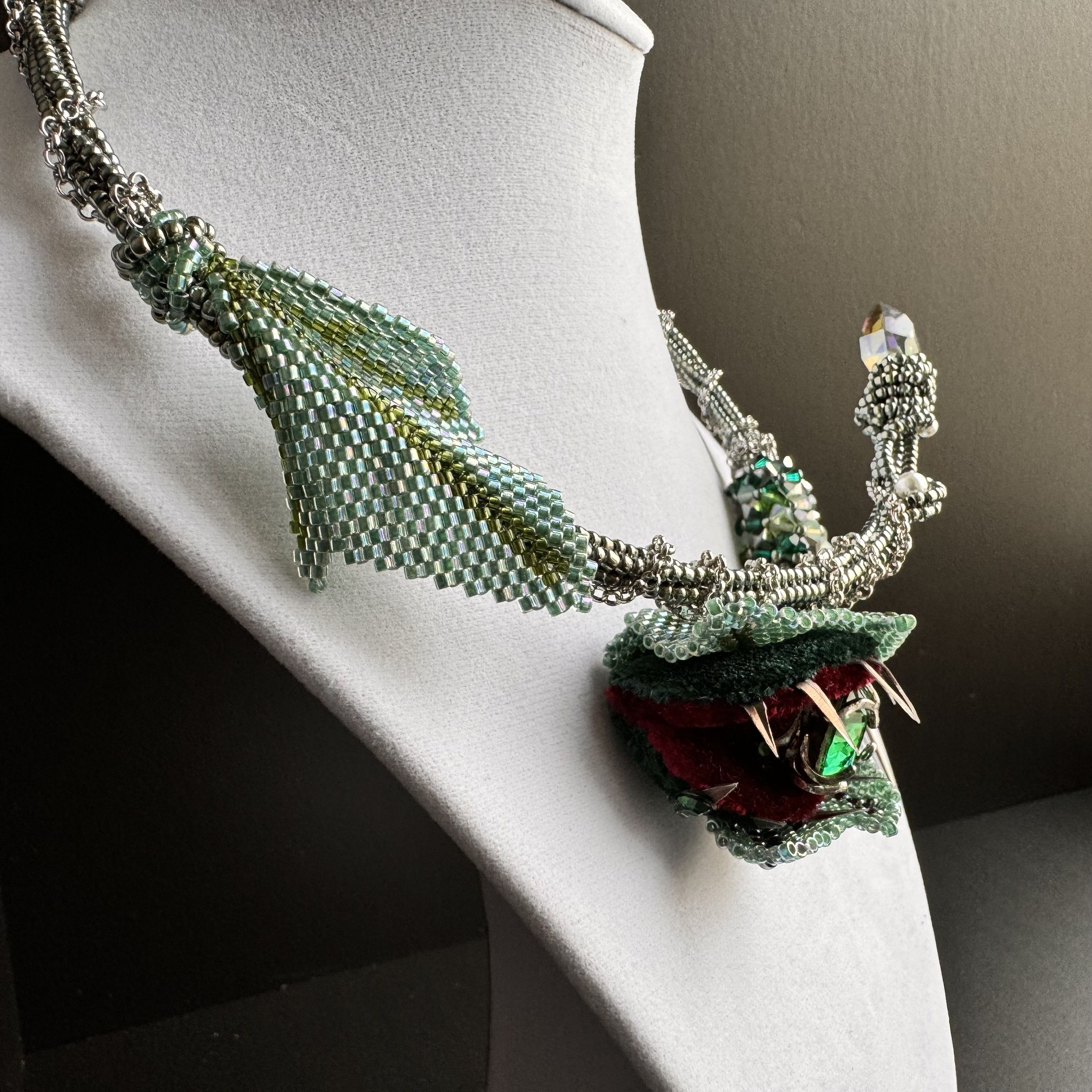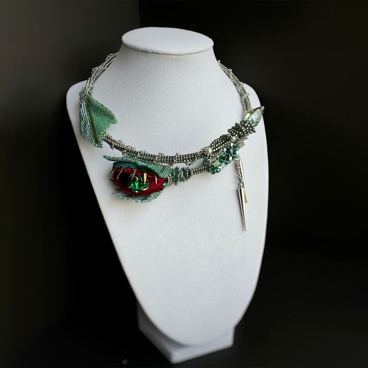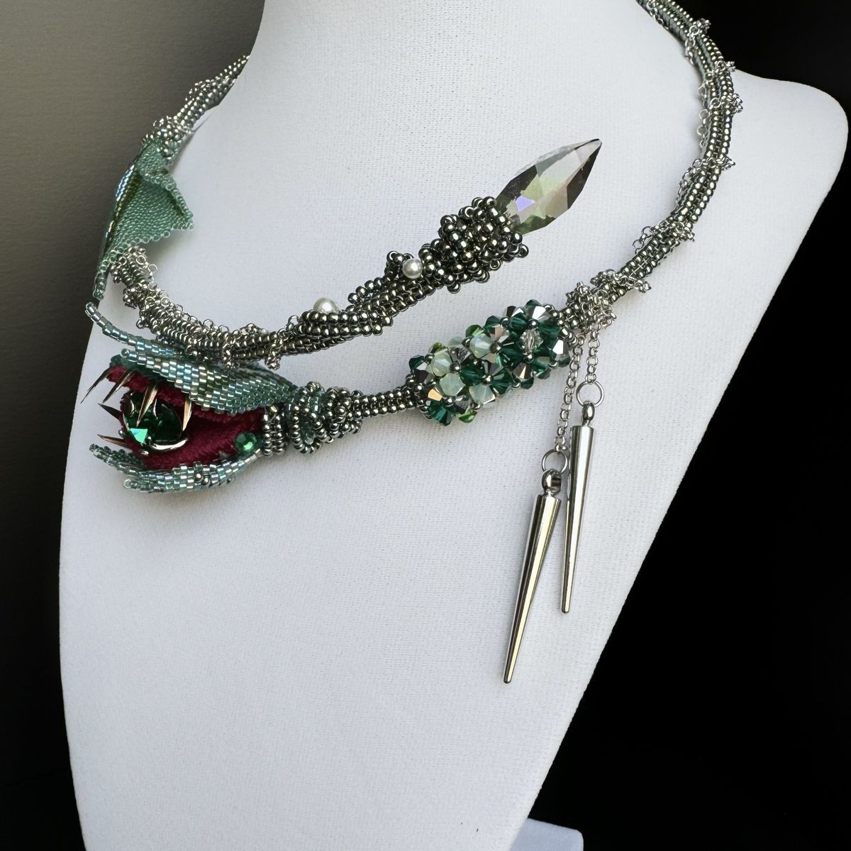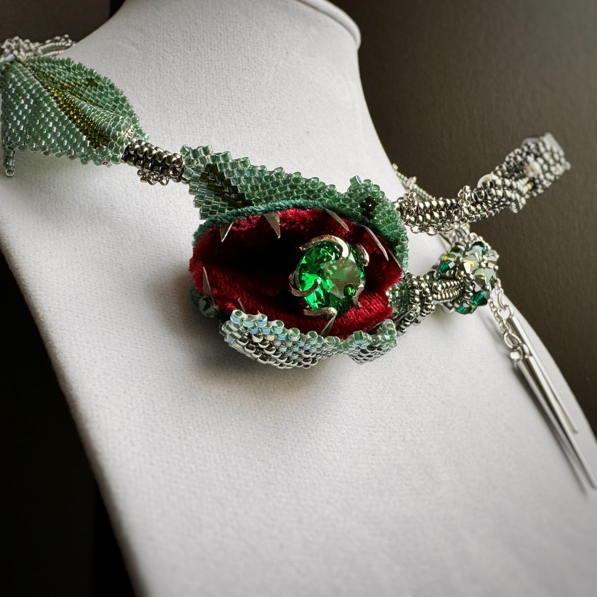В моём Зазеркалье девушки украшают себя сказочными растениями, например «Дионея», украшение-«хищник», оно обвивает шею своей хозяйки с любовью, но может и уколоть её шипами.
