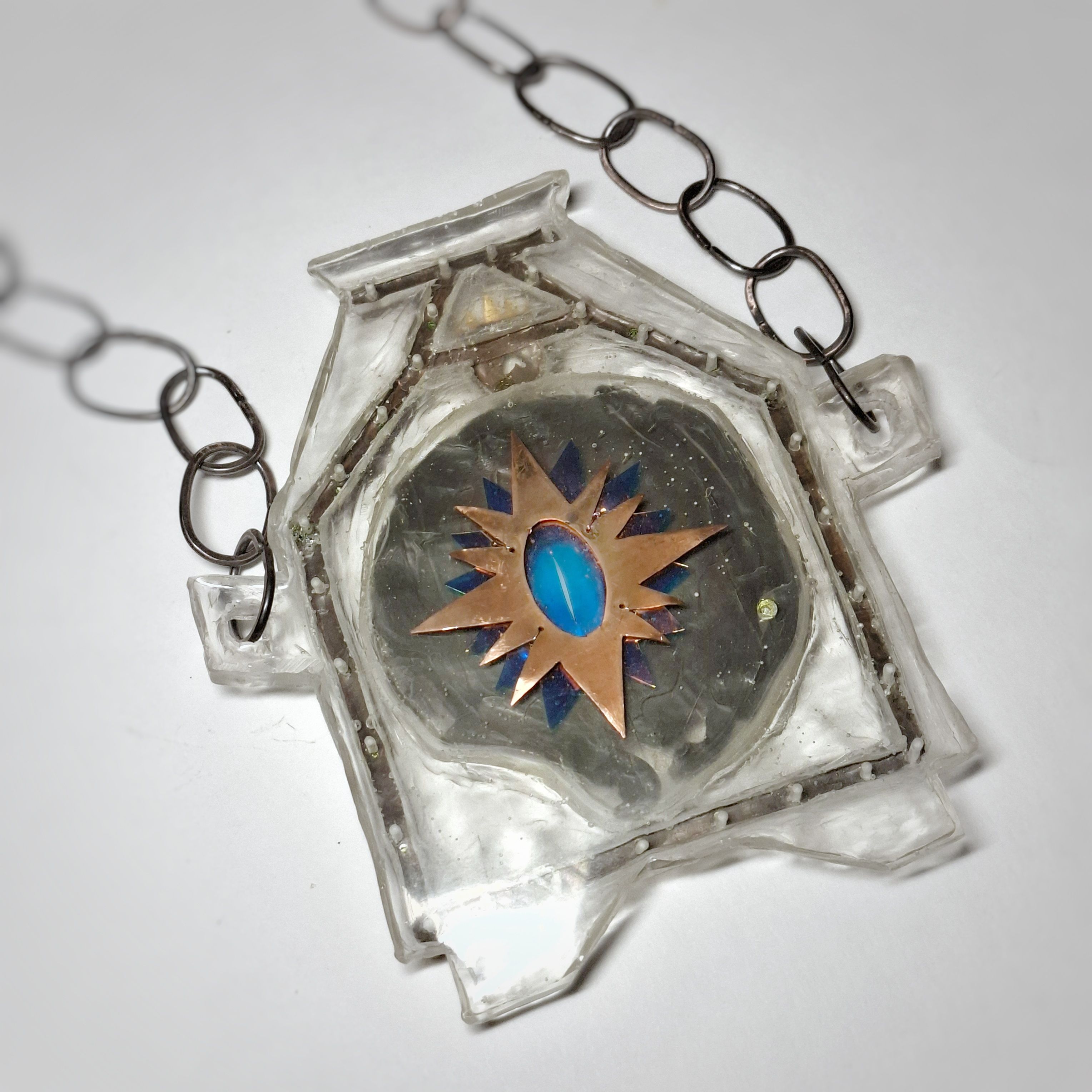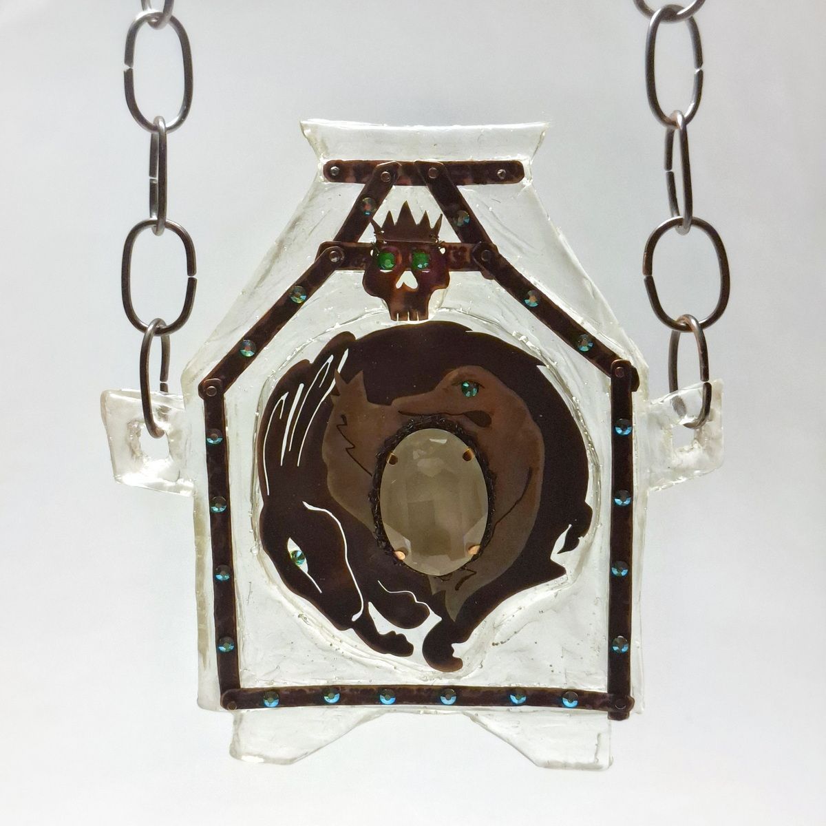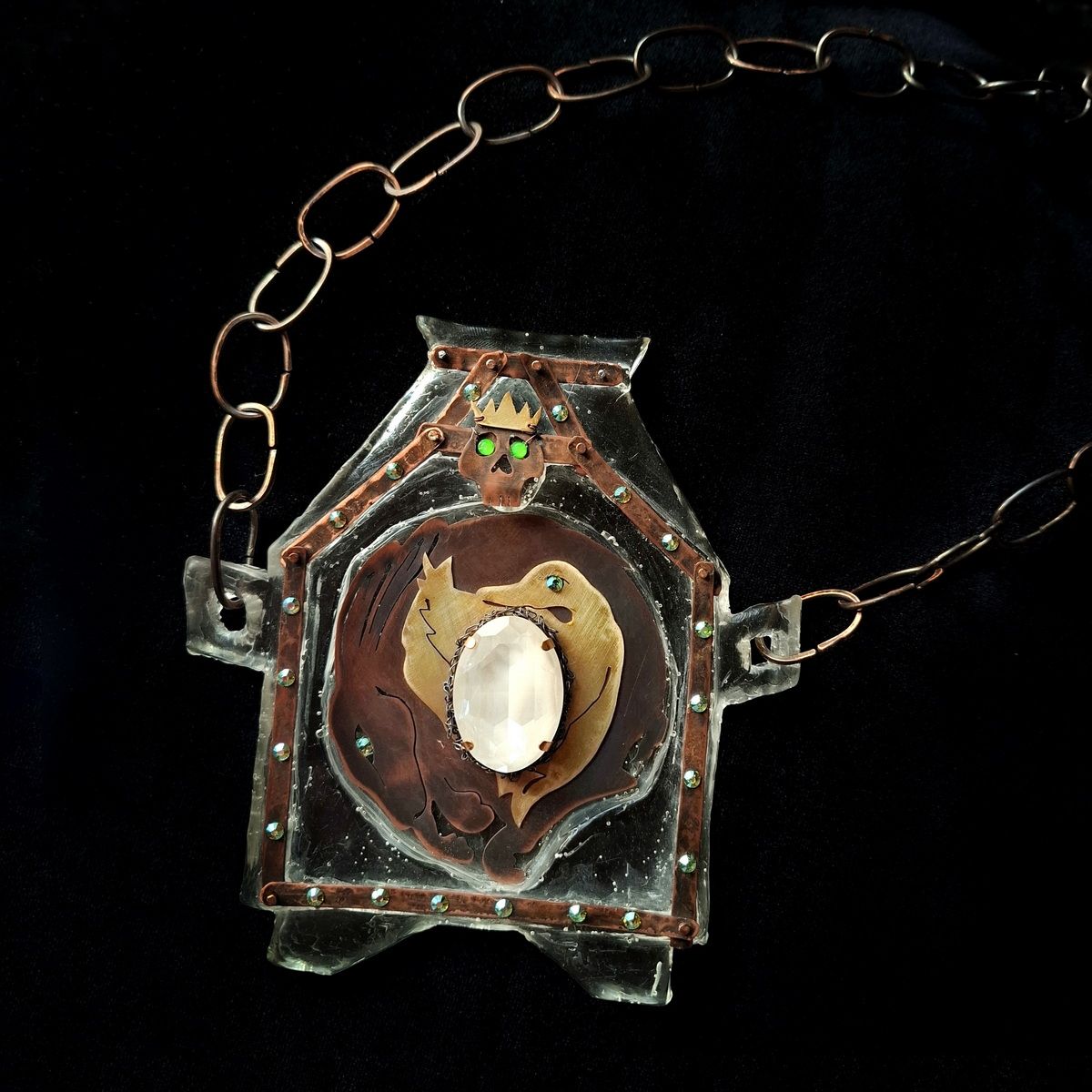 Колье Смерть Кощея выполнено из меди, латуни, эпоксидной смолы, декорировано кристаллами. Цепь сделана вручную из медной проволоки.