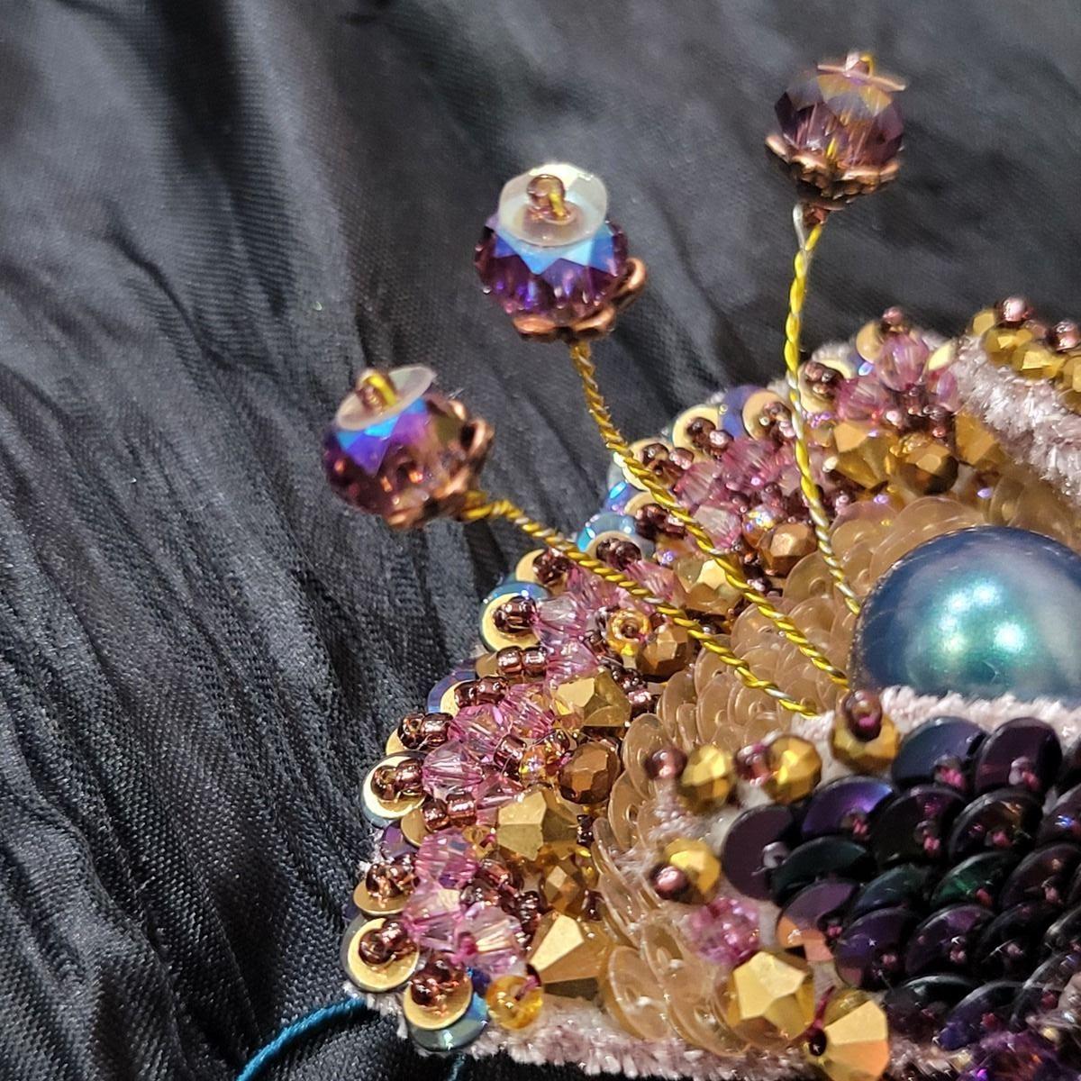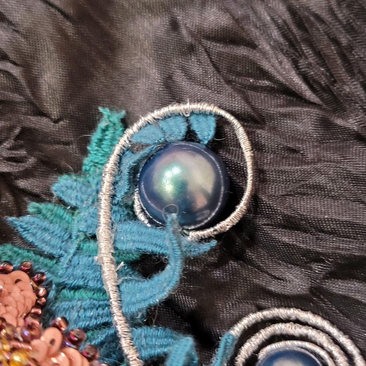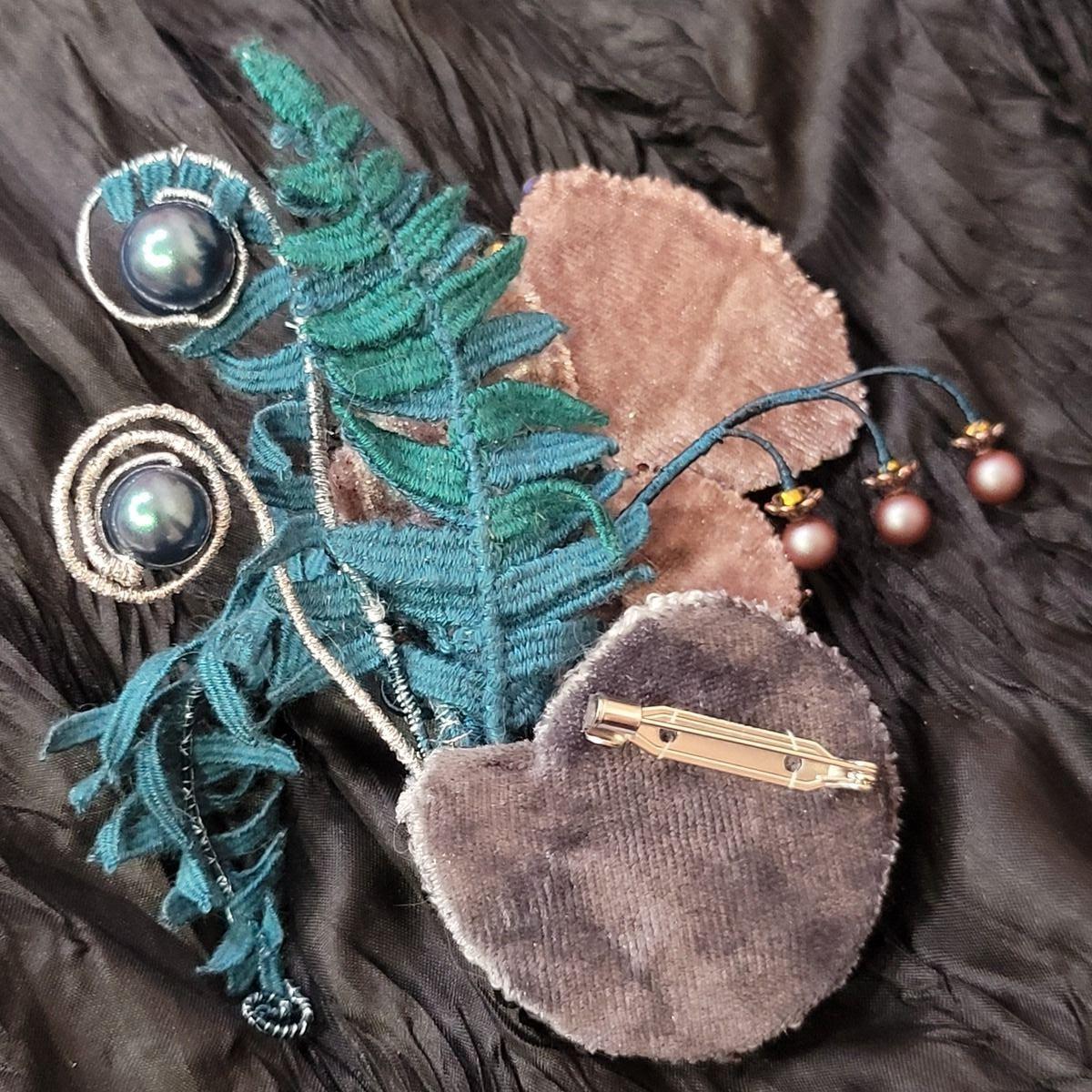 Брошь ярко и образно передает атмосферу тайн и чудес, скрывающихся в недрах дикой природы. Выбранная цветовая гамма - холодные зелёные, бирюзовые оттенки и приглушённый аметистовый - создаёт эффект погружения в параллельную реальность, где привычные формы и образы трансформируются, открывая свои потаённые грани.