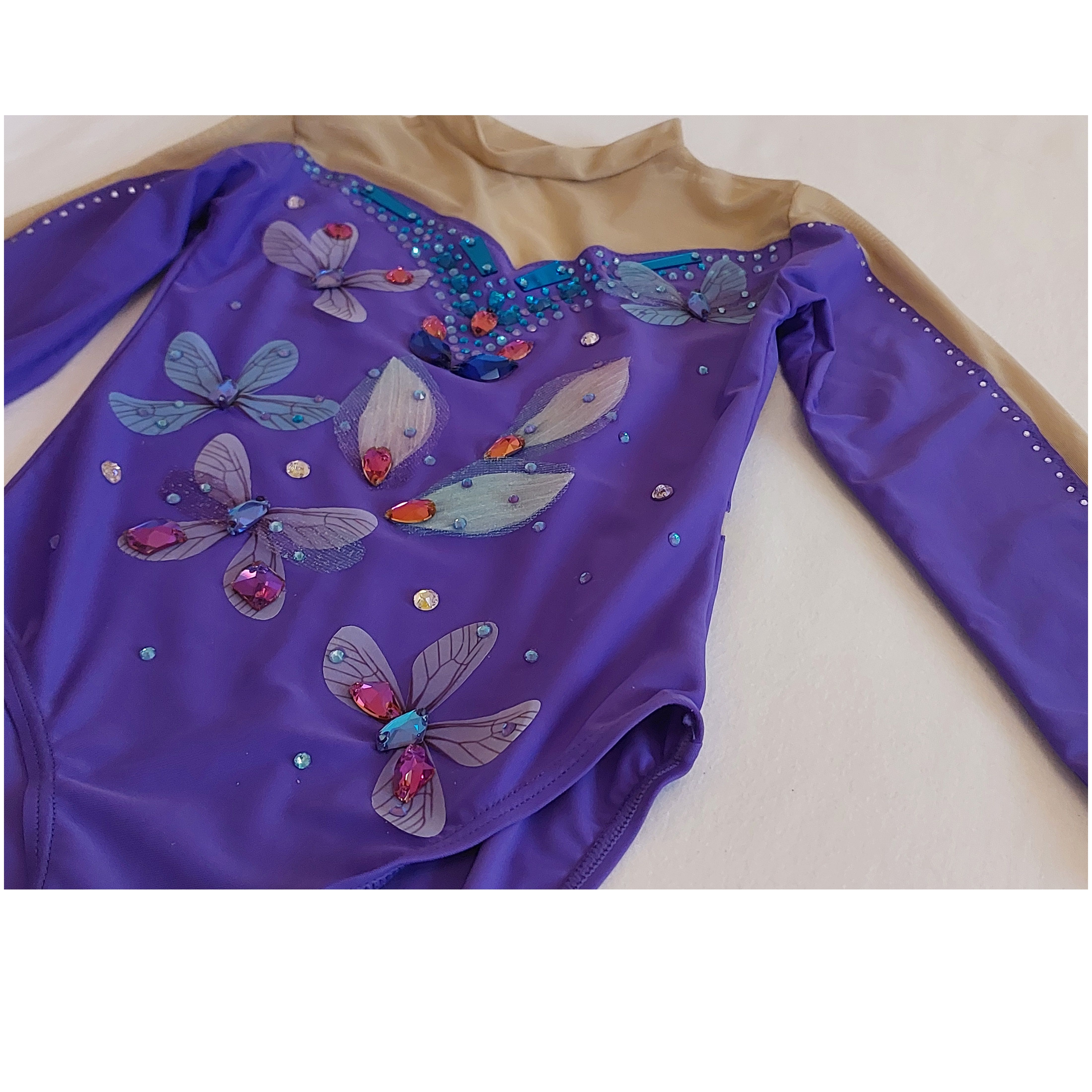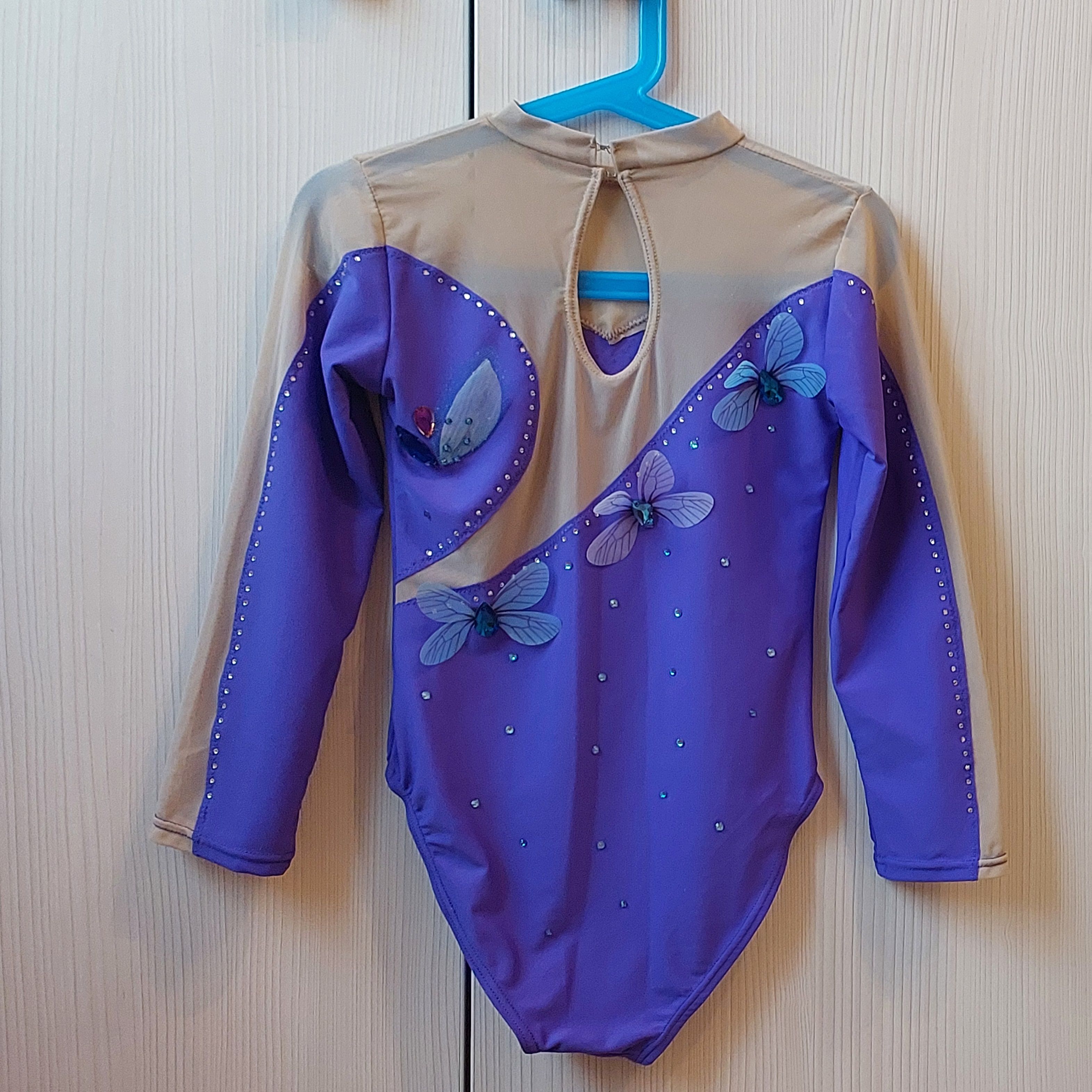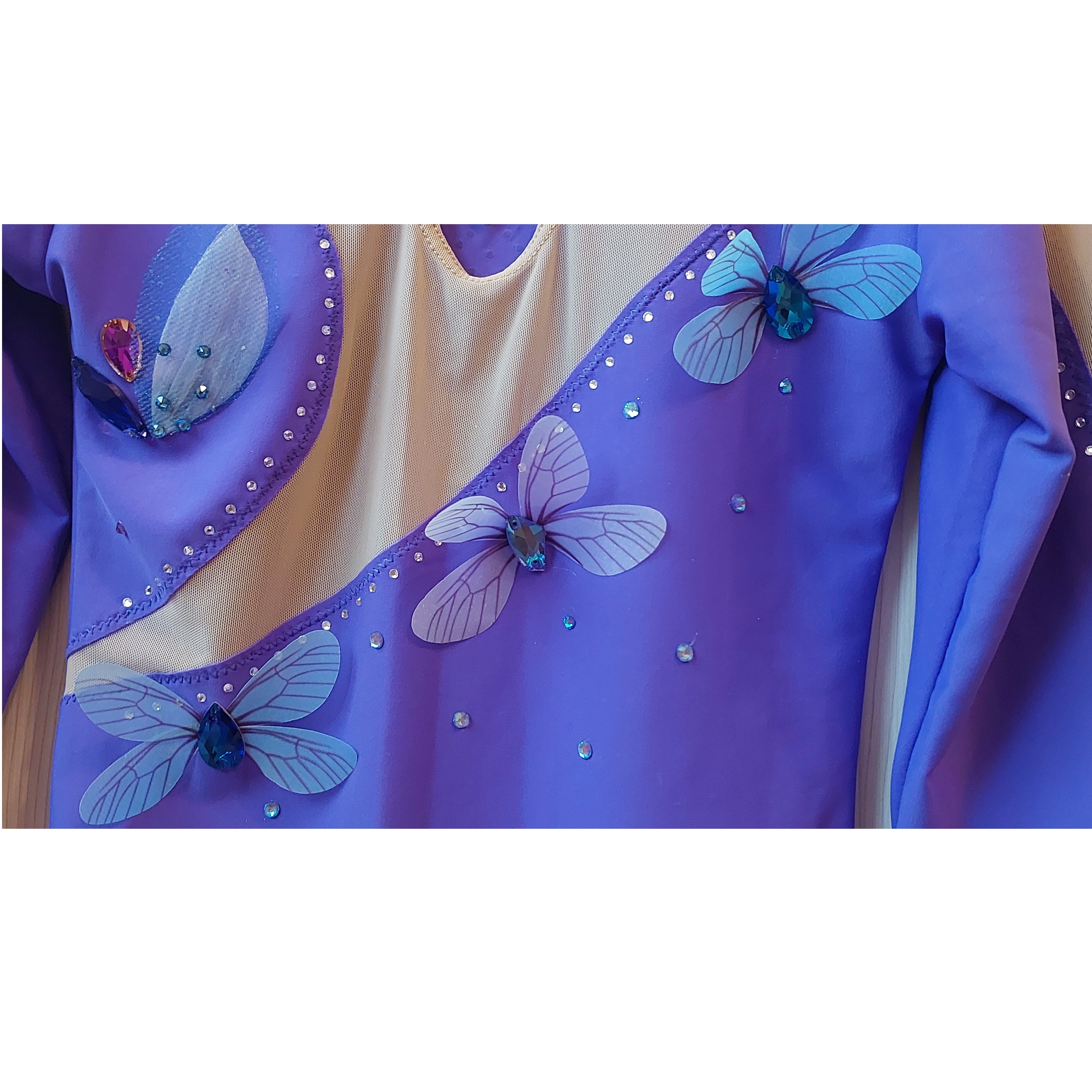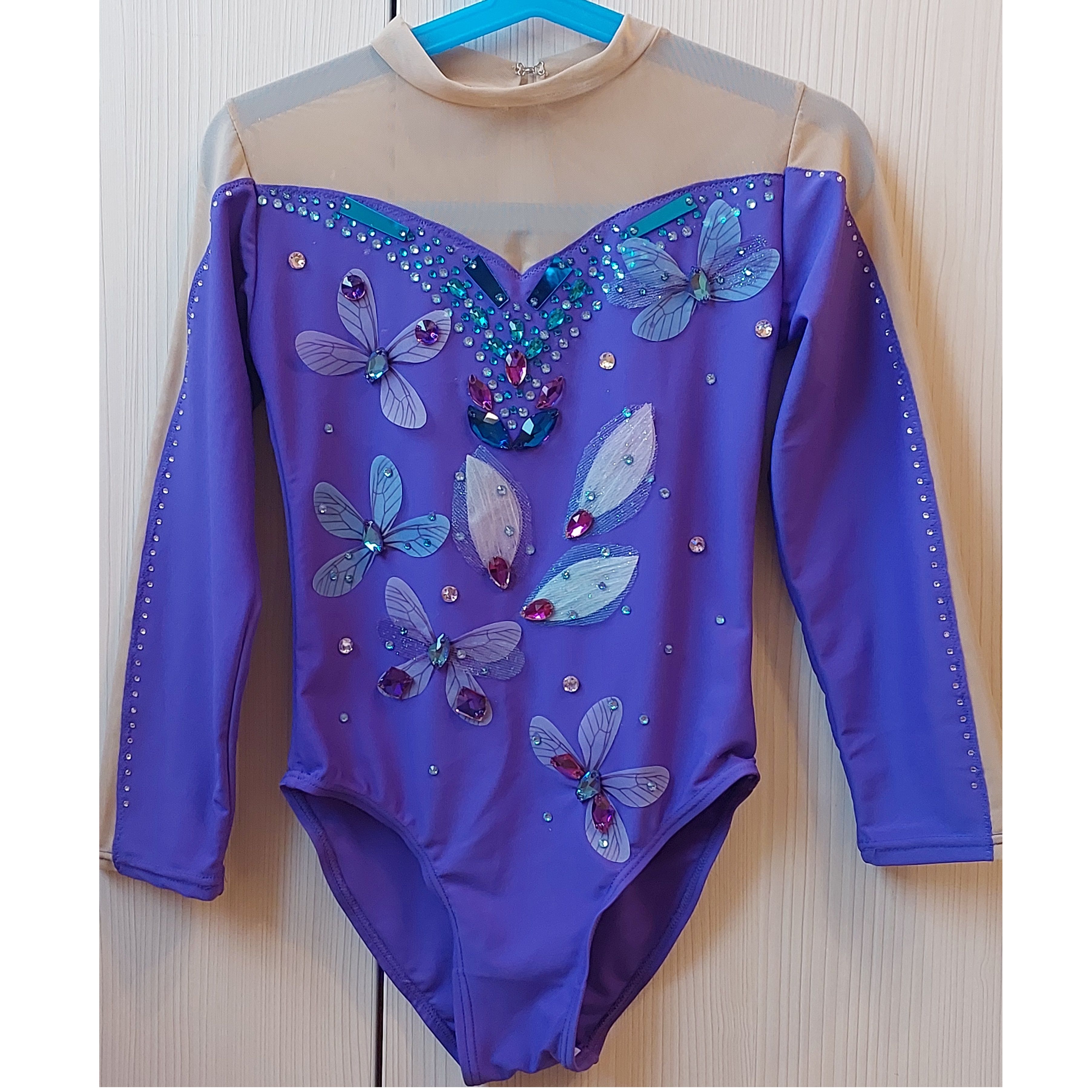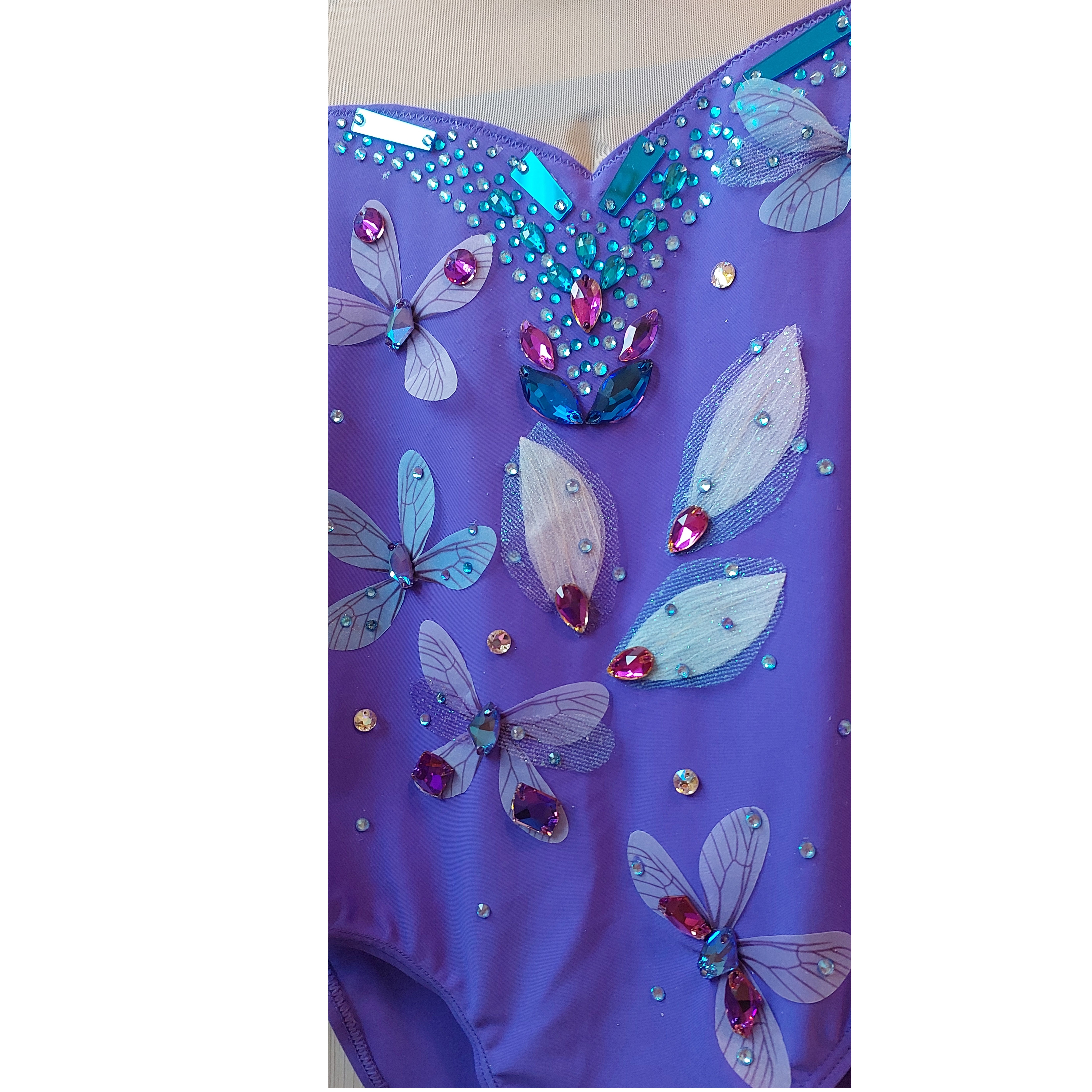 Создавая этот купальник за основу я взяла фиолетовый, пурпурный, голубой и их оттенки. Этот сказочный мир фиолетового зазеркалья дополняют летающие бабочки и нежные лепестки из фатина. В центре композиции символический цветок из кристаллов, как огонь, горящий в самом сердце. Синие зеркала также придают блеск и отражают его. В этом купальнике гимнастка будет легкой, нежной и воздушной словно бабочка из сказочного мира.
