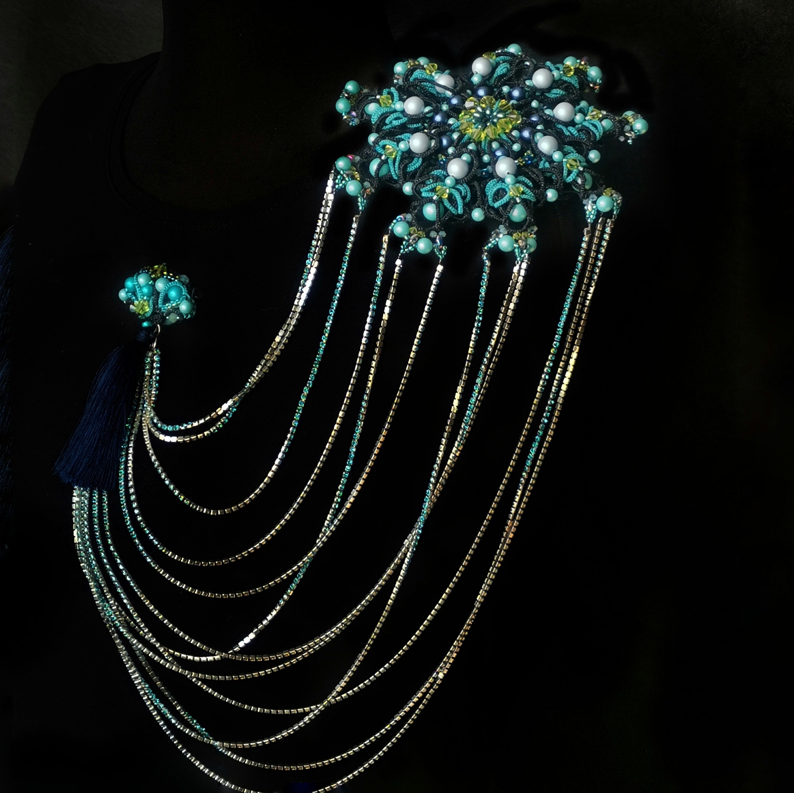 Как быстротечно время!!! Ещё вчера юнкера и кавалергарды блистали на балах, а сегодня остались лишь воспоминания... Остались рассказы о тех незабываемых вечерах, когда они кружились в танце со своими прекрасными дамами. Роскошный блеск изысканных нарядов и дорогие украшения-всё это создавало неповторимую атмосферу, но не только внешняя сторона привлекала внимание. Юнкера и кавалергарды славились своим благородством и честностью, они были настоящими рыцарями, защитниками своих дам. Но приходят новые времена на смену старым и вместе с ним меняются и нравы. Как бы то ни было, балы останутся в нашей памяти как символы эпохи, когда честь и достоинства было превыше всего. Когда я придумывала это конкурсное украшение в голове звучала песня из кинофильма "Звезда пленительного счастья", вспоминался первый бал Наташи Ростовой... Да, изначально, эполет был исключительно мужским украшением,но с течением времени носить его стали и женщины. И сейчас эполет остался нам как память о балах, благородных кавалергардах и их прекрасных дамах.