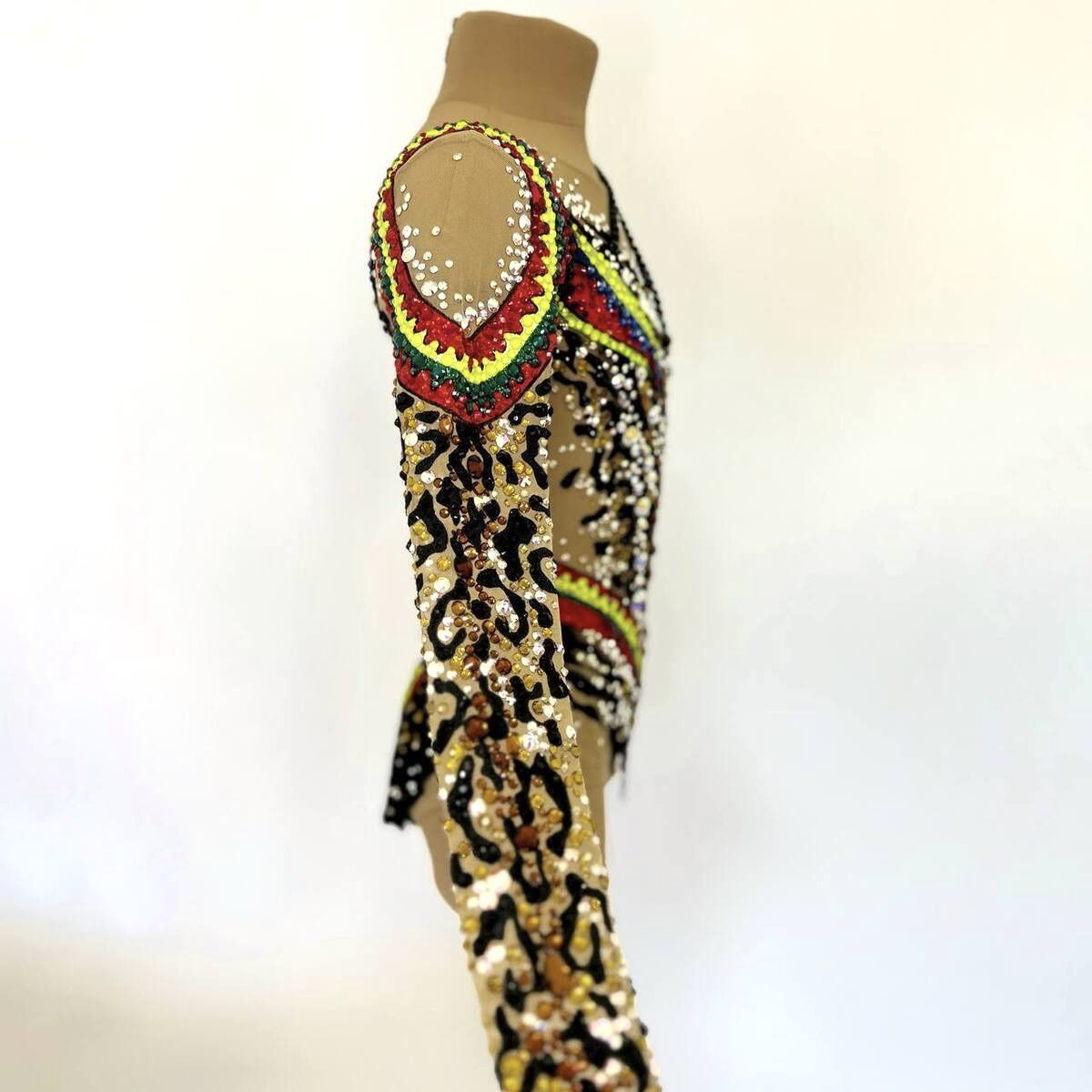 При создании купальника «Предводительница диких амазонок» вдохновились традициями индейцев и силой духа Амазонок. Воинственный и смелый, яркий и дикий. В нем гимнастка выходит на ковер как на бой, чтобы показать себя сильной. Она, как вождь племени, способна вести за собой и вдохновлять на победы. Леопардовый принт напоминает о том, что она быстра и изящна, как свирепая кошка. Яркие акценты в традиционном индейском стиле приковывают внимание к той, кто ничего не боится.