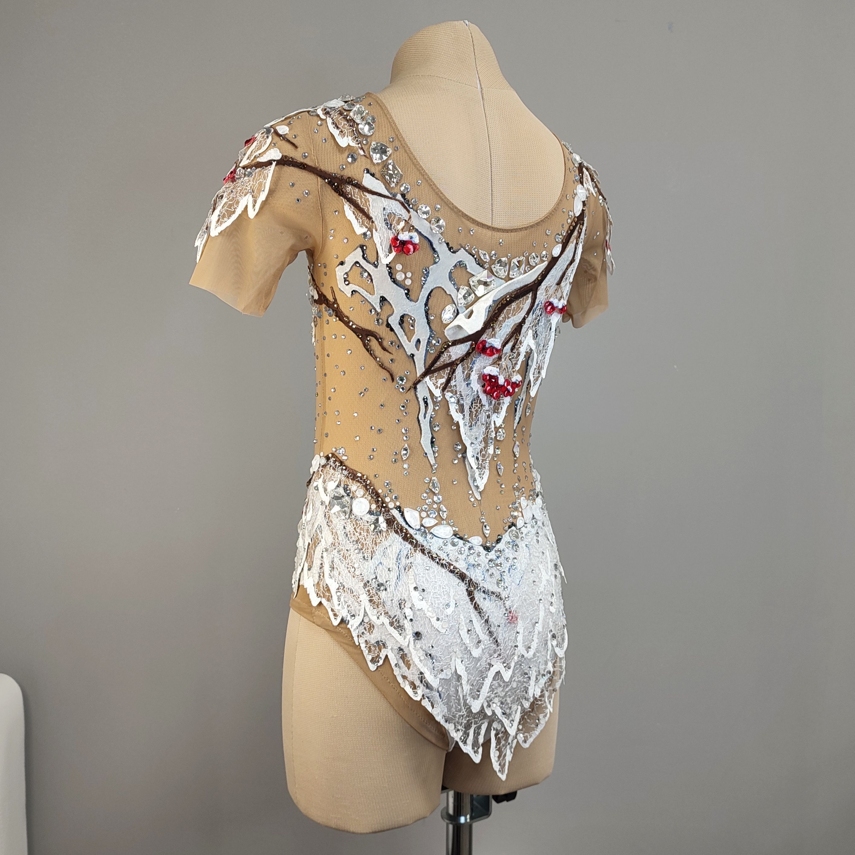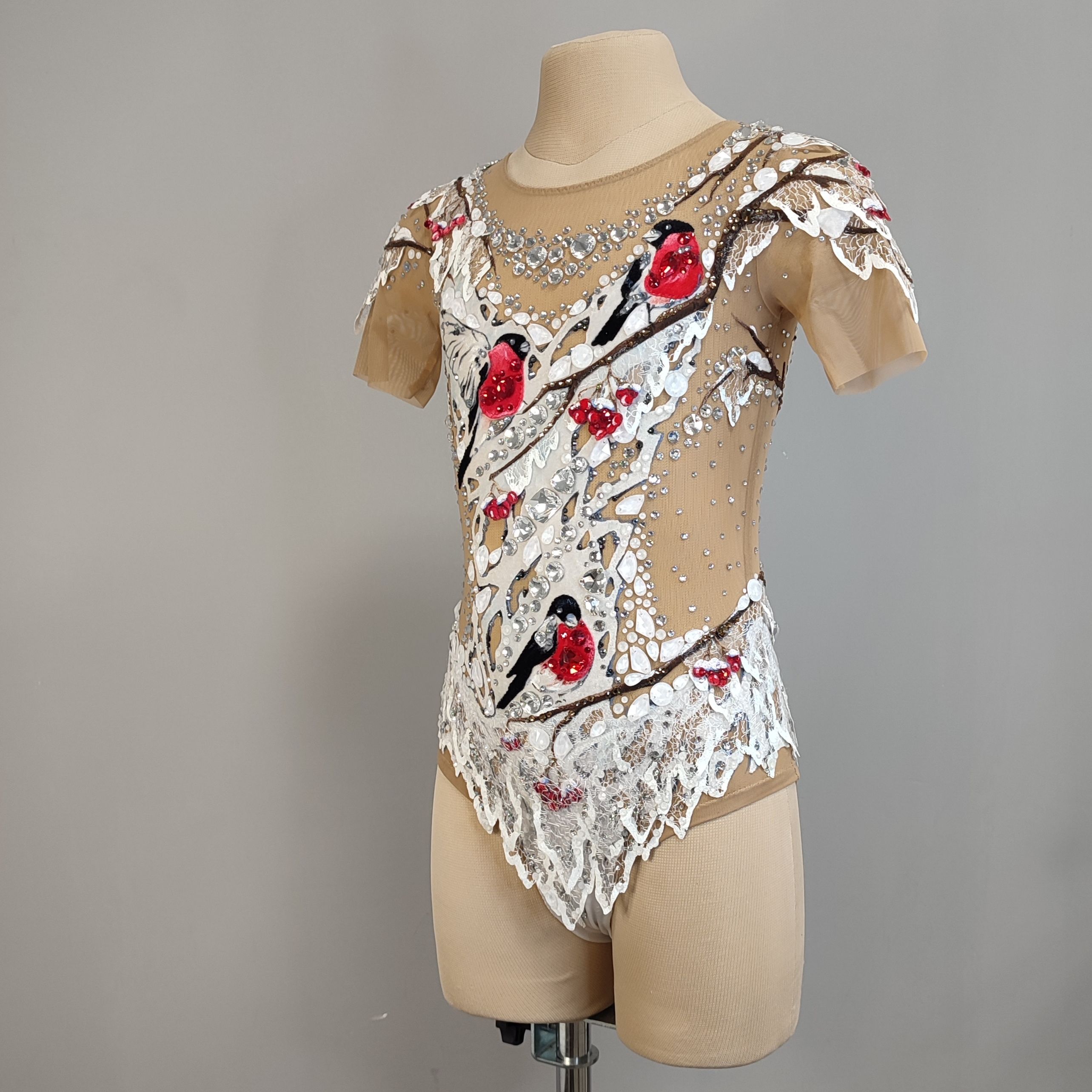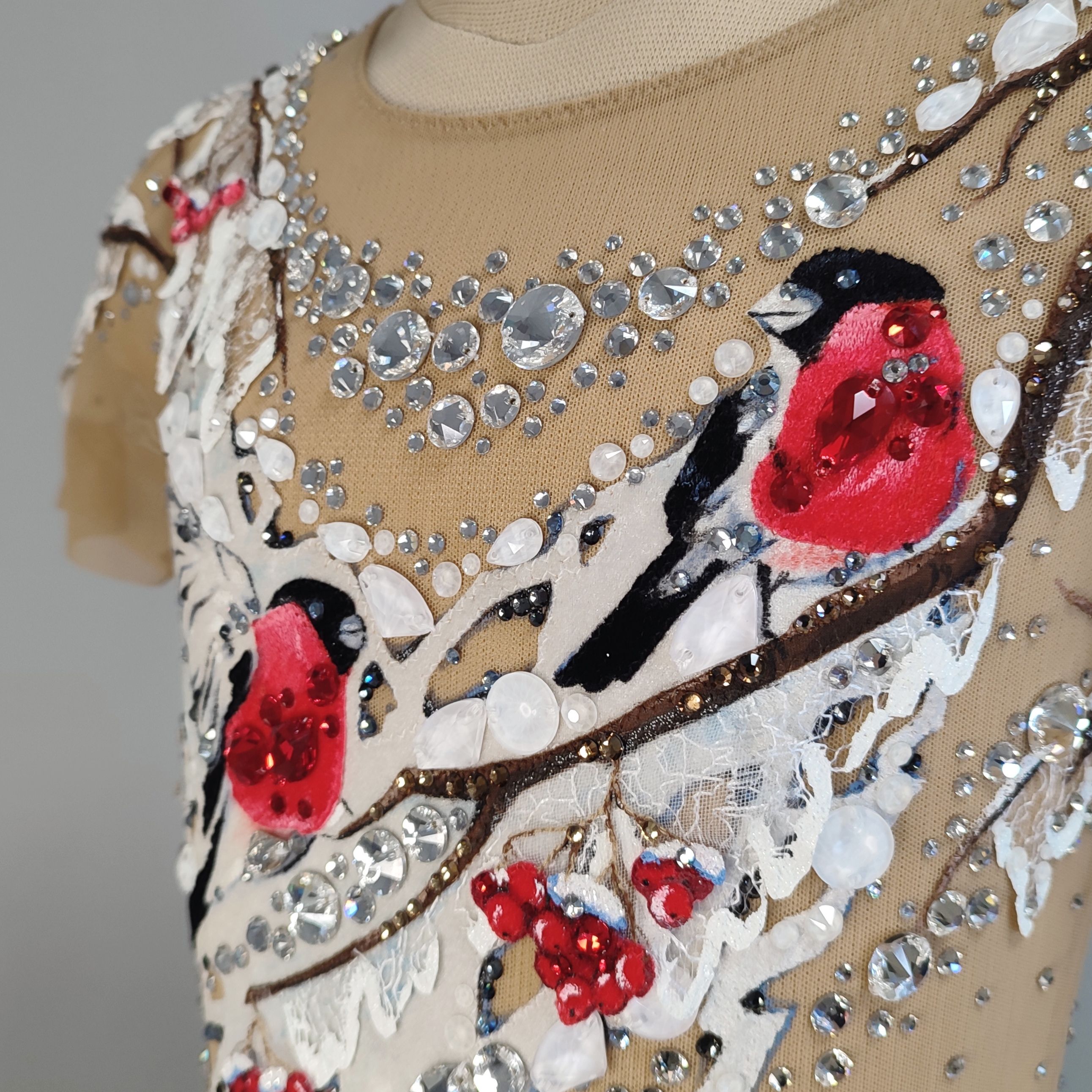 Так и получился этот белоснежный купальник, в центре композиции которого красногрудые птицы. И на каждой грудке вы найдете конкурсные кристаллы.