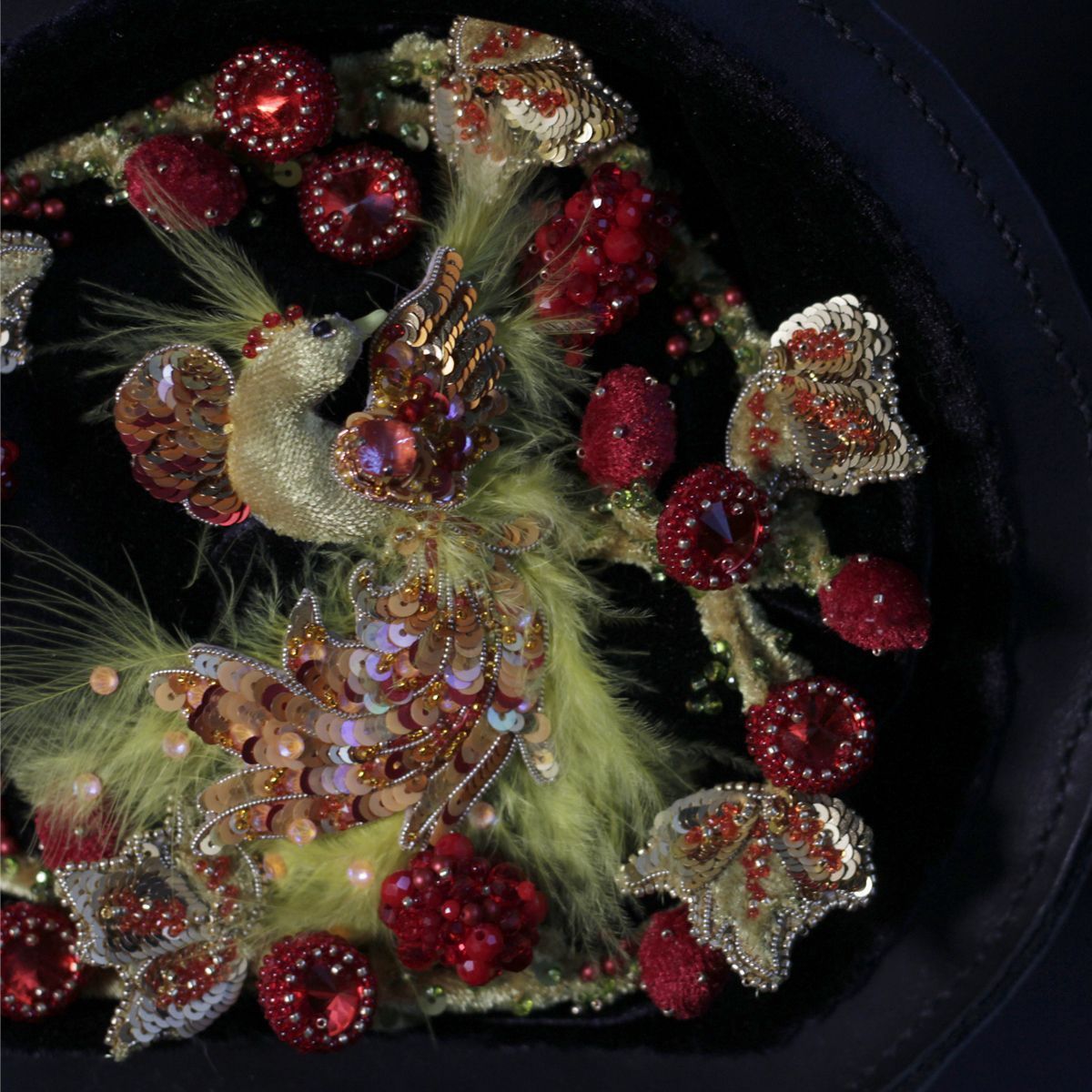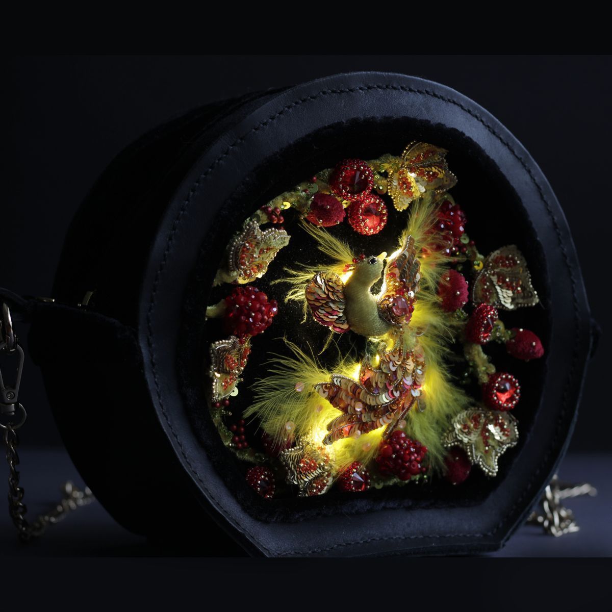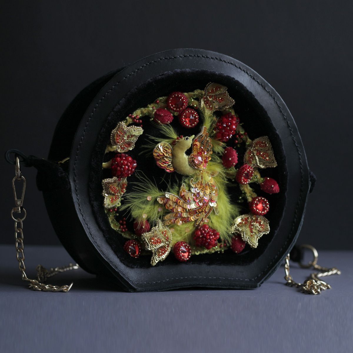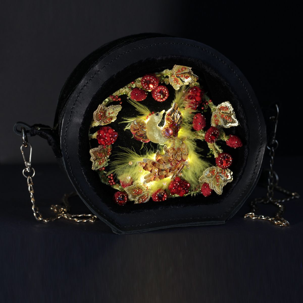 Она на столько прекрасна, разнообразна и интересна, что вдохновила меня на создание сумочки. Я решила не просто повторить плоскую роспись, а придать ей объем, фактурность. На чёрном фоне распустились золотые листья, яркие гроздья ягод. А в центре композиции разместилась жар-птица. Эта птица как символ истинного огня, который исходит изнутри. Символ силы и мощи. Вся солнечная энергия воплощена в этой птице. Она просто обязана сиять и пылать, что я и передала в сумочке с помощью цвета, фактуры. И конечно, же она по-настоящему светится. Сама сумочка сшита полностью вручную из натуральной кожи и бархата.