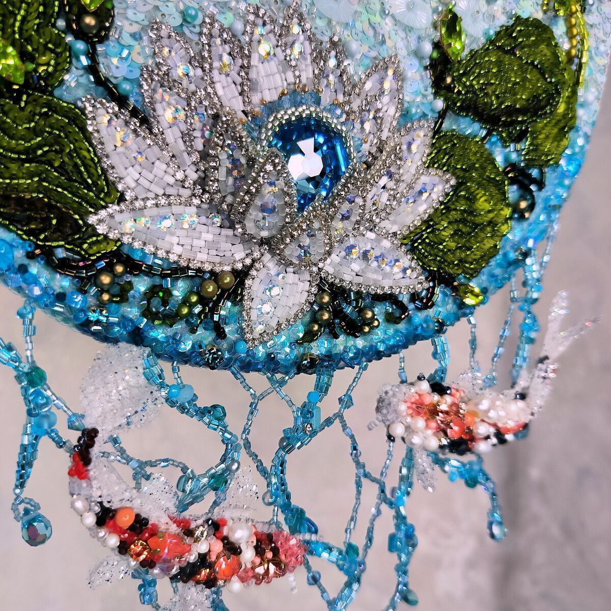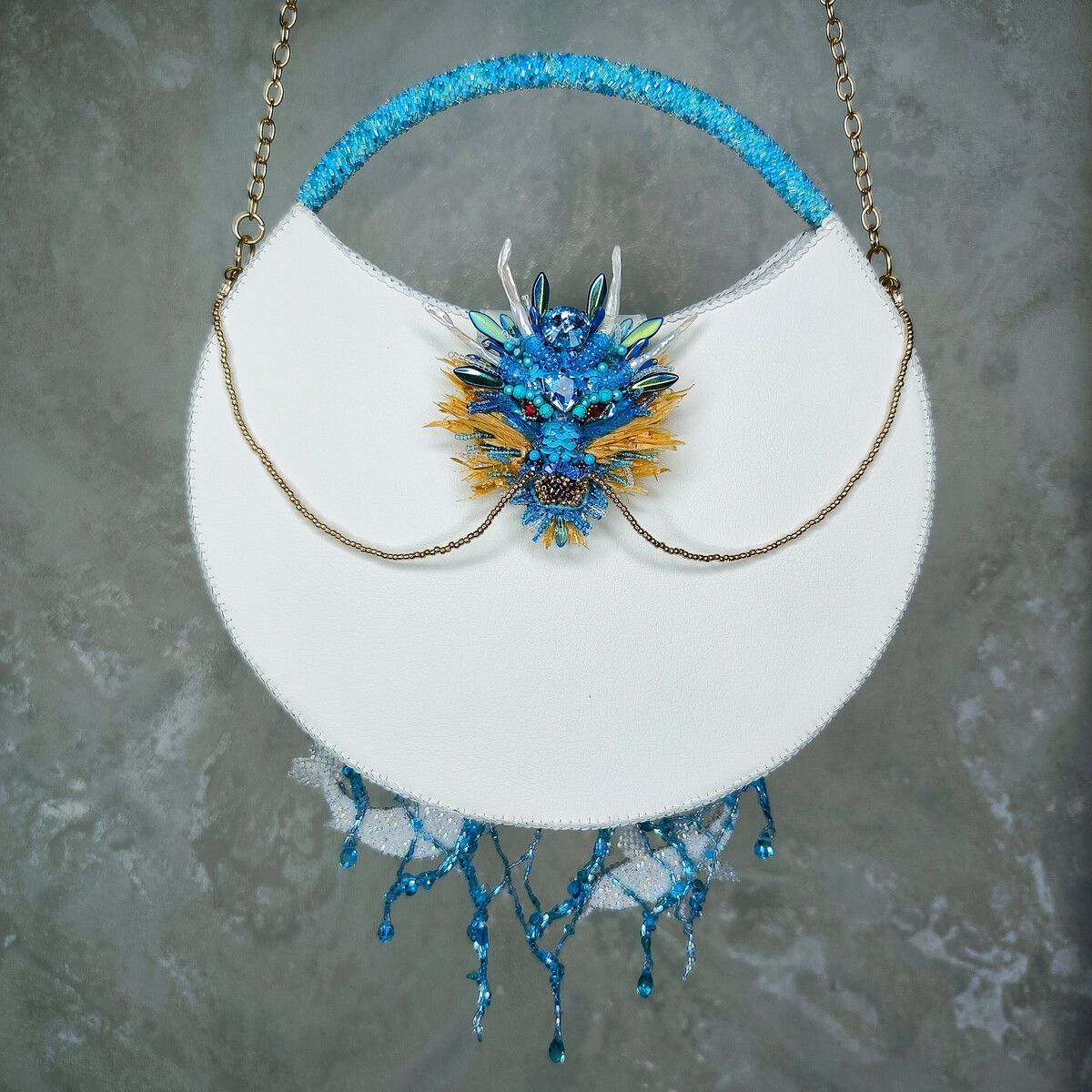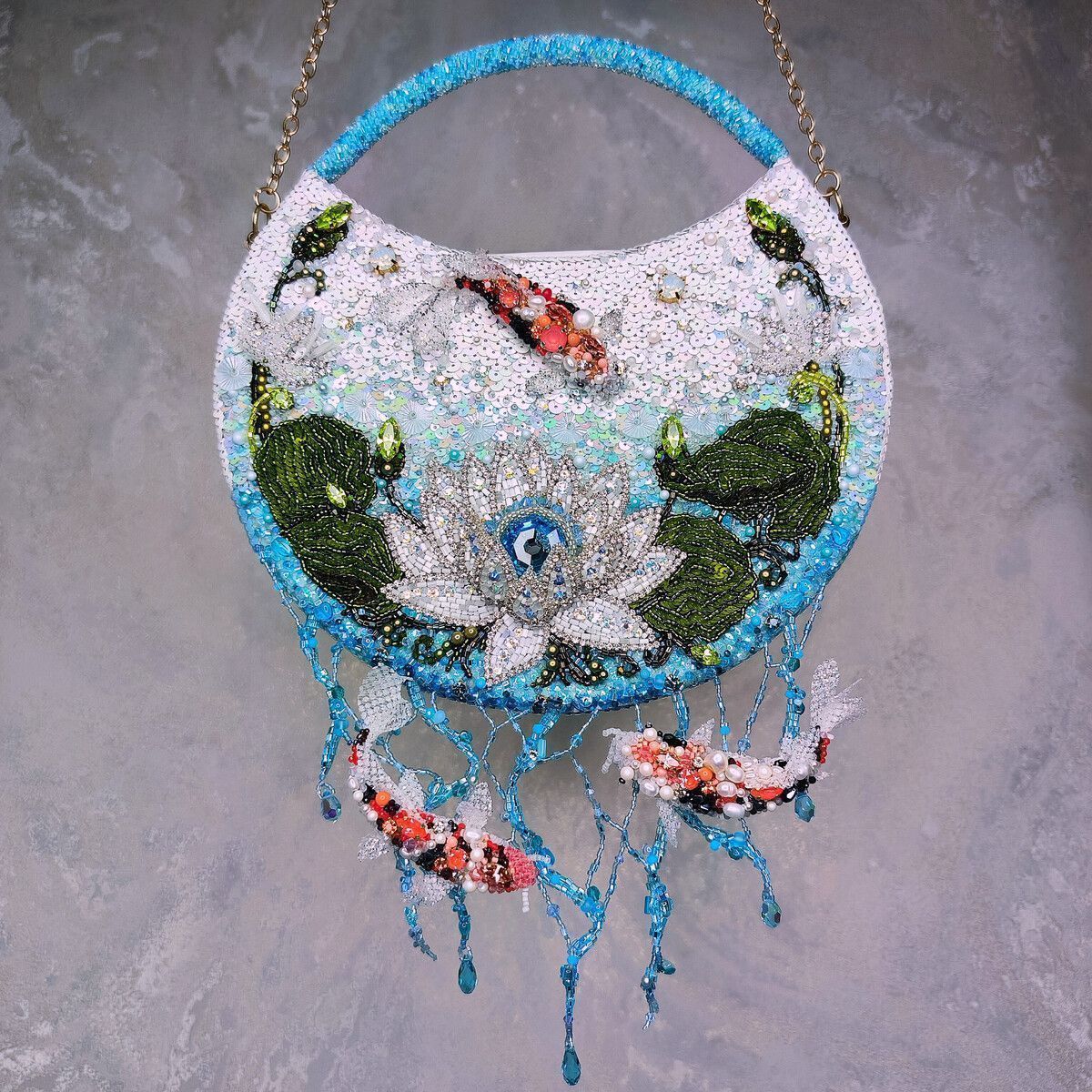 Старинная китайская легенда гласит о Карпе, преодолевающем бурные воды реки. Его упорство было столь велико, что, двигаясь против течения, карп смог перепрыгнуть водопад ("Драконьи врата") и превратиться в Дракона. С тех пор карп стал символом стойкости, выносливости, целеустремленности и упорства, а изображение карпа помогает исполнить желания, добиться успеха. Лотос тоже неслучайная деталь сумки – в китайской культуре это - символ перемен ,трансформации, жизни и чистоты.  В то время как объемный Дракон на обратной стороне сумки, которого можно носить отдельно, как брошь, символизирует плодородие, жизнь, свет, силу и мудрость. Смысл этой легенды прост и красив. Преодолевай себя, обстоятельства. Следуй за своей мечтой и никогда не сдавайся. Лишь тогда ты сможешь создать лучший вариант своего будущего.