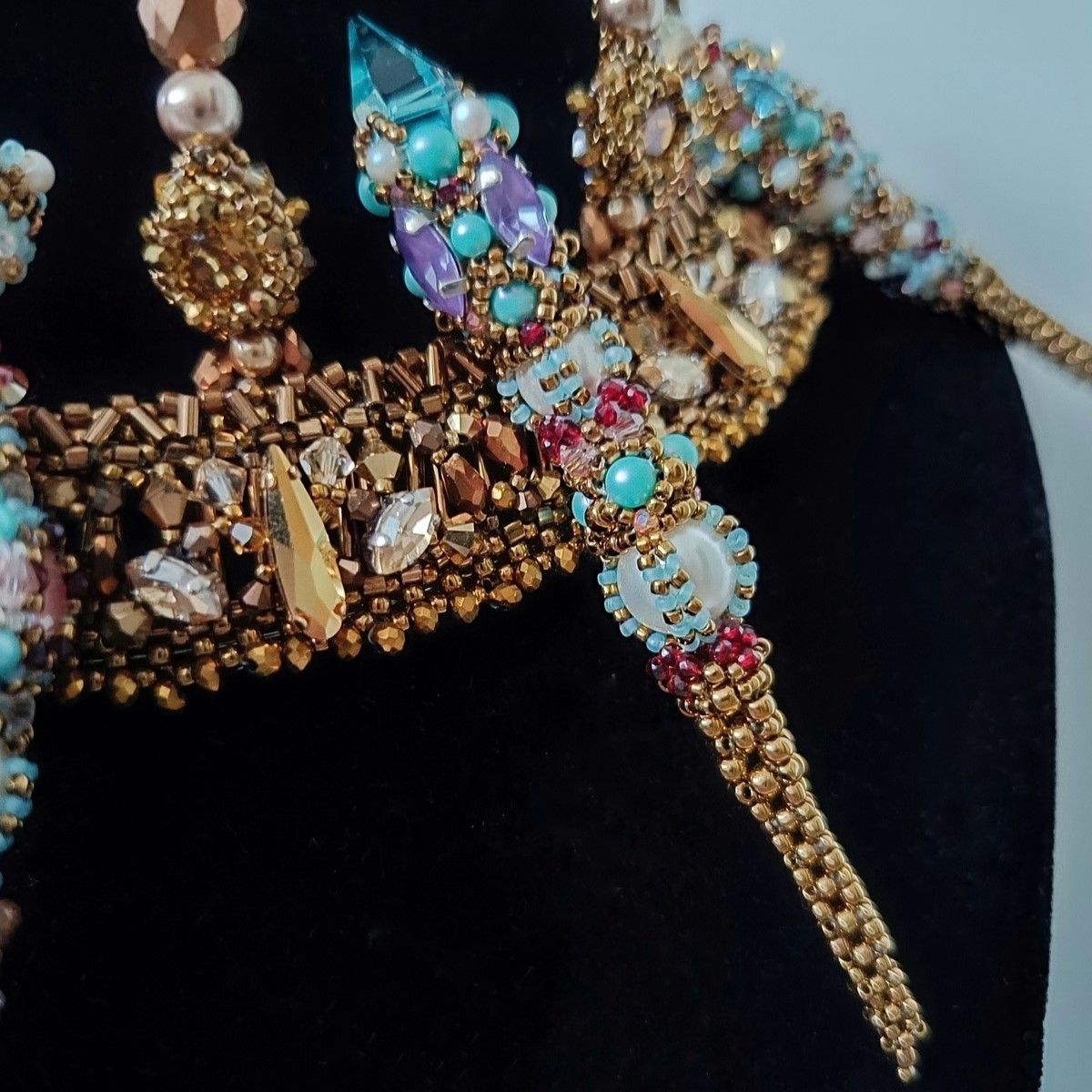 Моя работа посвящена старинному традиционному способу рукоделия-прядению, круглая форма колье со стойками, соединяющими большой круг и малый, символизируют колесо прялки, на котором закреплены разноцветные веретëна. При создании этого колье, я вдохновилась старинными веретенами, найденными в деревне при разборе дома, принадлежащего многие года нашей семье. Разноцветные, красивые, резные, длинные и короткие, на некоторых ещё была сохранена намотанная шерстяная нить. Когда берёшь в руки эти предметы старины, сразу представляешь как твои прабабушки сидели у окна, пряли, пели песни, отдыхая от тяжёлого деревенского быта.