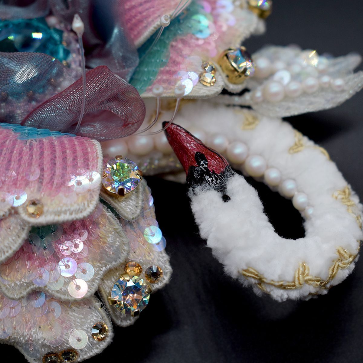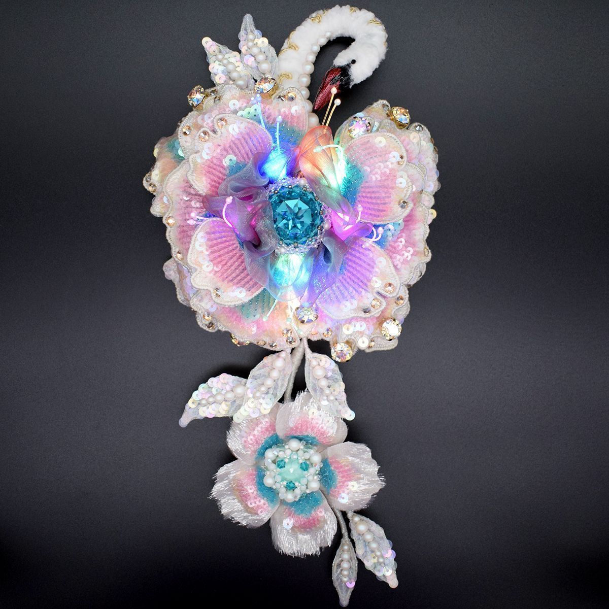 Она воплощение женственности и изящества, очаровательная и нежная, словно лебедь. Её образ завершён восхитительным украшением на поясе платья, чуть ниже талии— брошь представленная в форме флорального антропоморфа. Изящная шея элегантного лебедя плавно перетекает в тело фантастического цветка, создавая гармонию двух миров. В центре величественный кристалл Swarovski, создающий игру граней и украшающий сердечную точку сказочного цветка, усыпанного искрящимися стразами. В завершении нежная ветвь с бутоном и листьями, вышитыми аккуратными рядами белого жемчуга Swarovski, усиливающего ощущение нежности и женственности образа