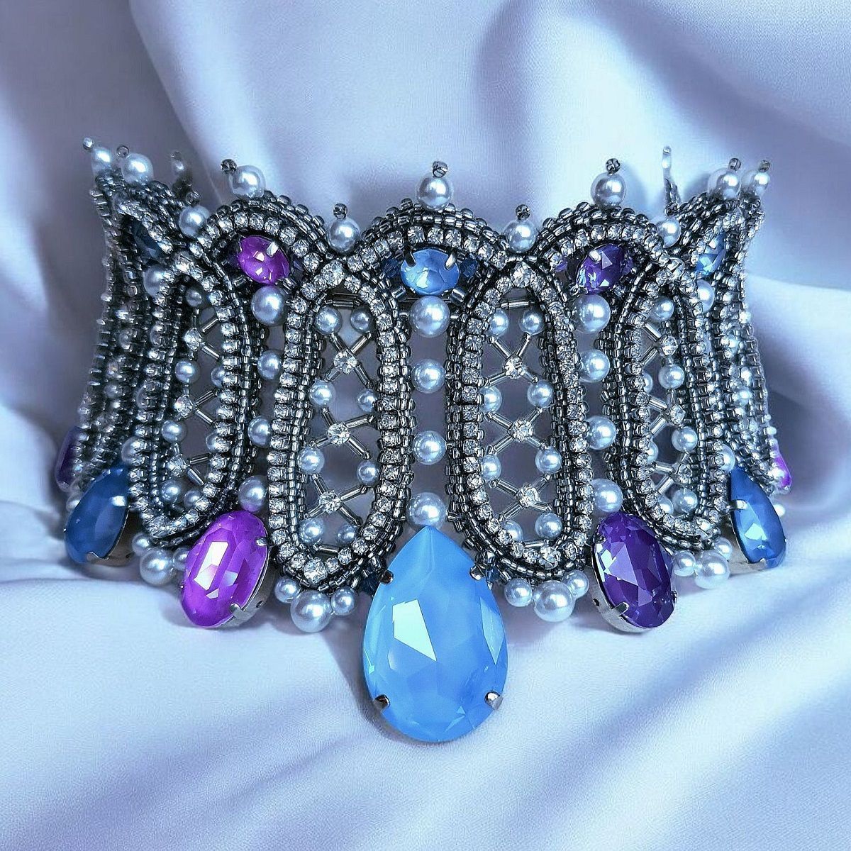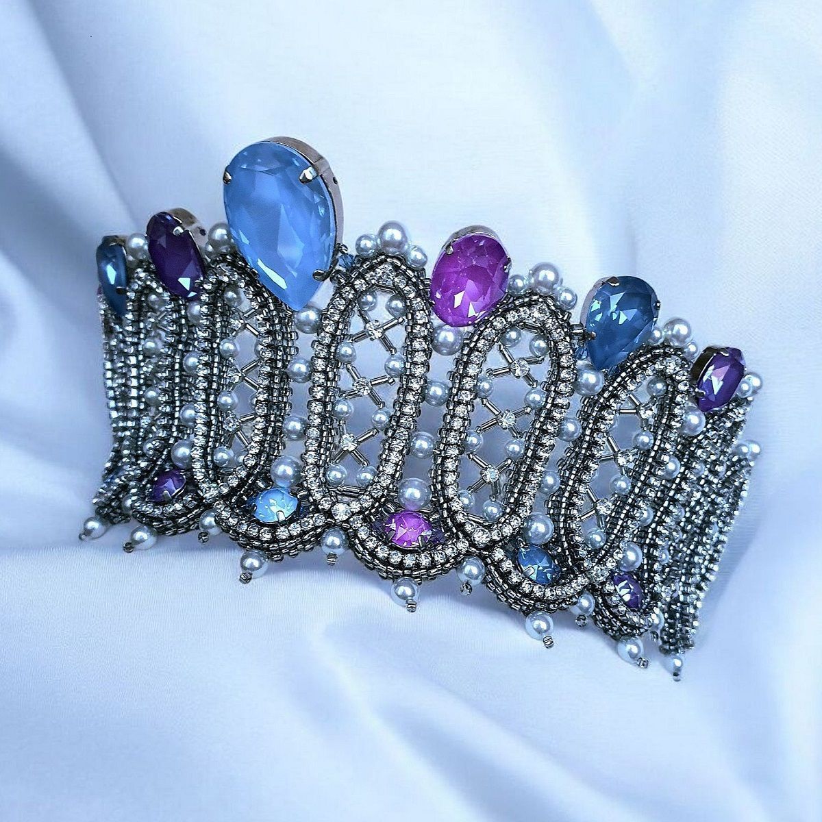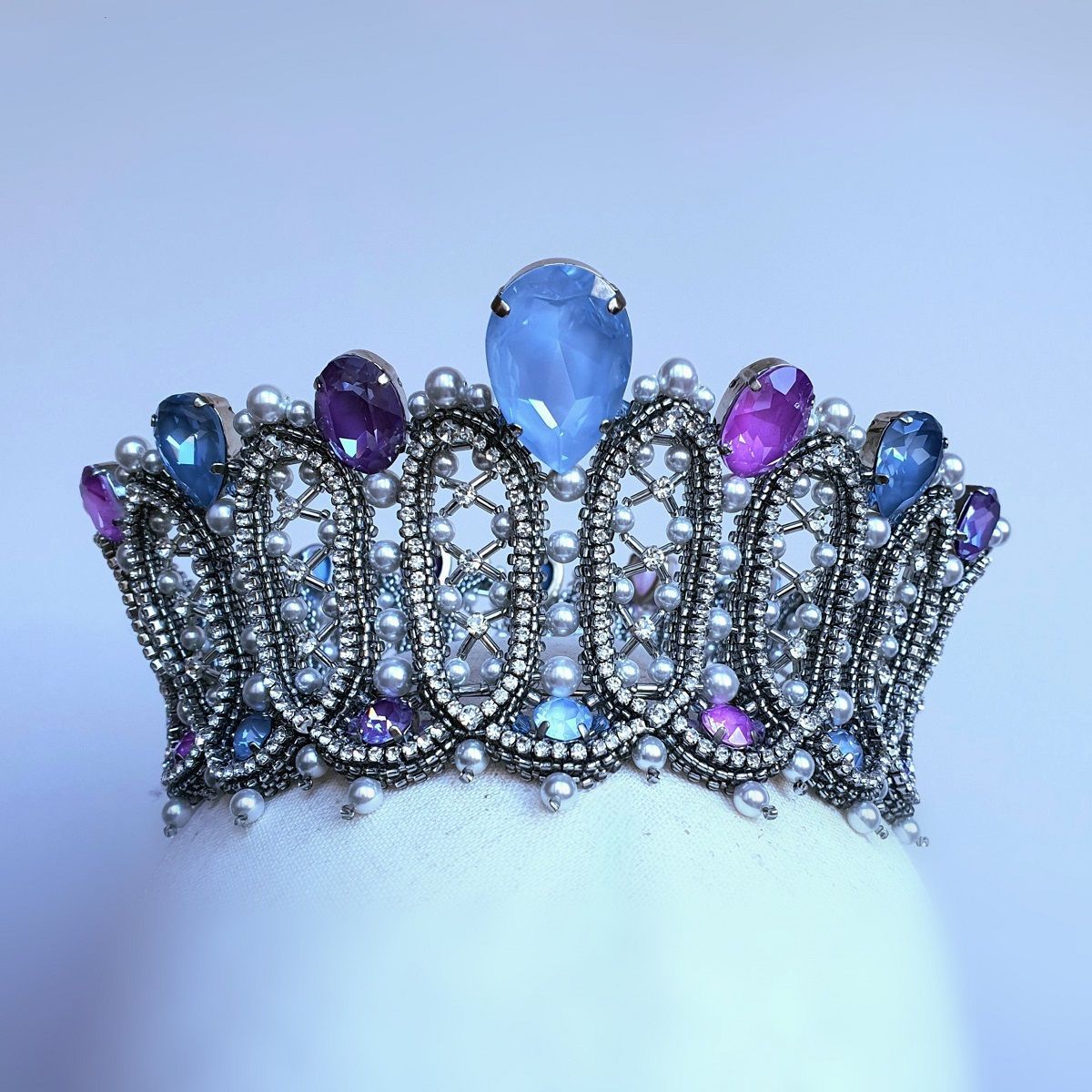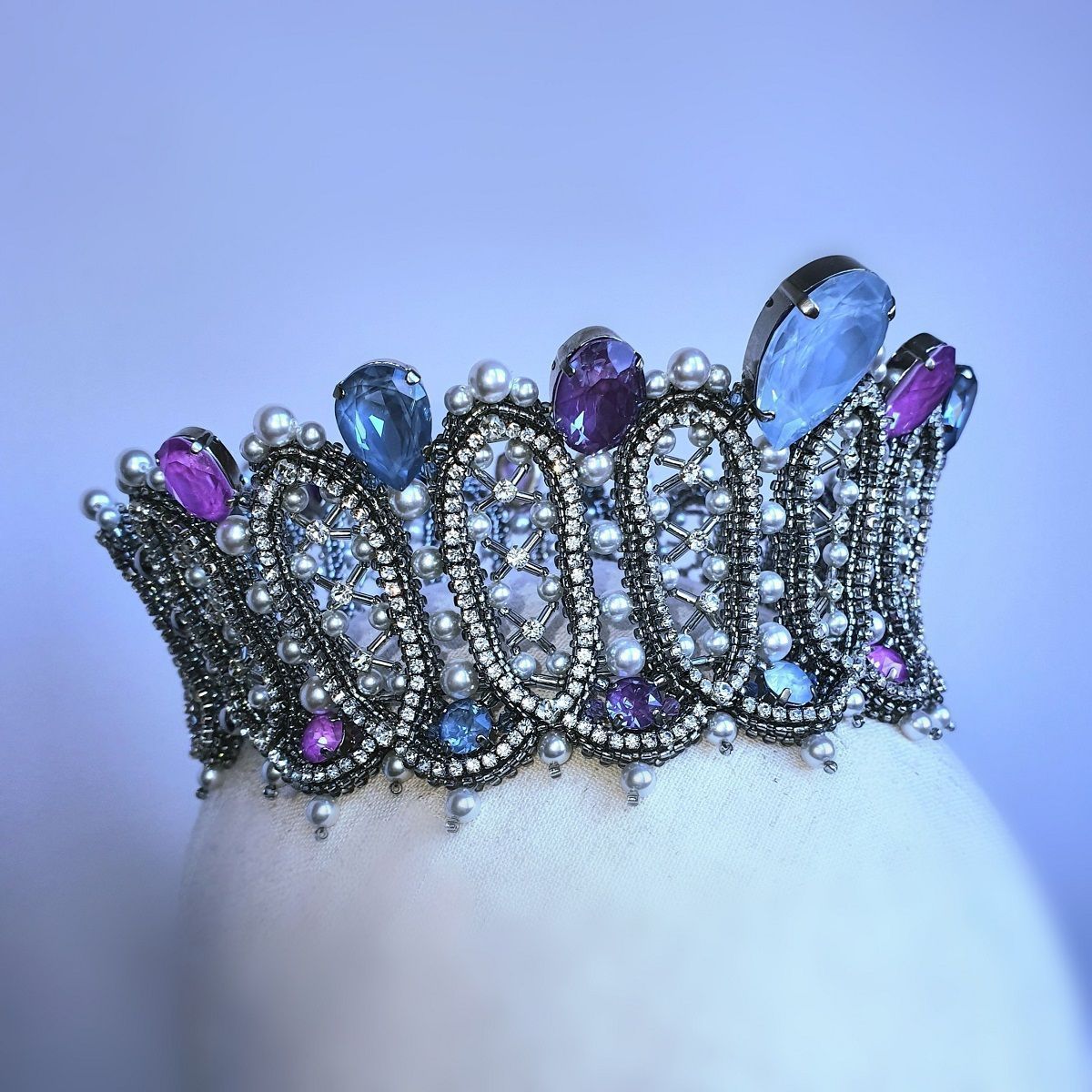 Вдохновением к моей конкурсной работе послужила эпоха барокко. Именно в это время становятся популярными корсеты, жемчуг и кружево изобилуют в нарядах европейских модниц. А из архитектуры того периода мной были позаимствованы эллипсоидные формы оконных проемов и потолков. Все эти атрибуты и элементы стиля барокко мне захотелось отразить в работе. Акцентами выступают кристаллы с эффектами электрик и Ignite в сиренево-голубой гамме.