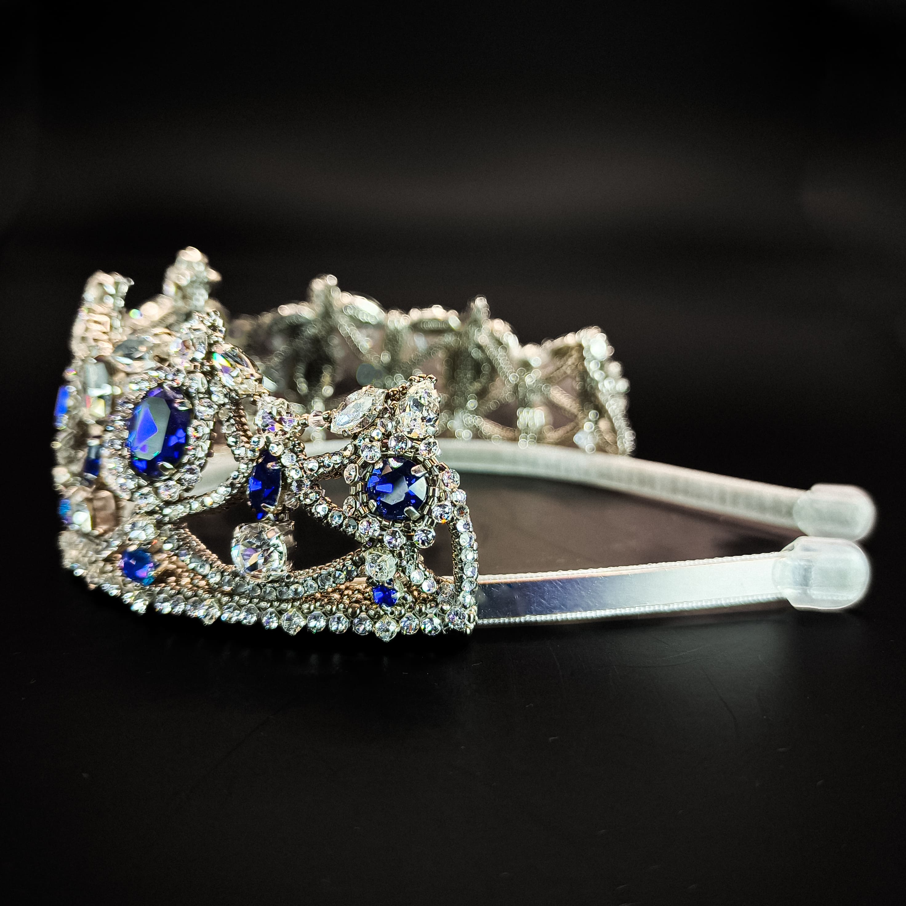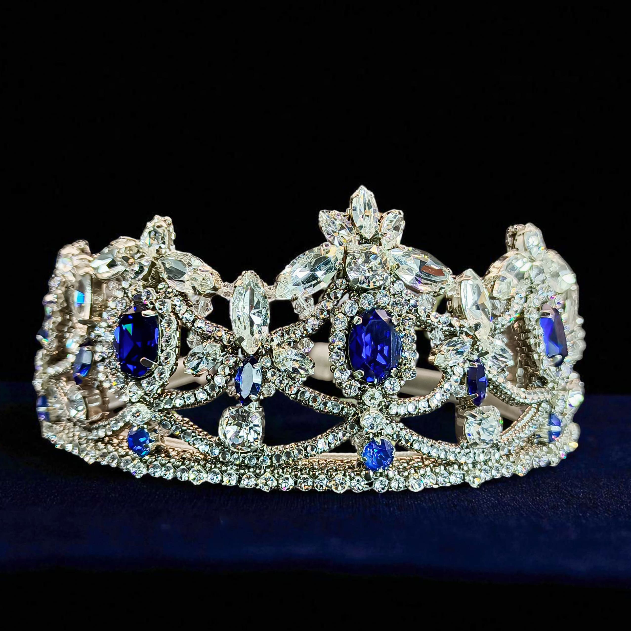 Эта утончённая тиара создана для тех, кто ценит аристократическую роскошь и изящество. Глубокие сапфировые оттенки, напоминающие лазурное небо над Веной, сияют в обрамлении кристаллов, словно отражение тысяч огней в залах императорского дворца.
