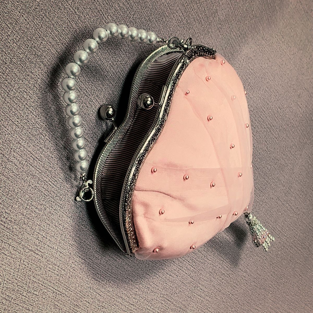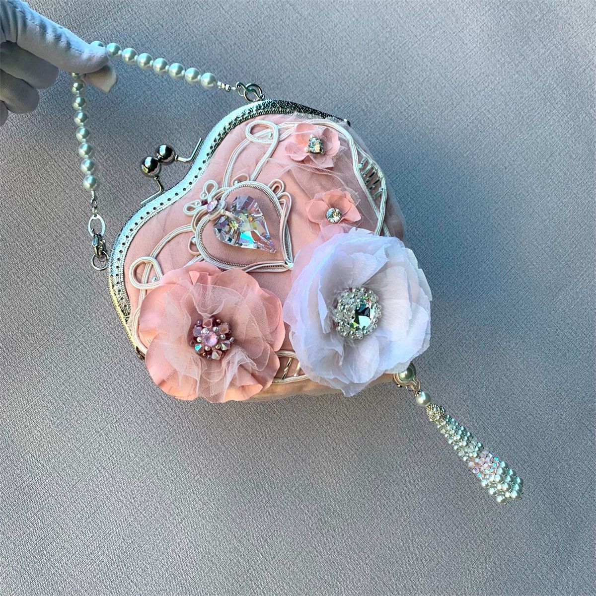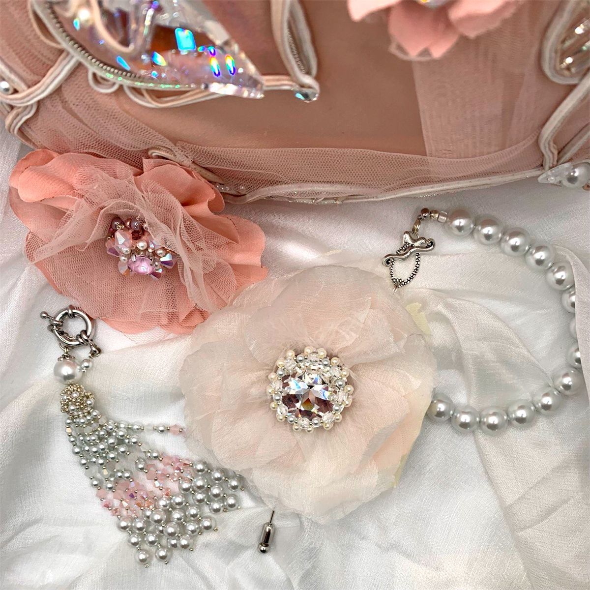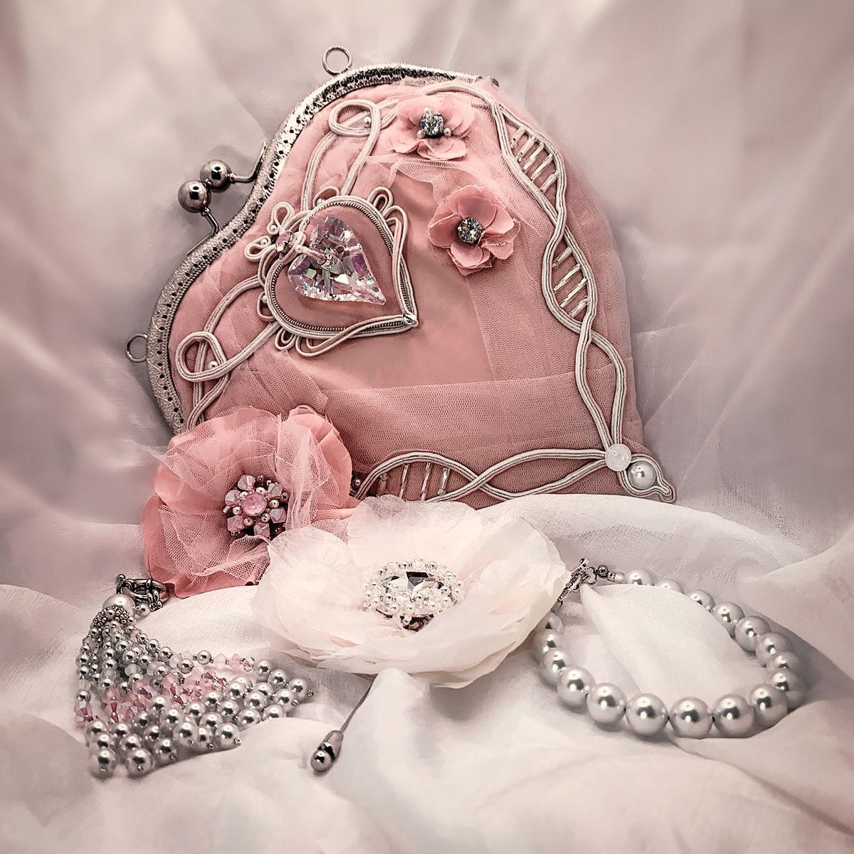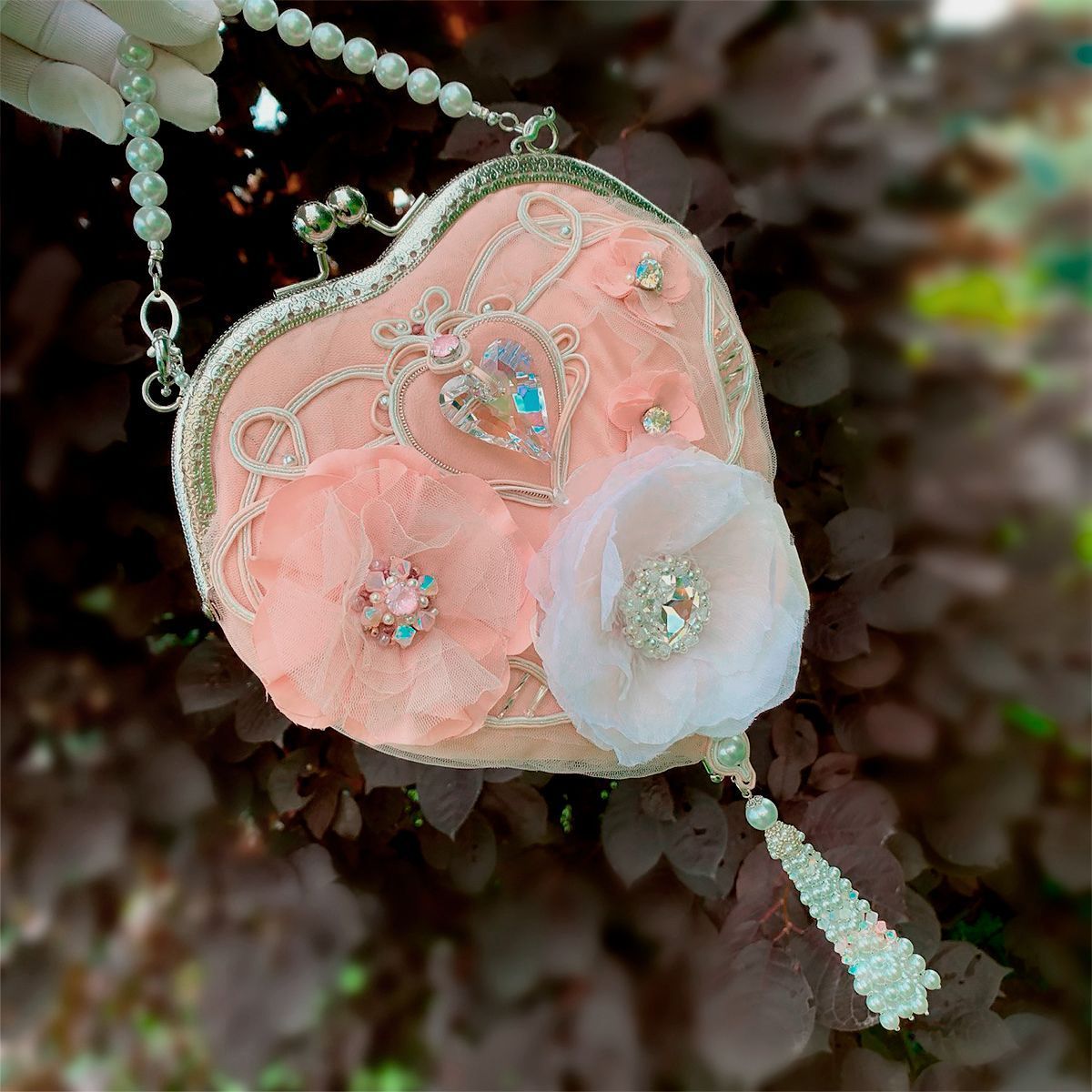 Ручка сумочки превращается в жемчужный браслет. Белый цветок становится брошью-булавкой. Розовый цветок — брошь-клипса. Жемчужная кисточка отстёгивается, становясь кулоном-подвеской.